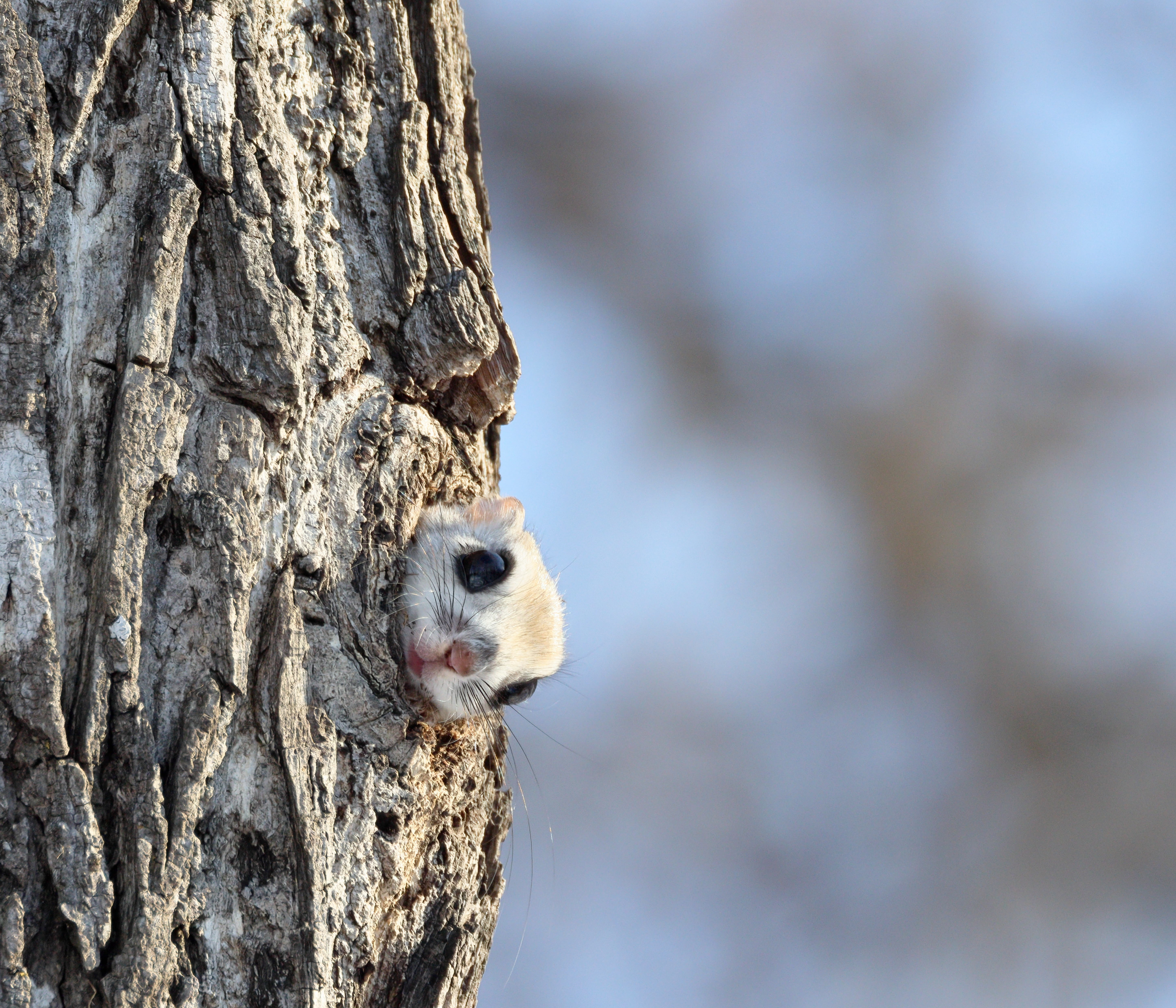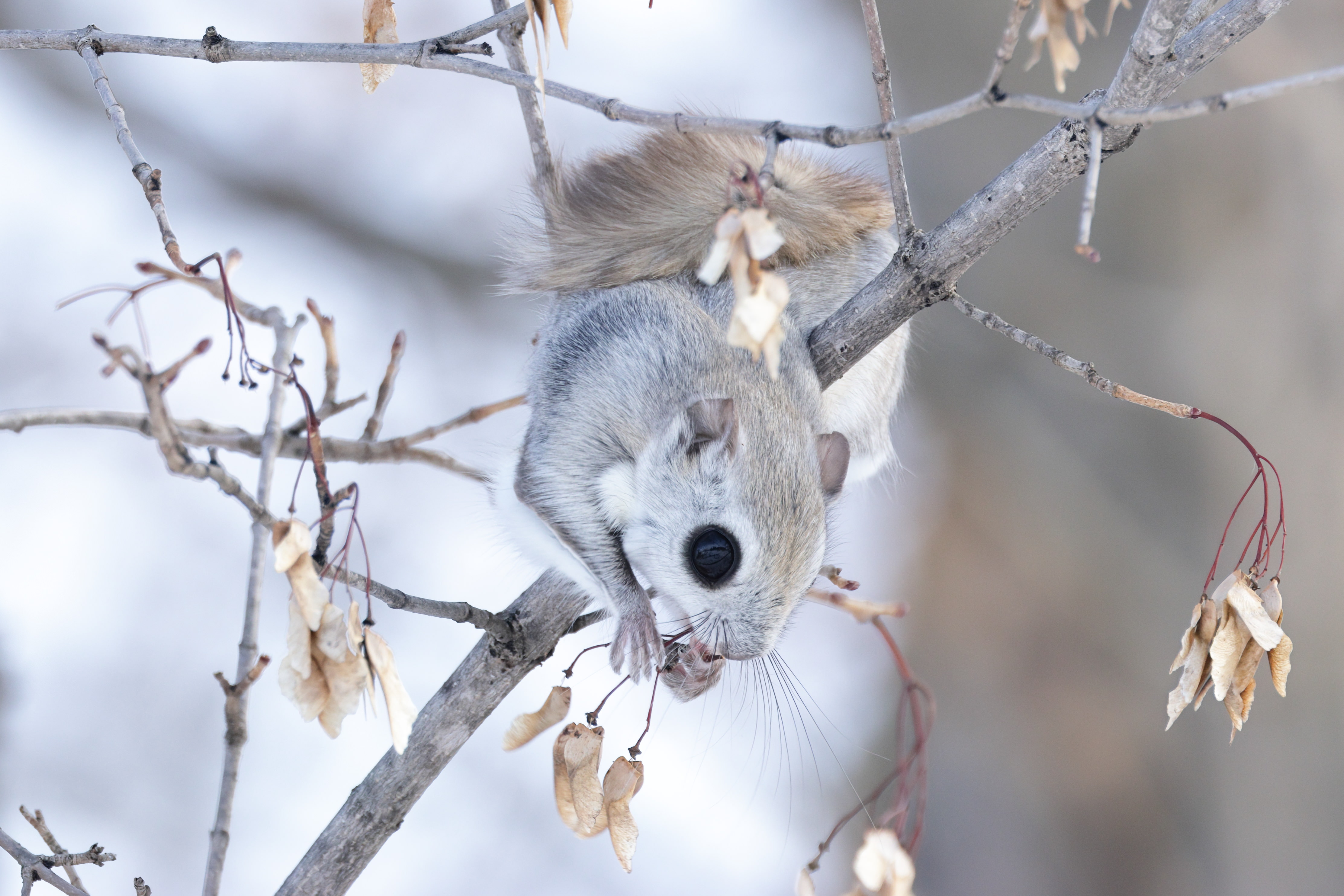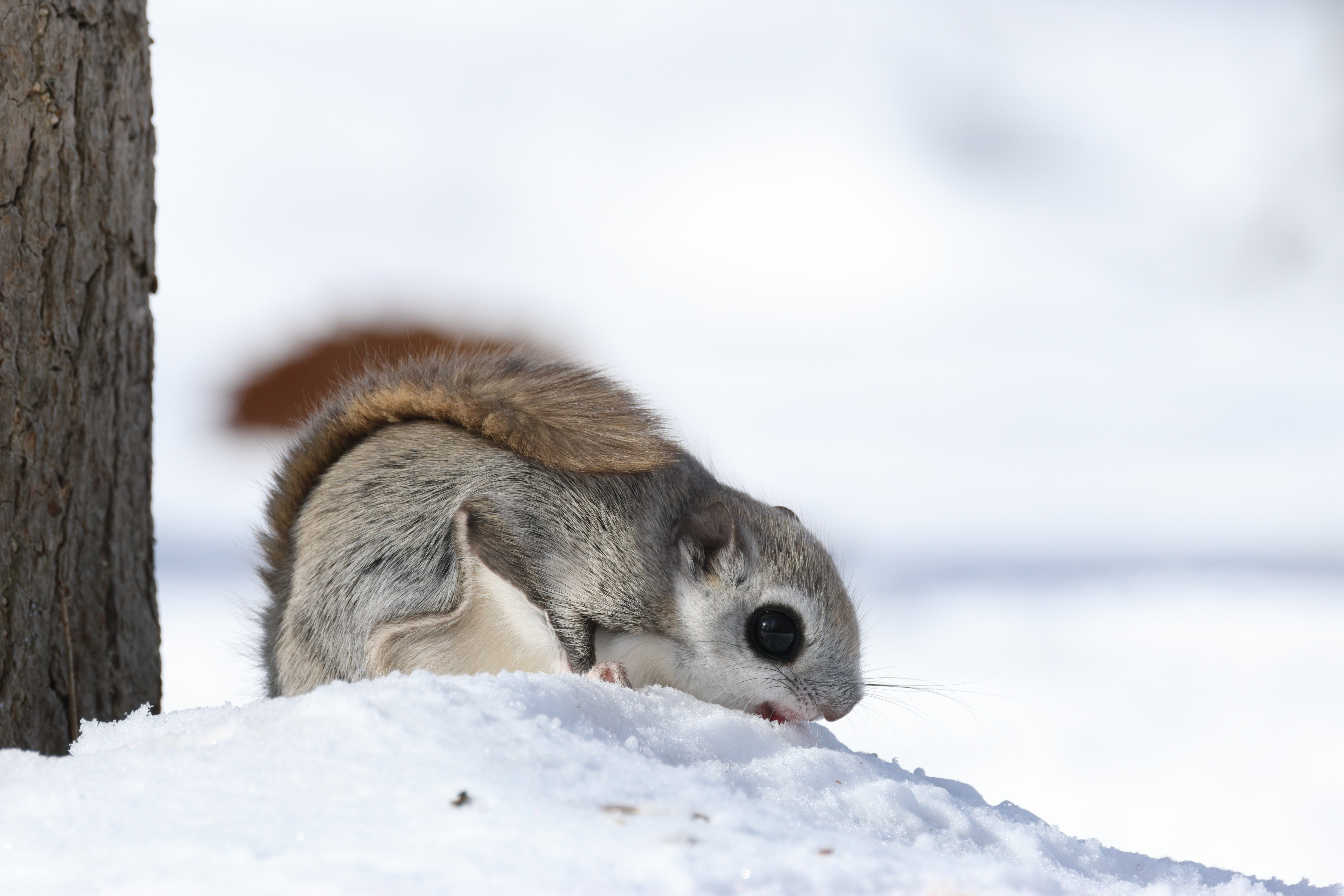地上に降りてきて雪をなめ、水分補給するエゾモモンガ