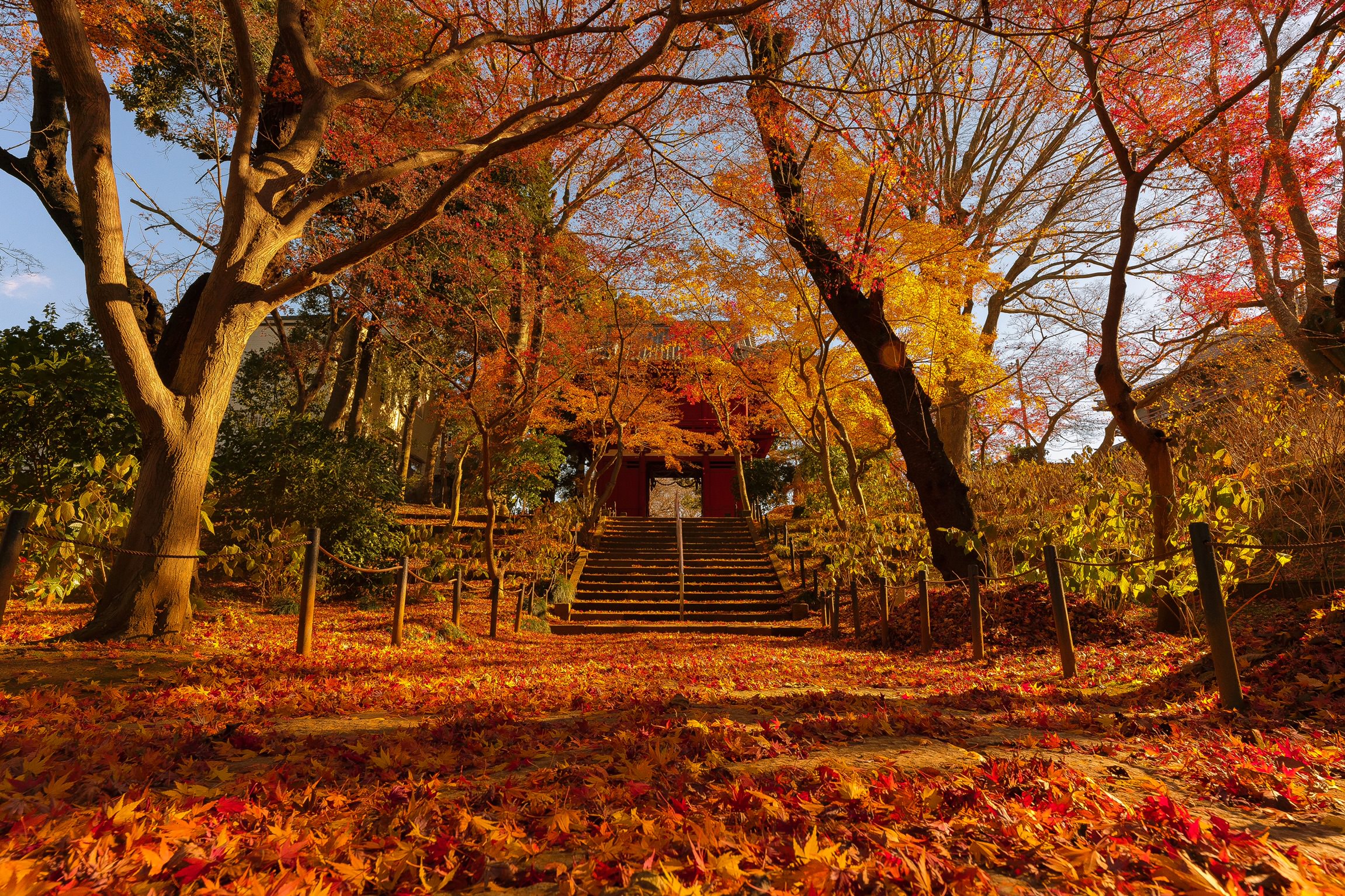 風情のあるお寺の門、色鮮やかな紅葉、この景色は日本の秋を感じさせてくれます。