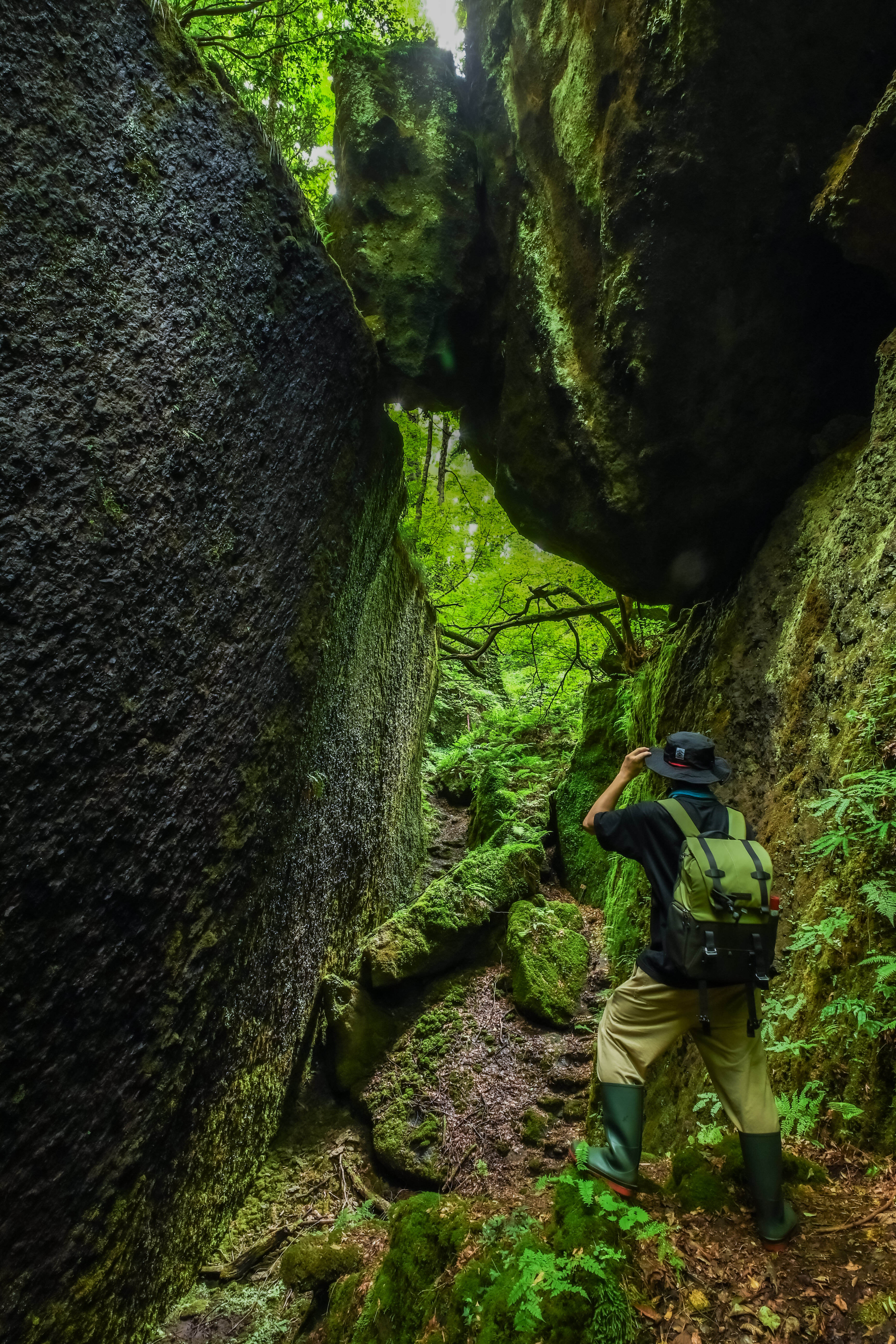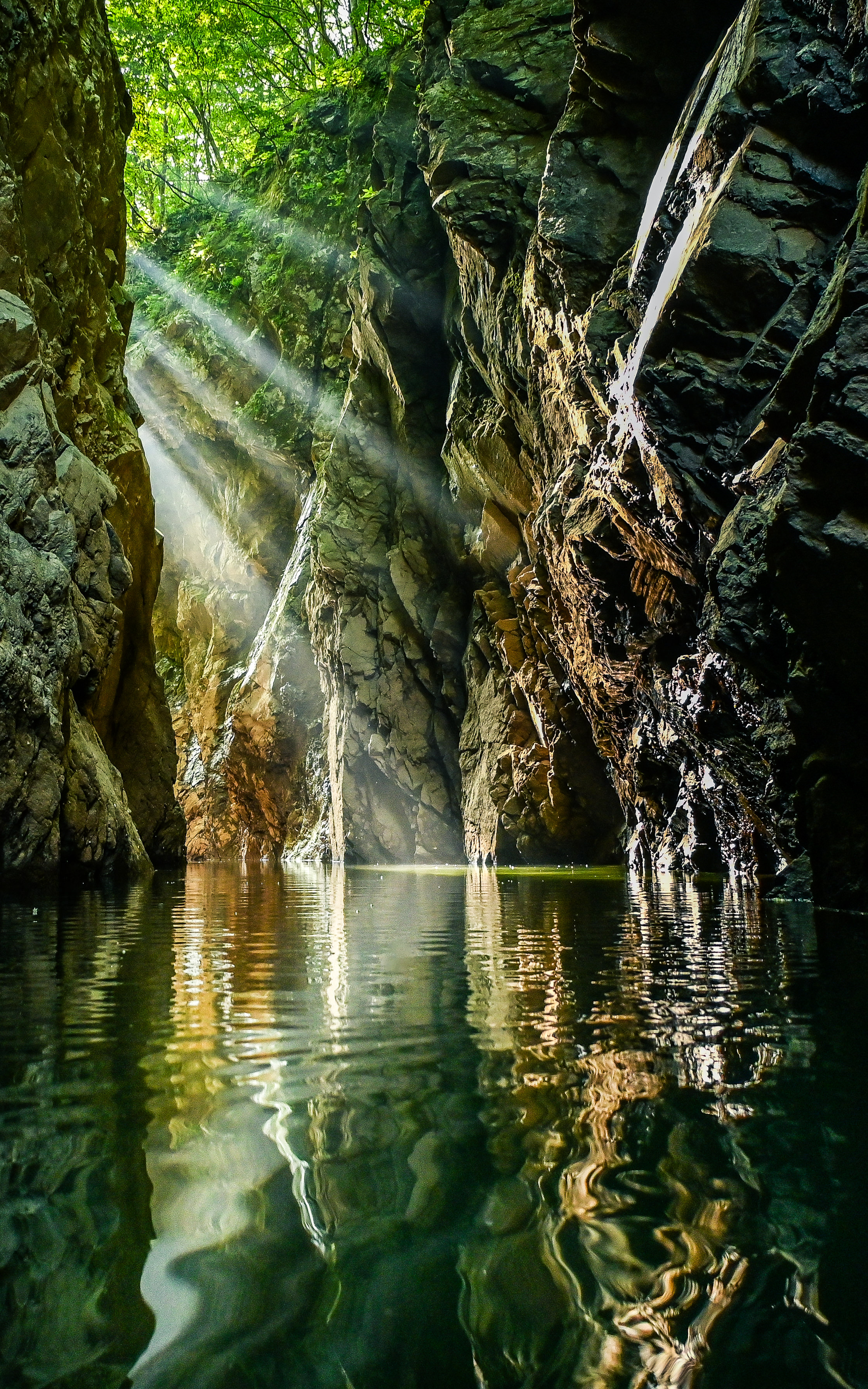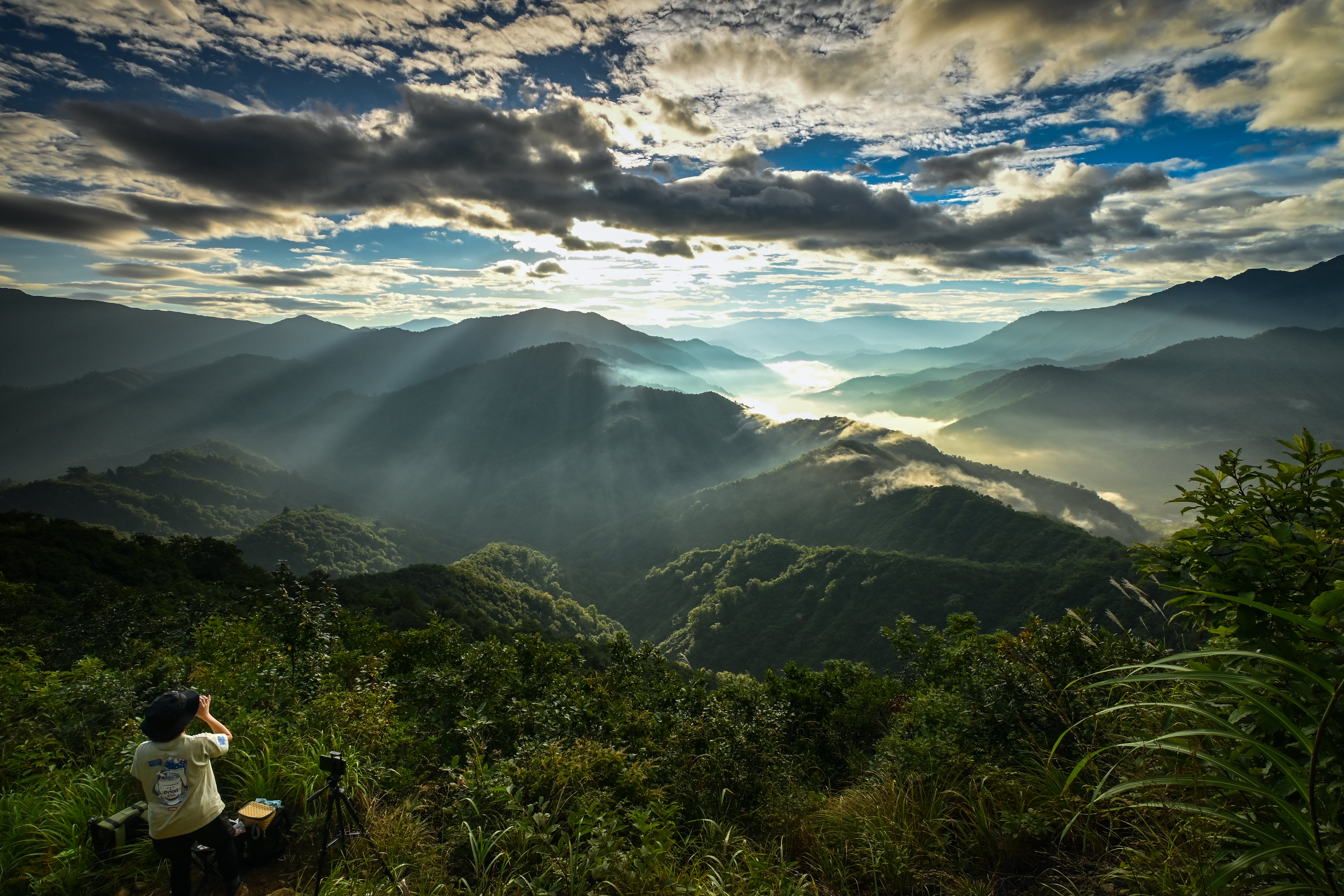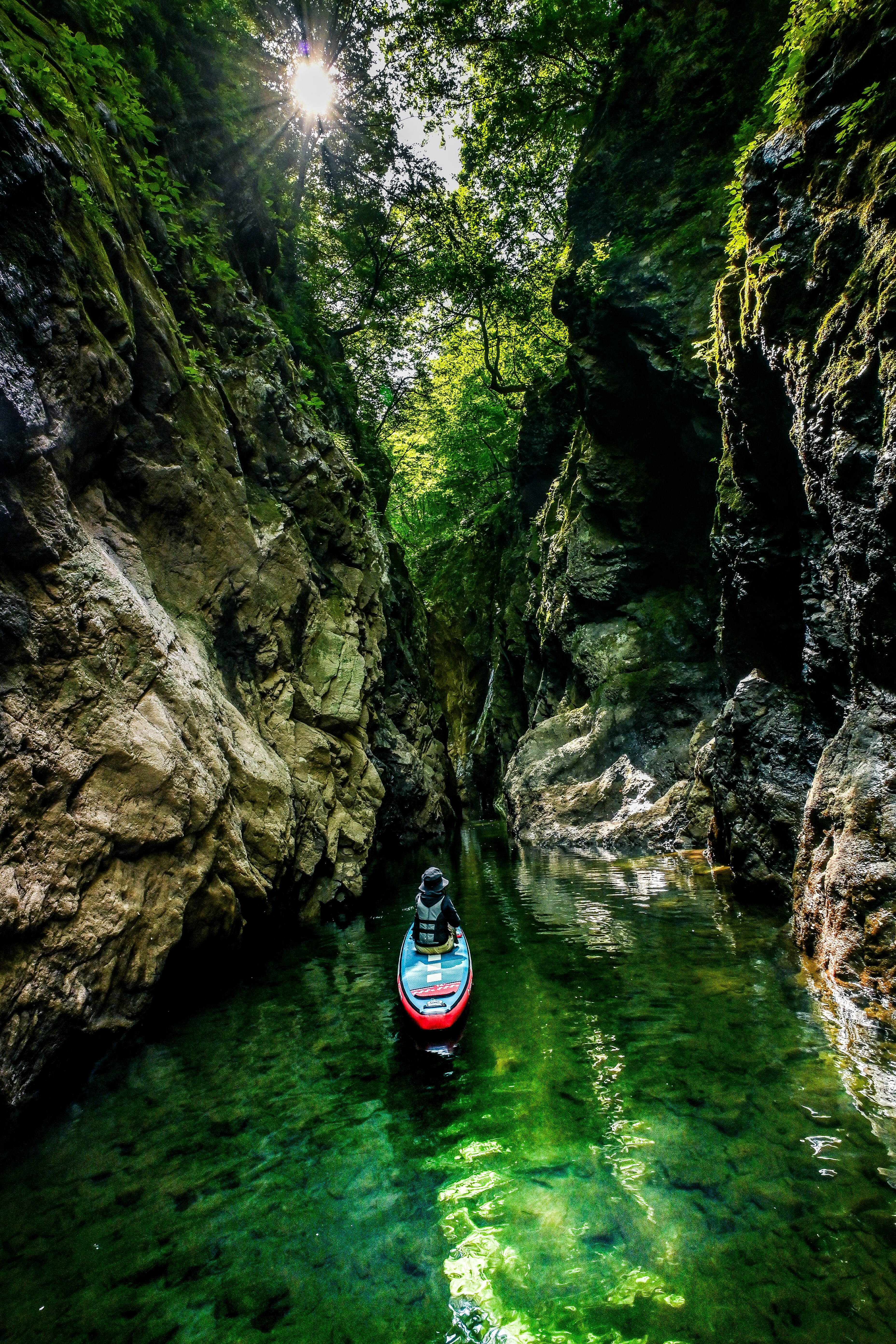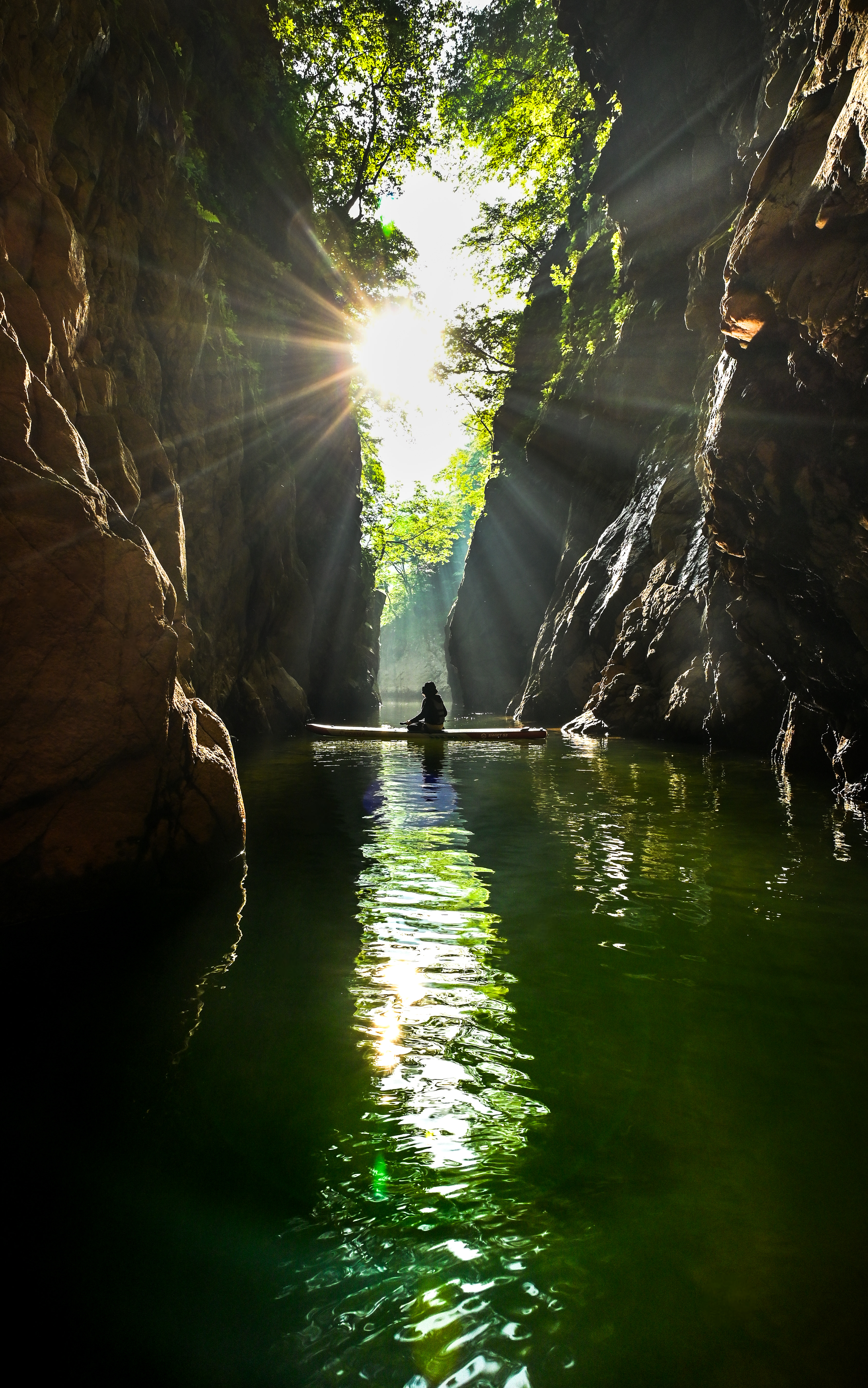 渓谷にさしこむ朝日を拝む、最高のクルージングのひとときを撮影しました。