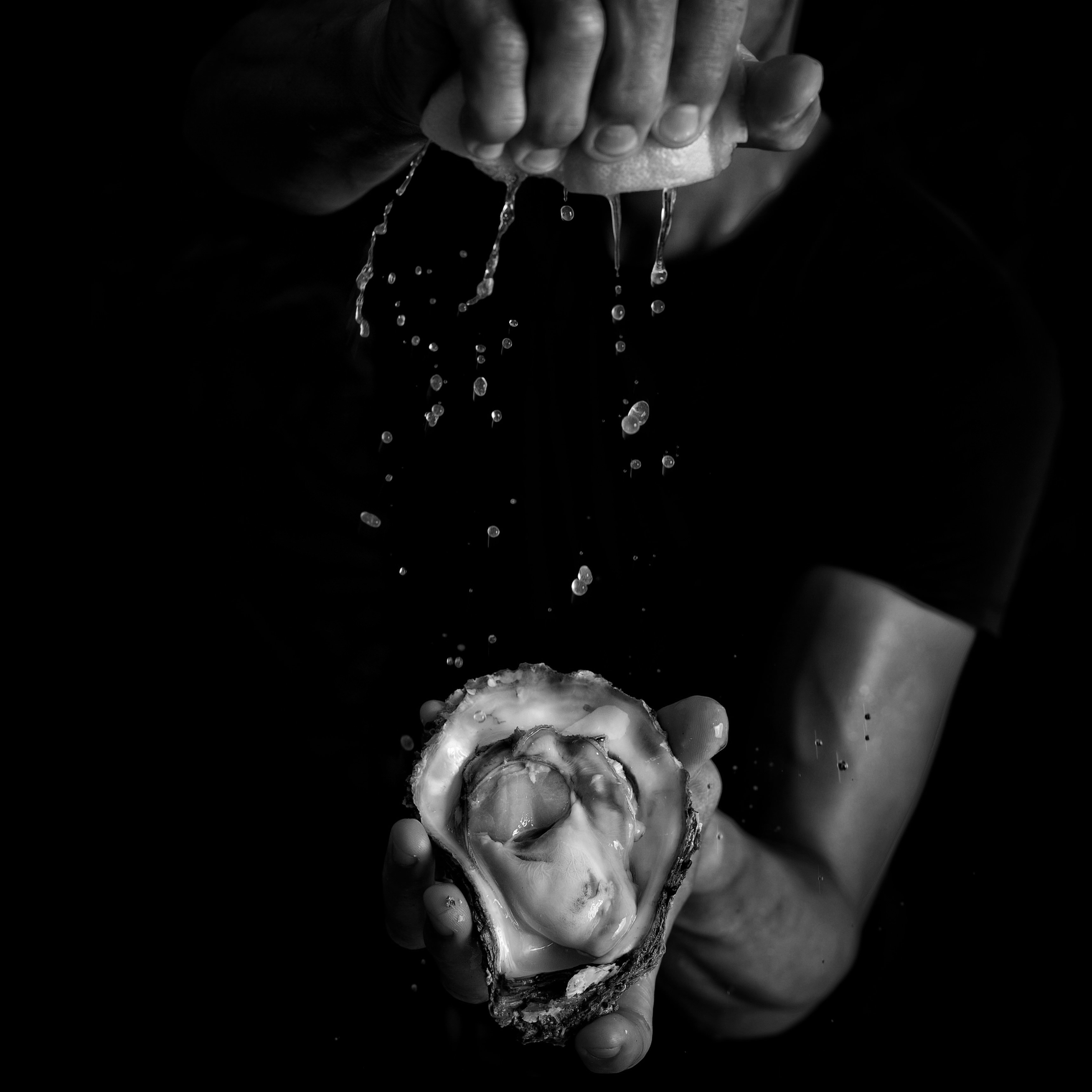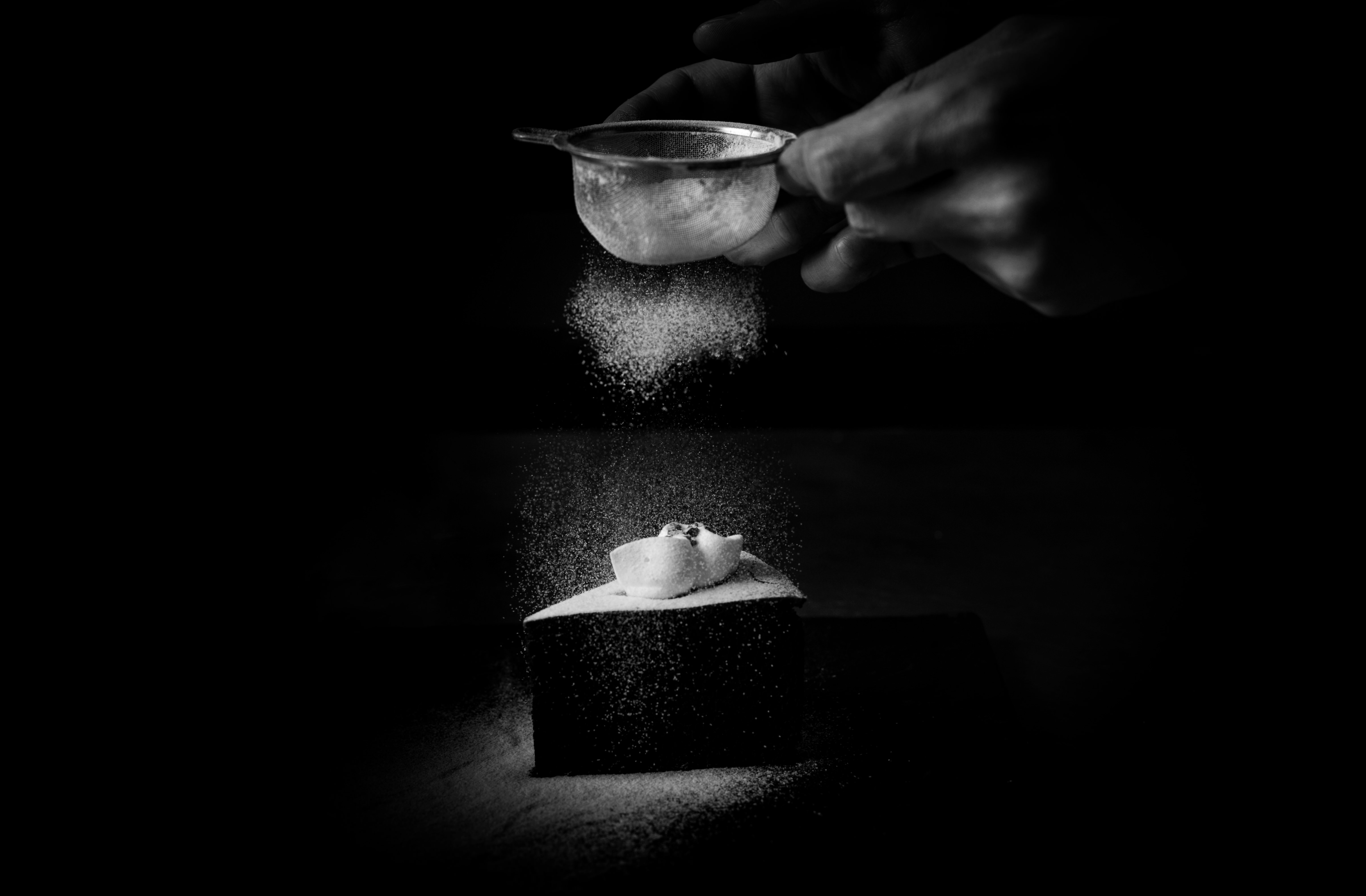ケーキに仕上げの粉砂糖を振っている様子を撮影、モノクロで表現いたしました。
