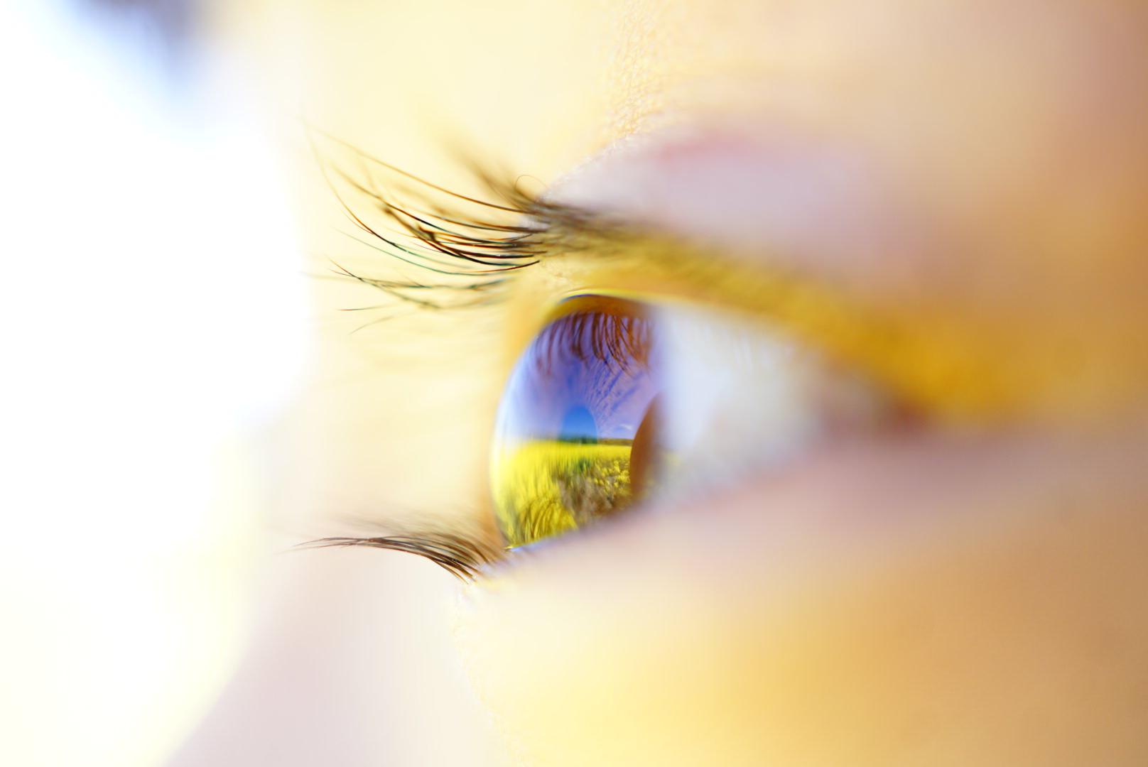 瞳に映る菜の花、北海道の初夏。