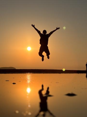 彼は高く高く飛び上がる