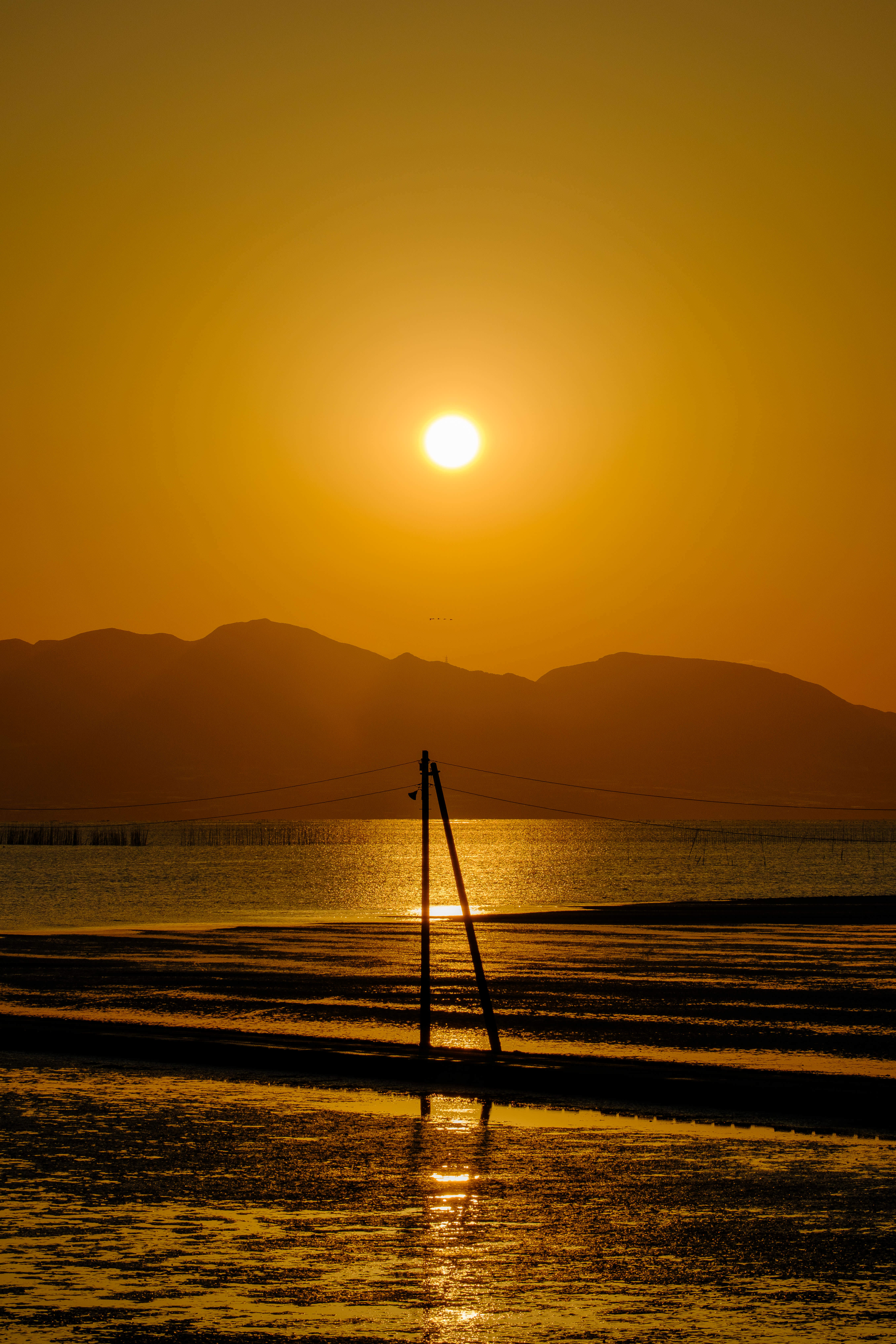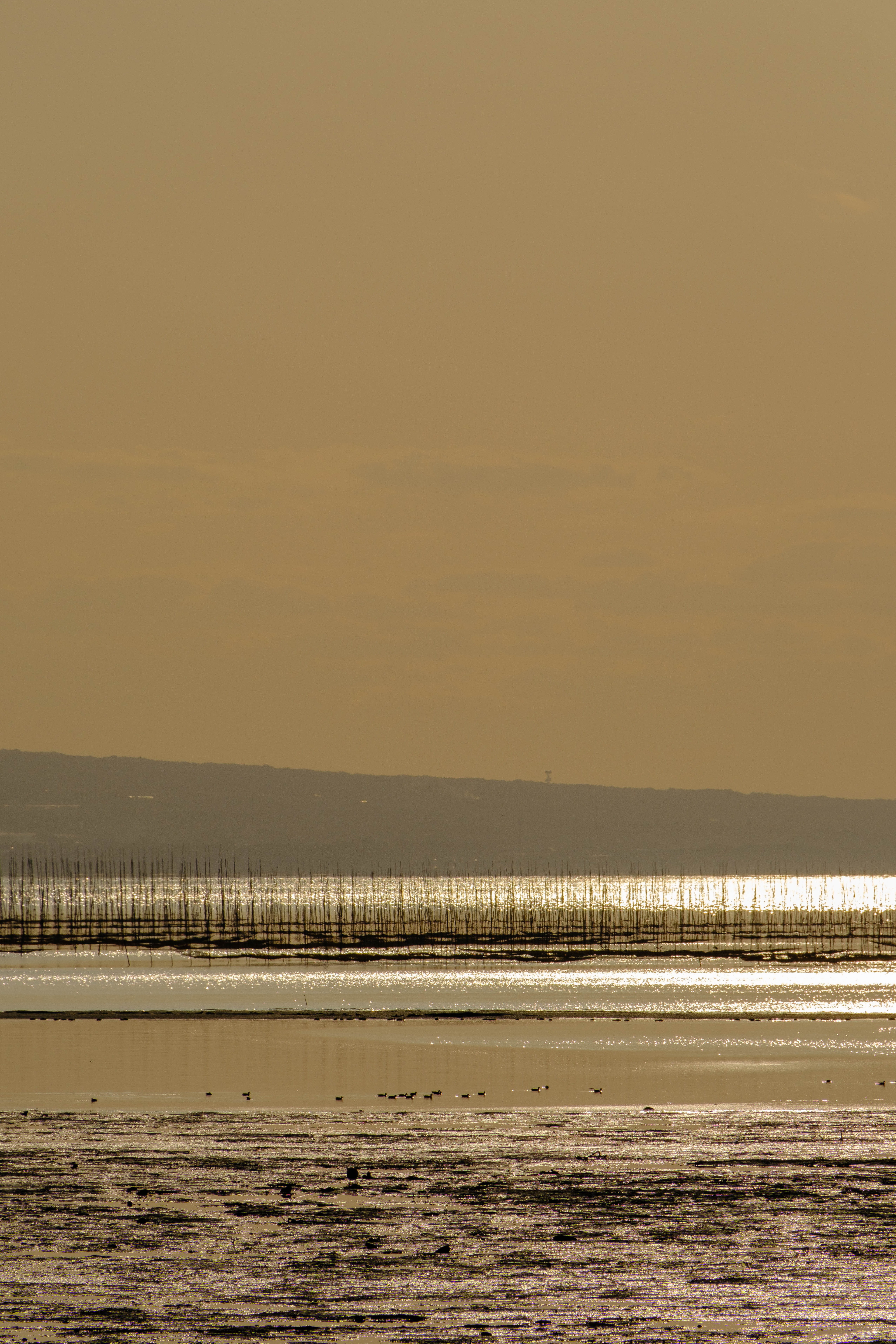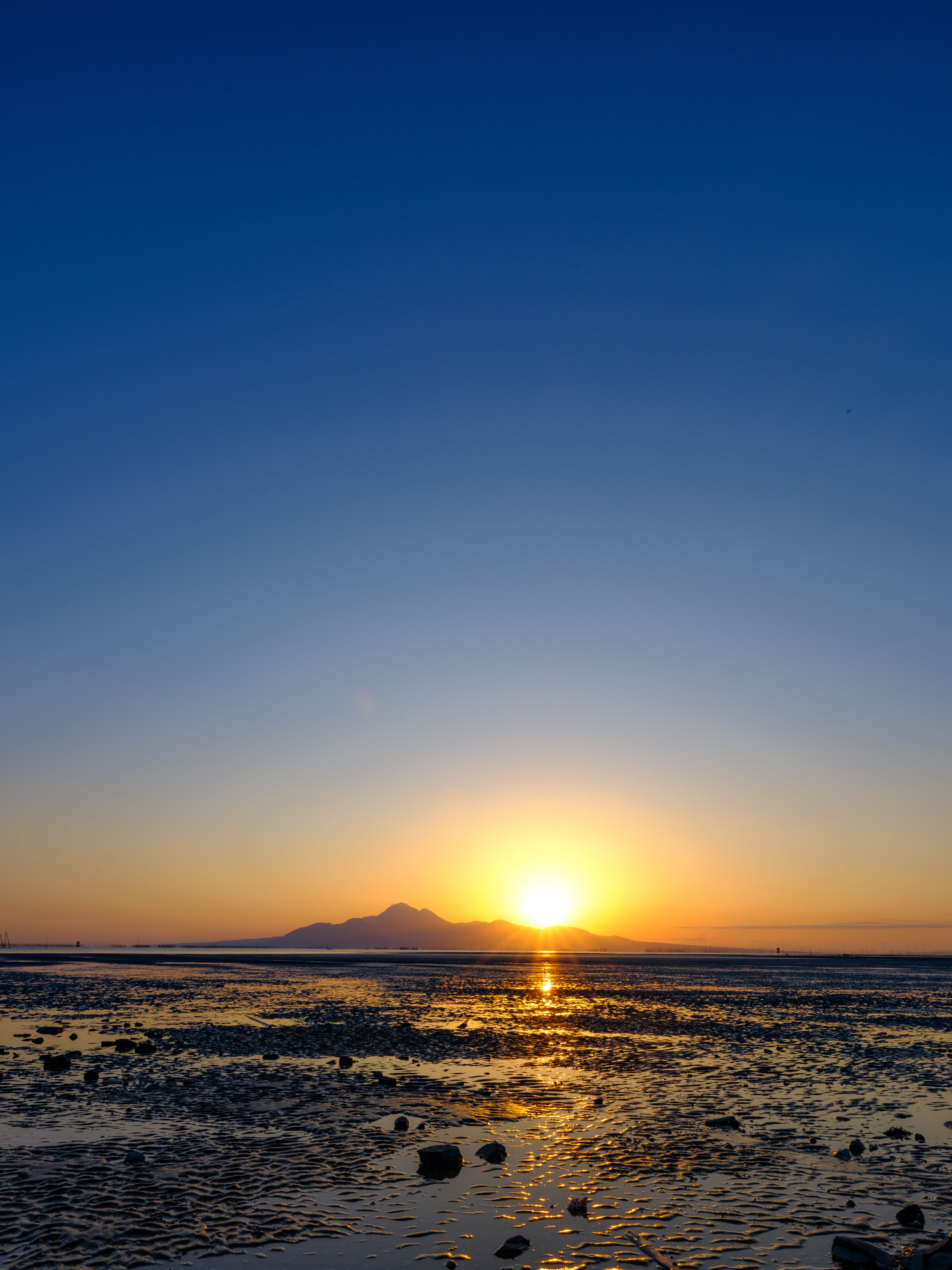 熊本県の荒尾干潟。学校帰りの子どもたちが夕方の海を眺めています。贅沢な道草ですね。