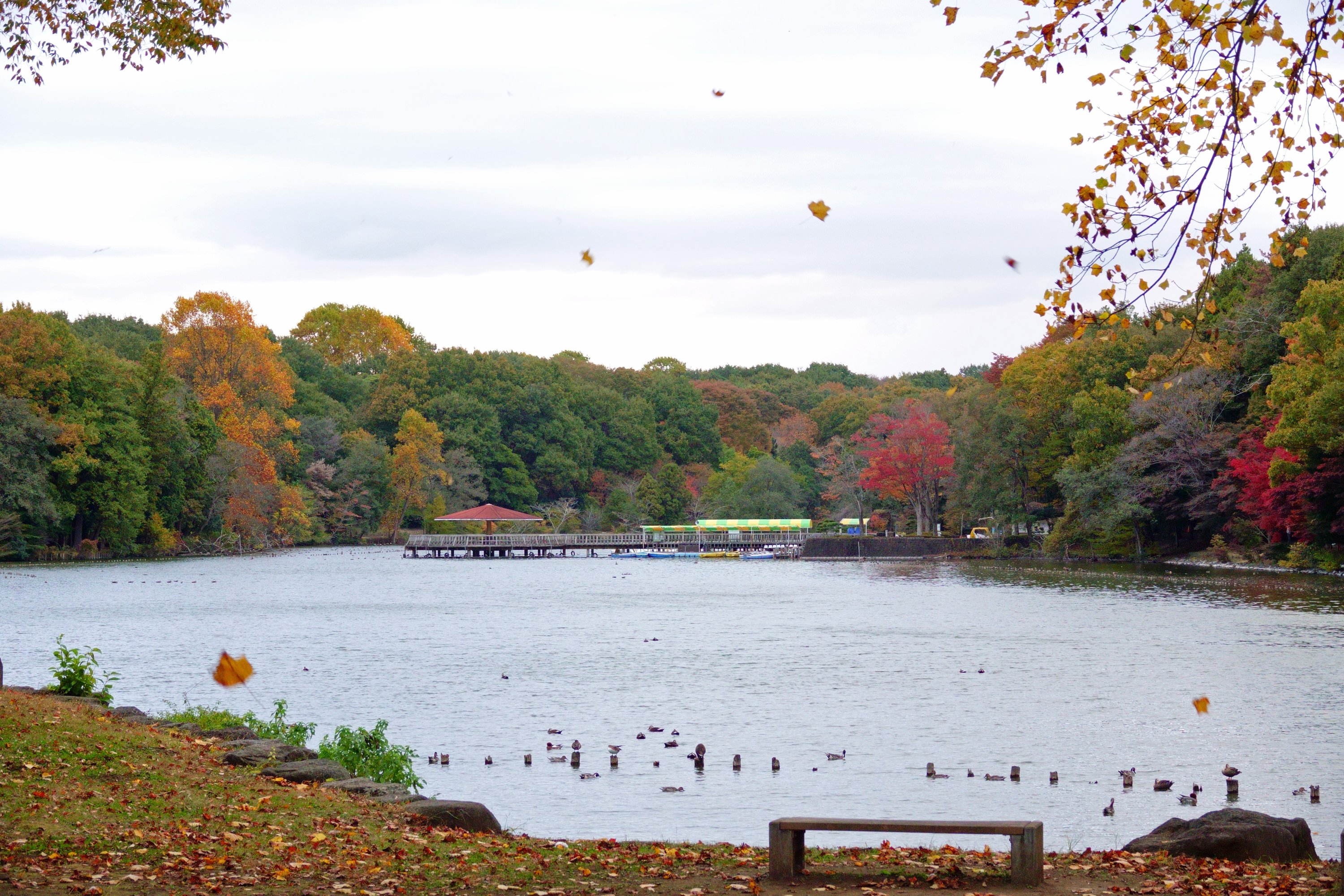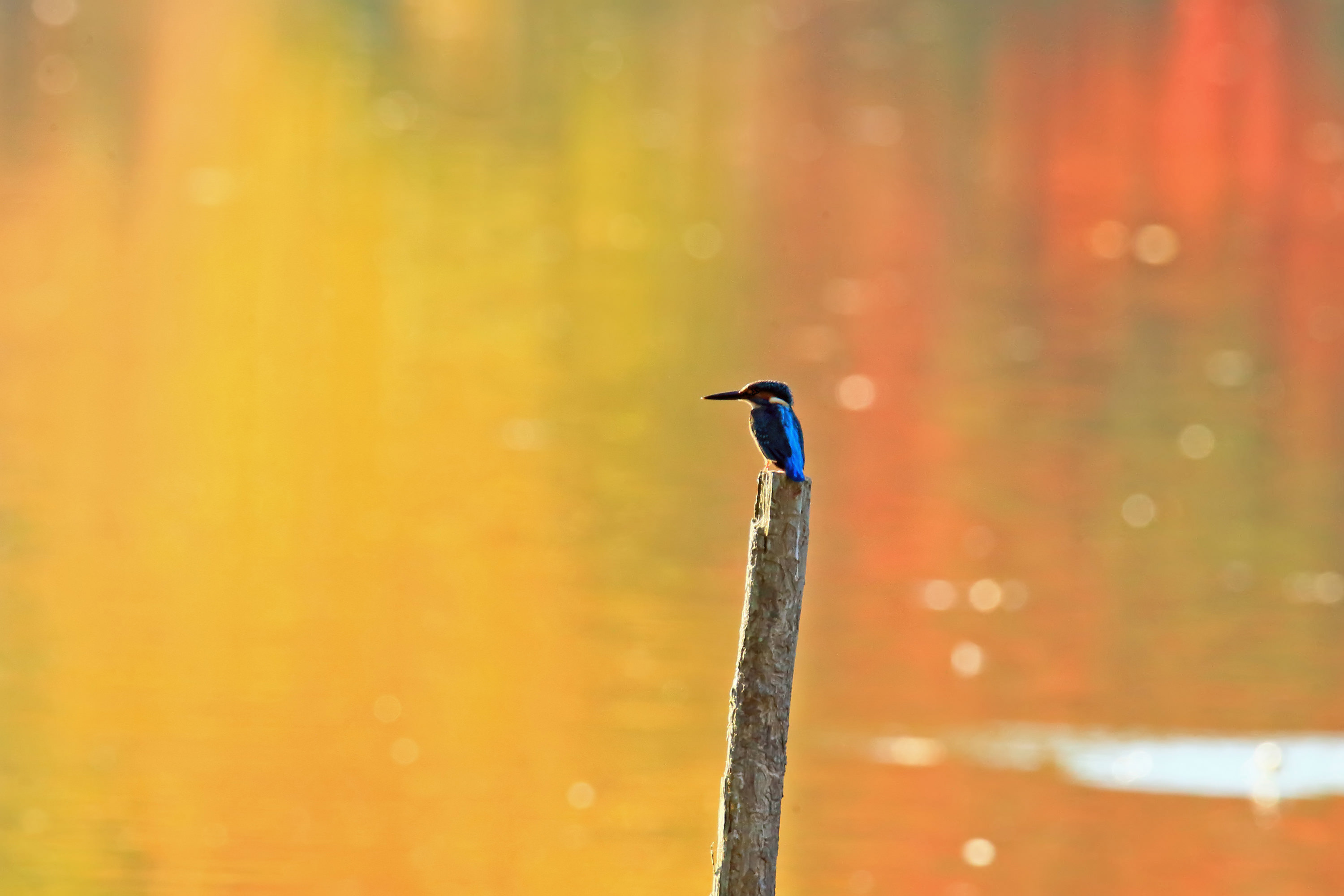 黄葉を映す水面に突き出た小枝にセグロセキレイが乗り、時折水を飲むようなしぐさをしていました。