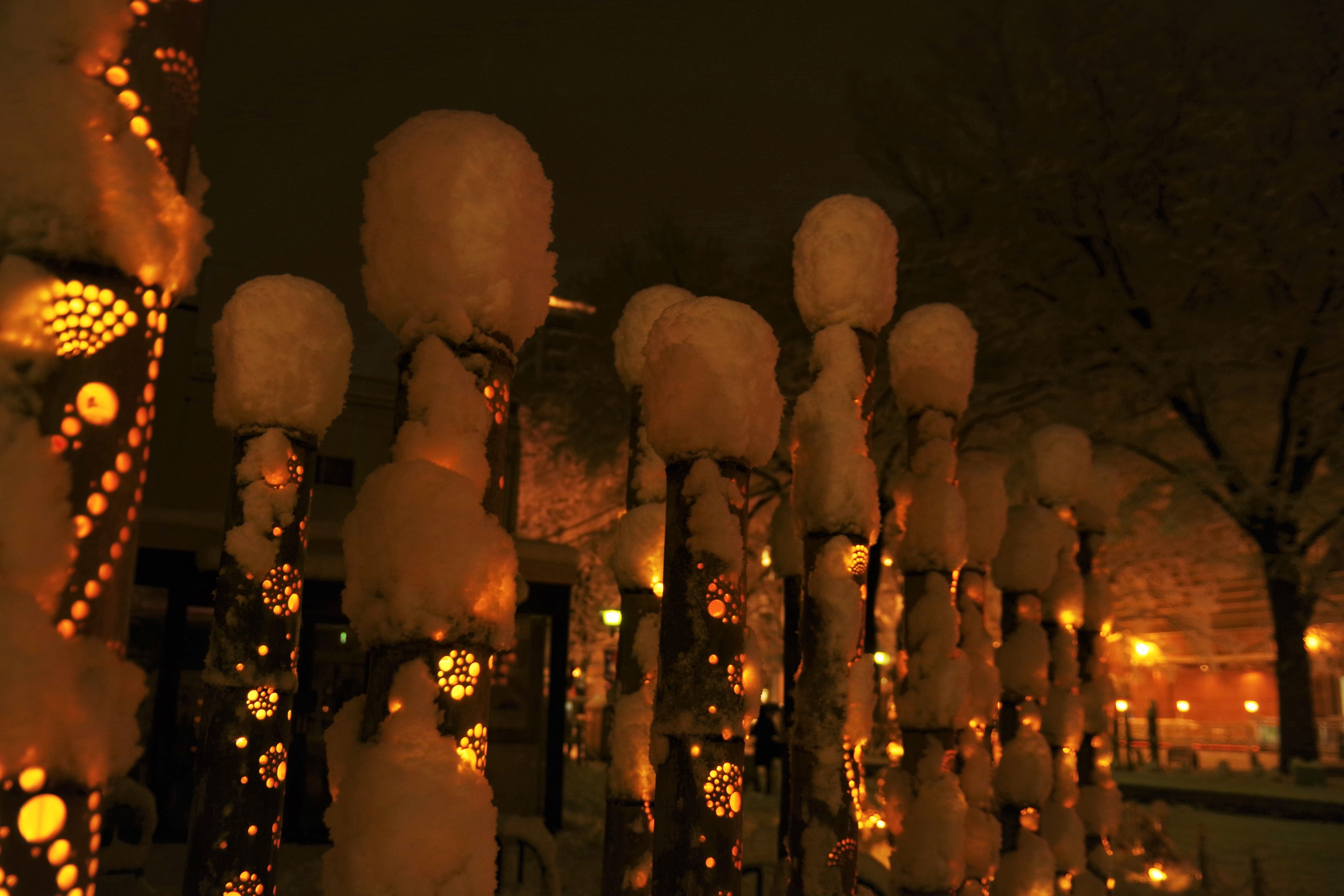 府中市も雪が降ったのですが、竹灯りが、雪帽子をかぶっており、可愛かったです。