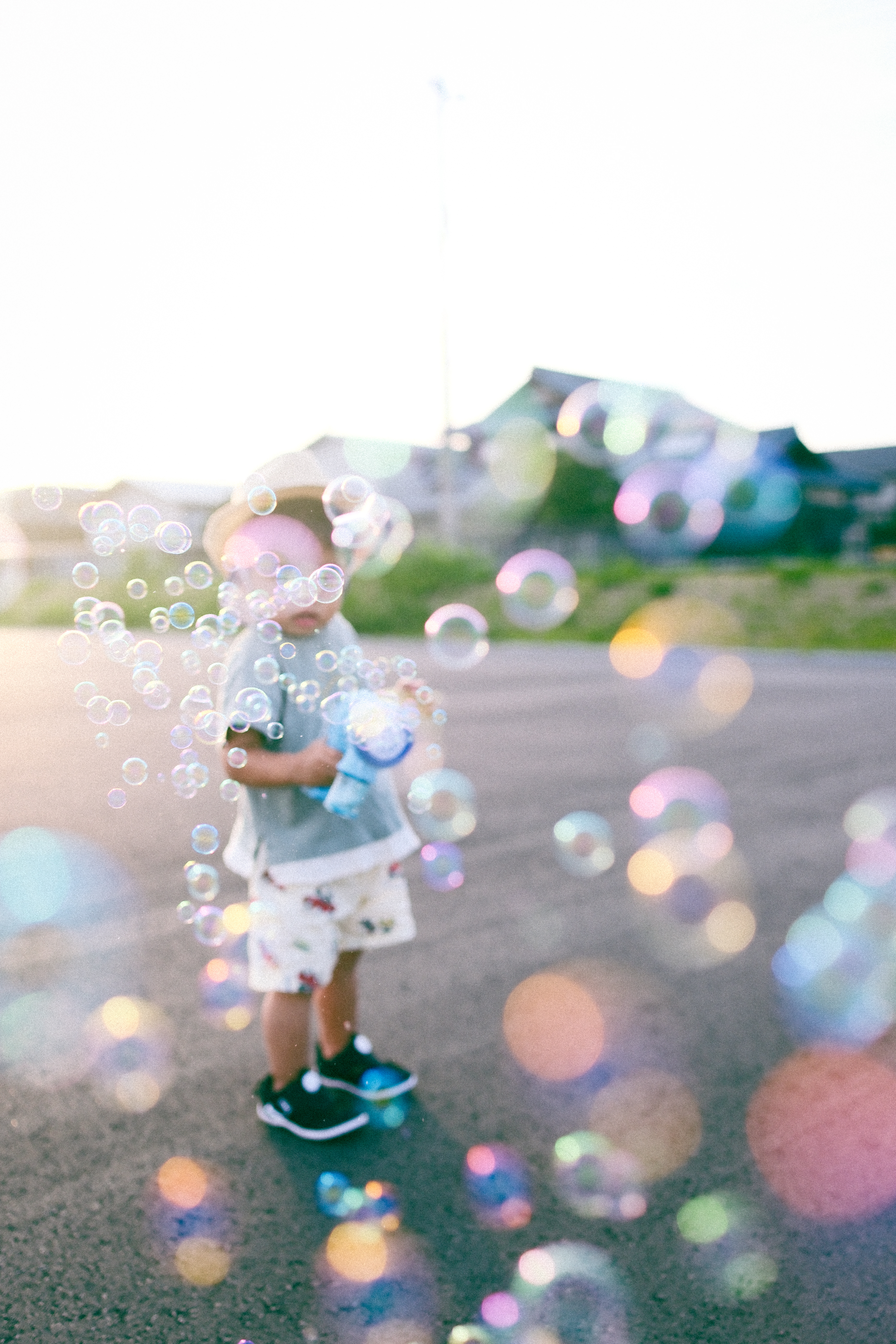 シャボン玉が夕焼けの光を浴びてどこか懐かしい雰囲気の写真になりました。