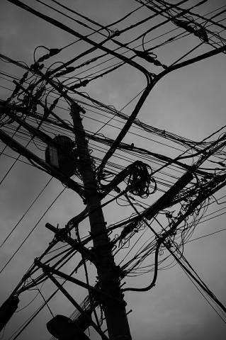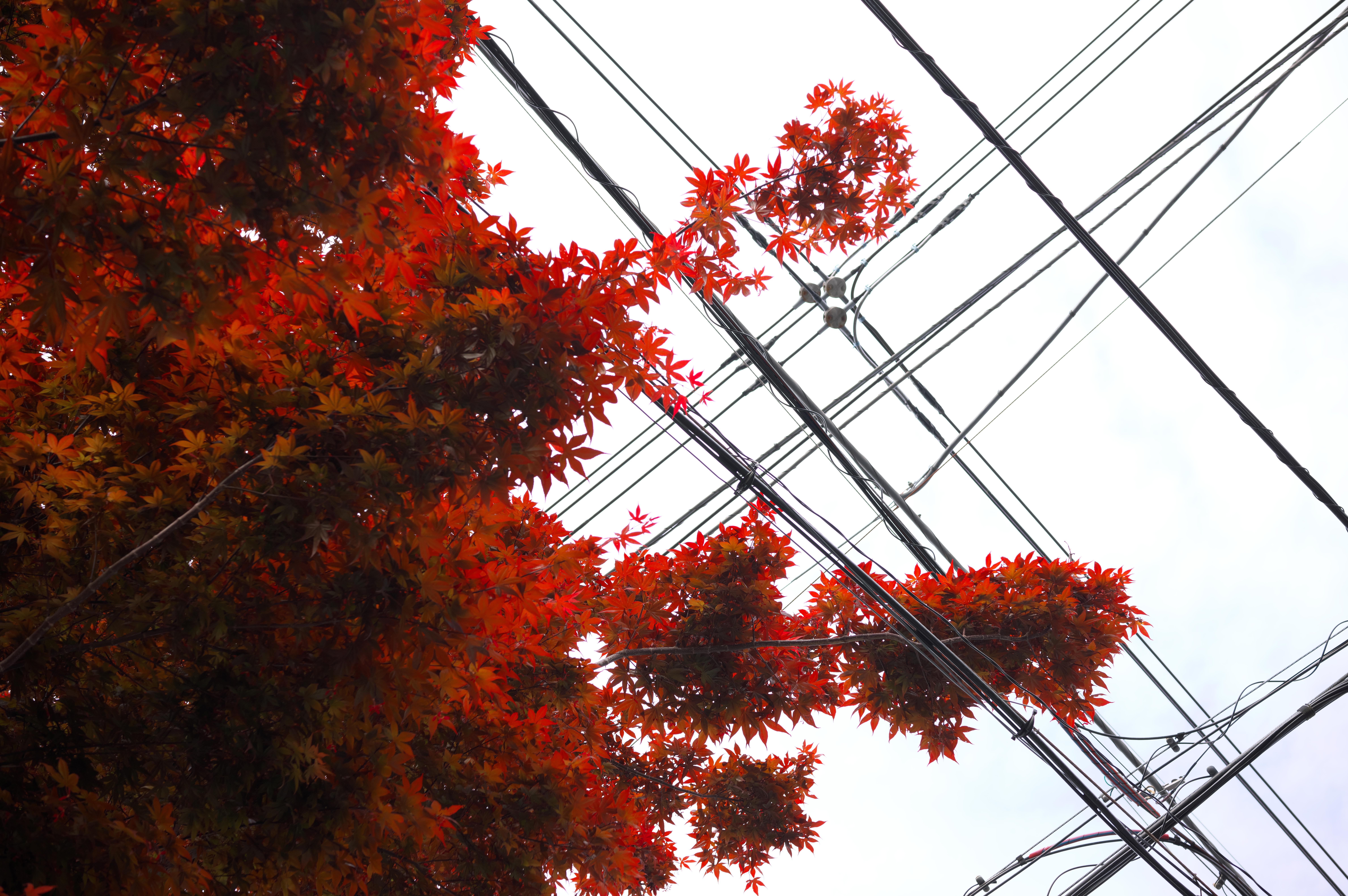 電線と春もみじ