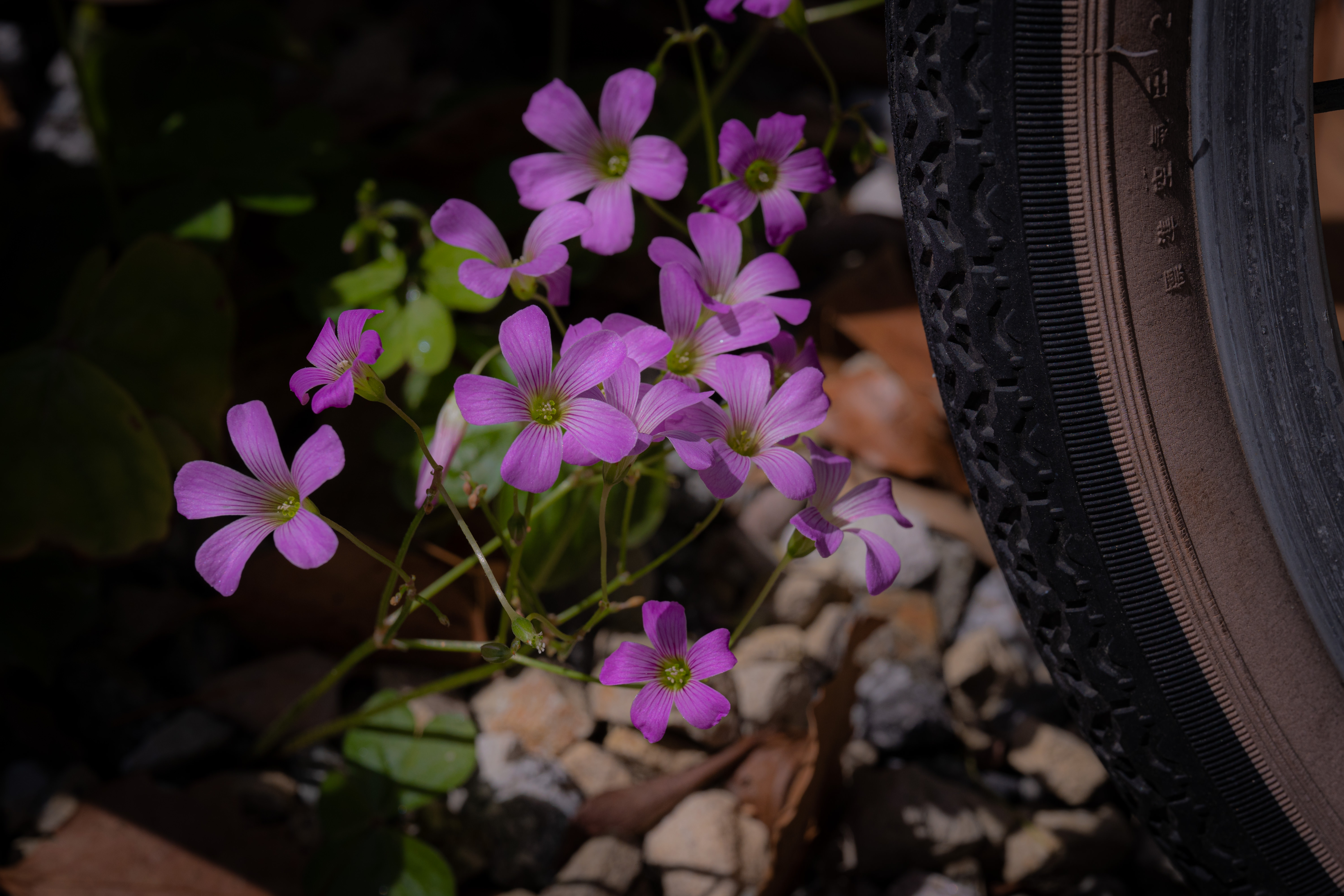 自転車のそばで咲いたムラサキカタバミが可愛いくて。