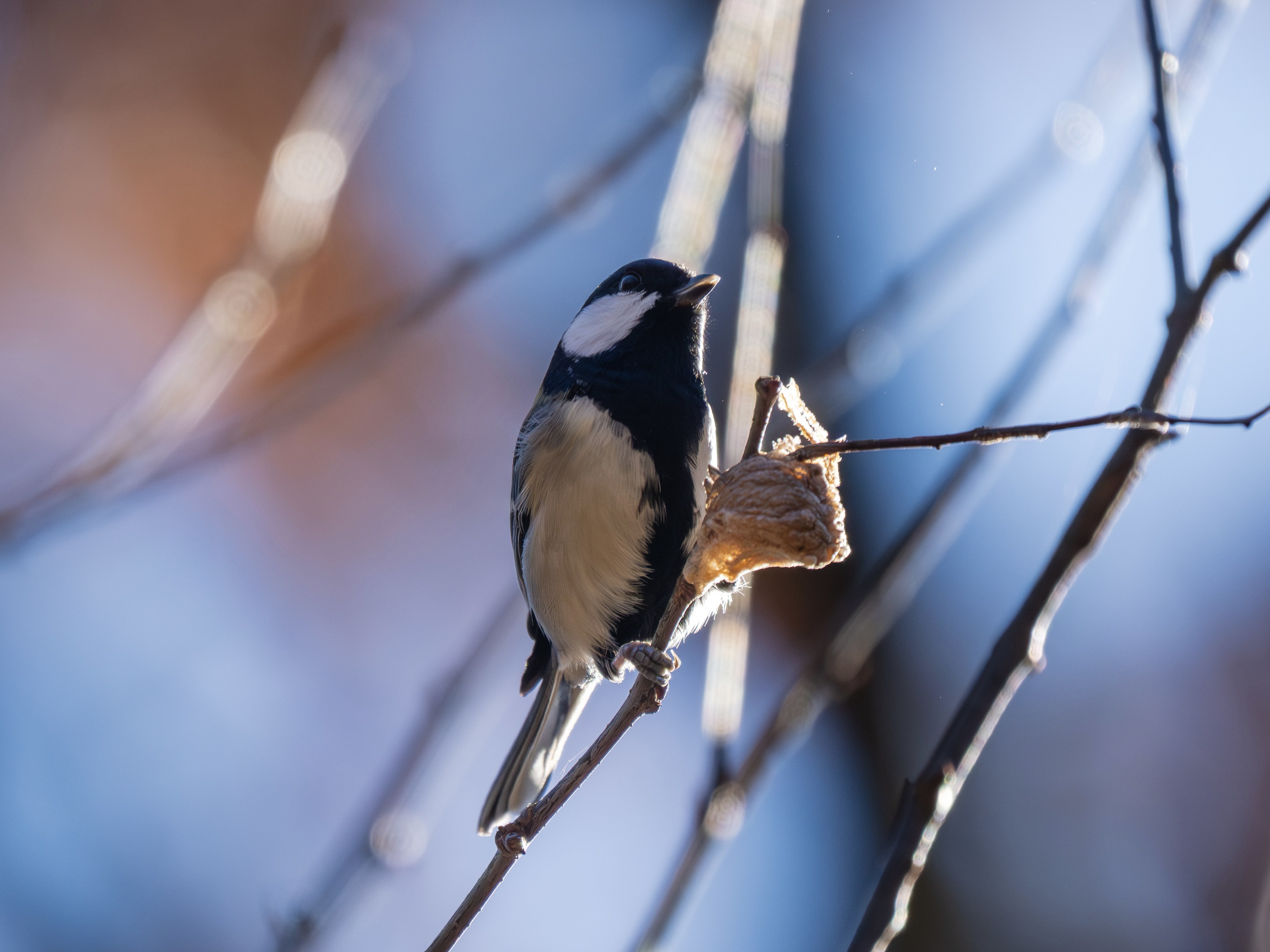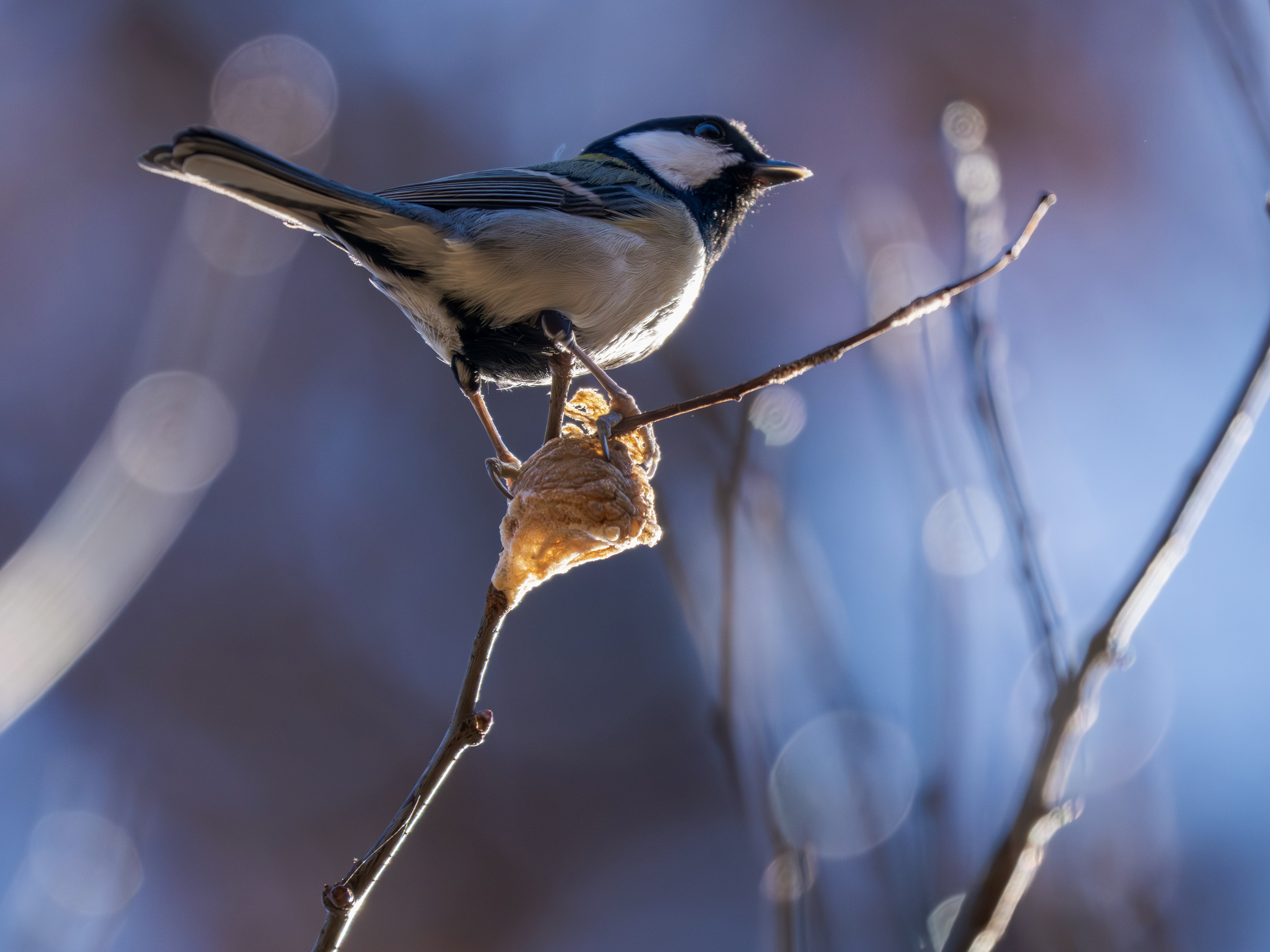 シジュウカラが木の枝のカマキリの巣を見つけてオレのもんだぞ、とアピールしてました。