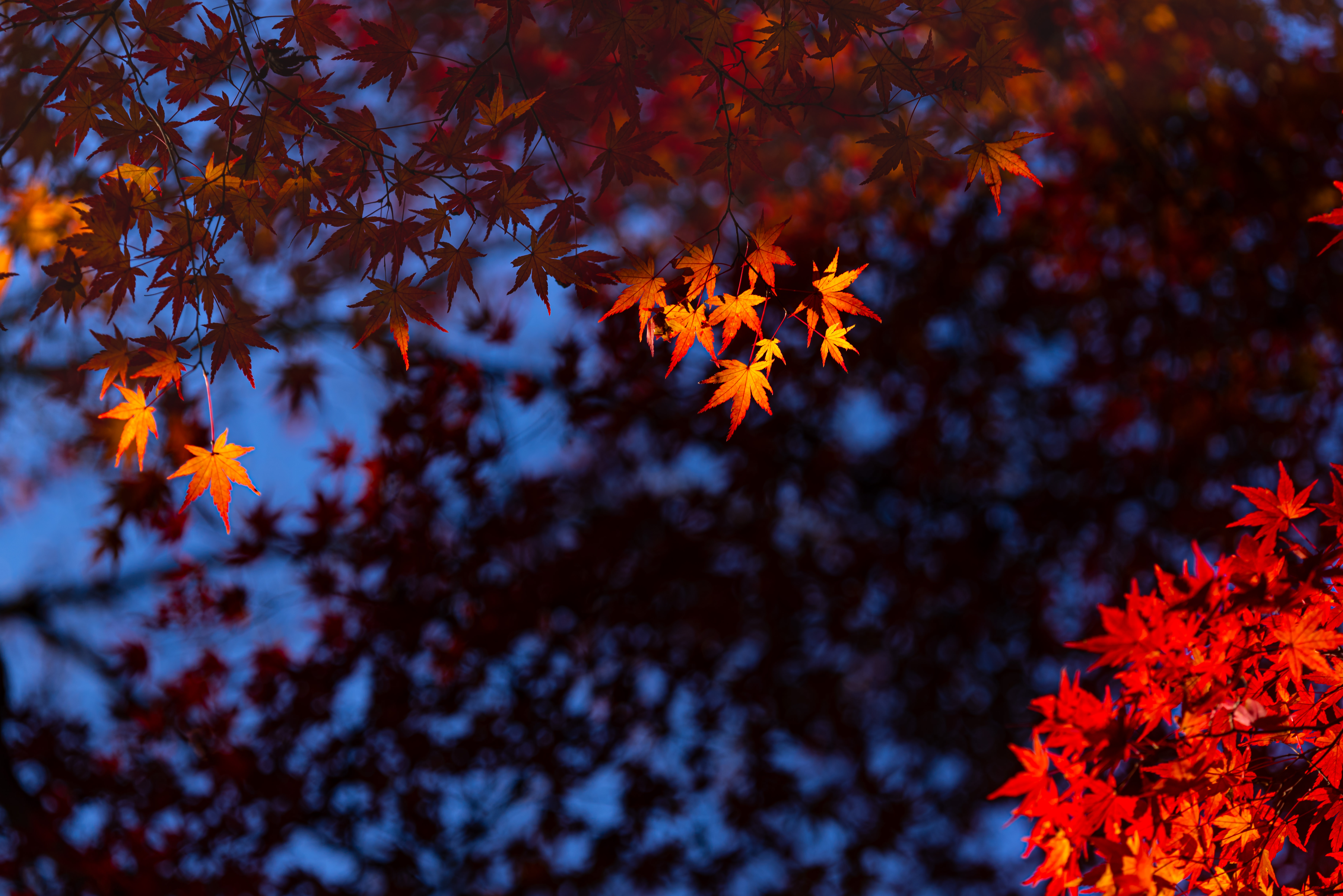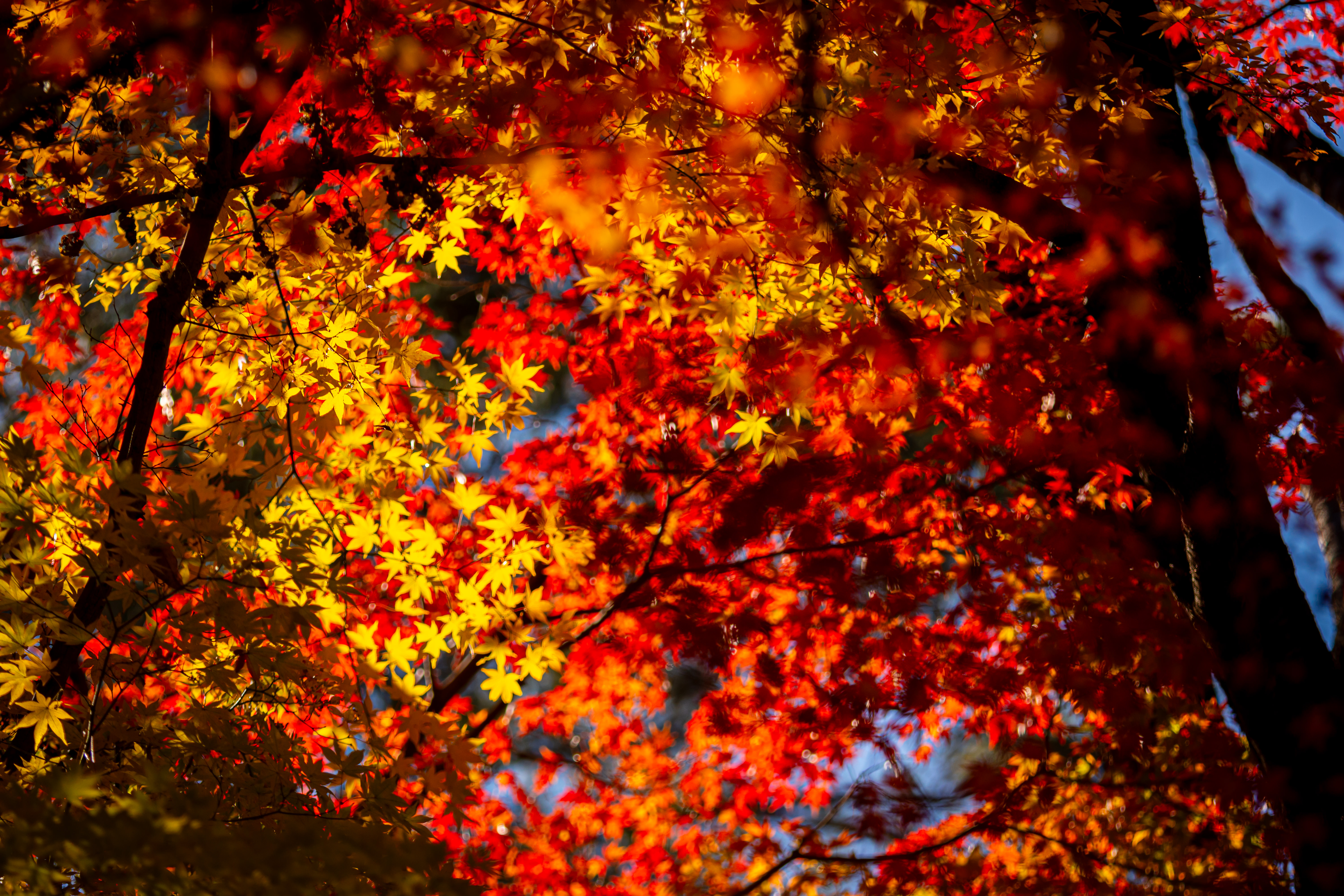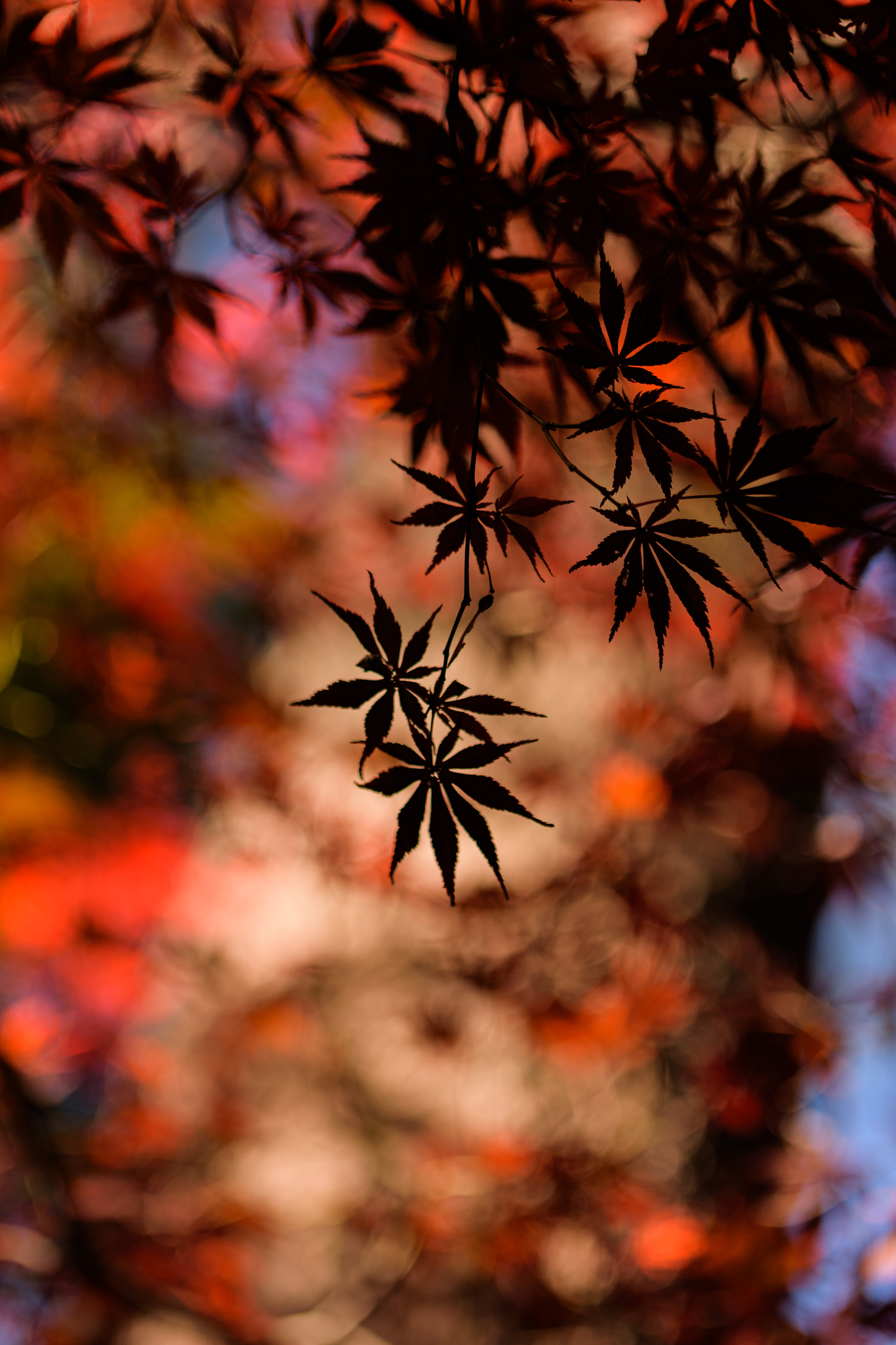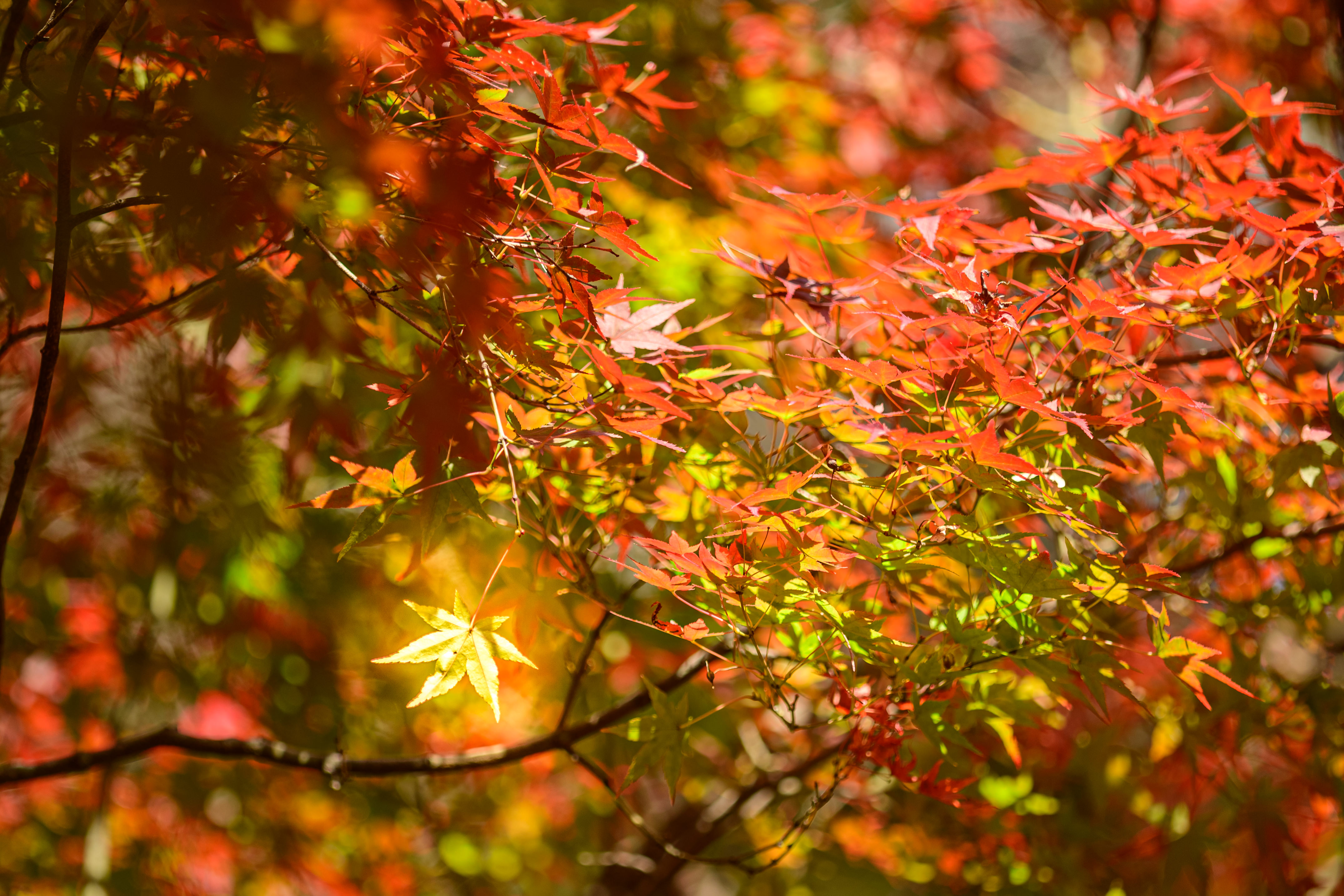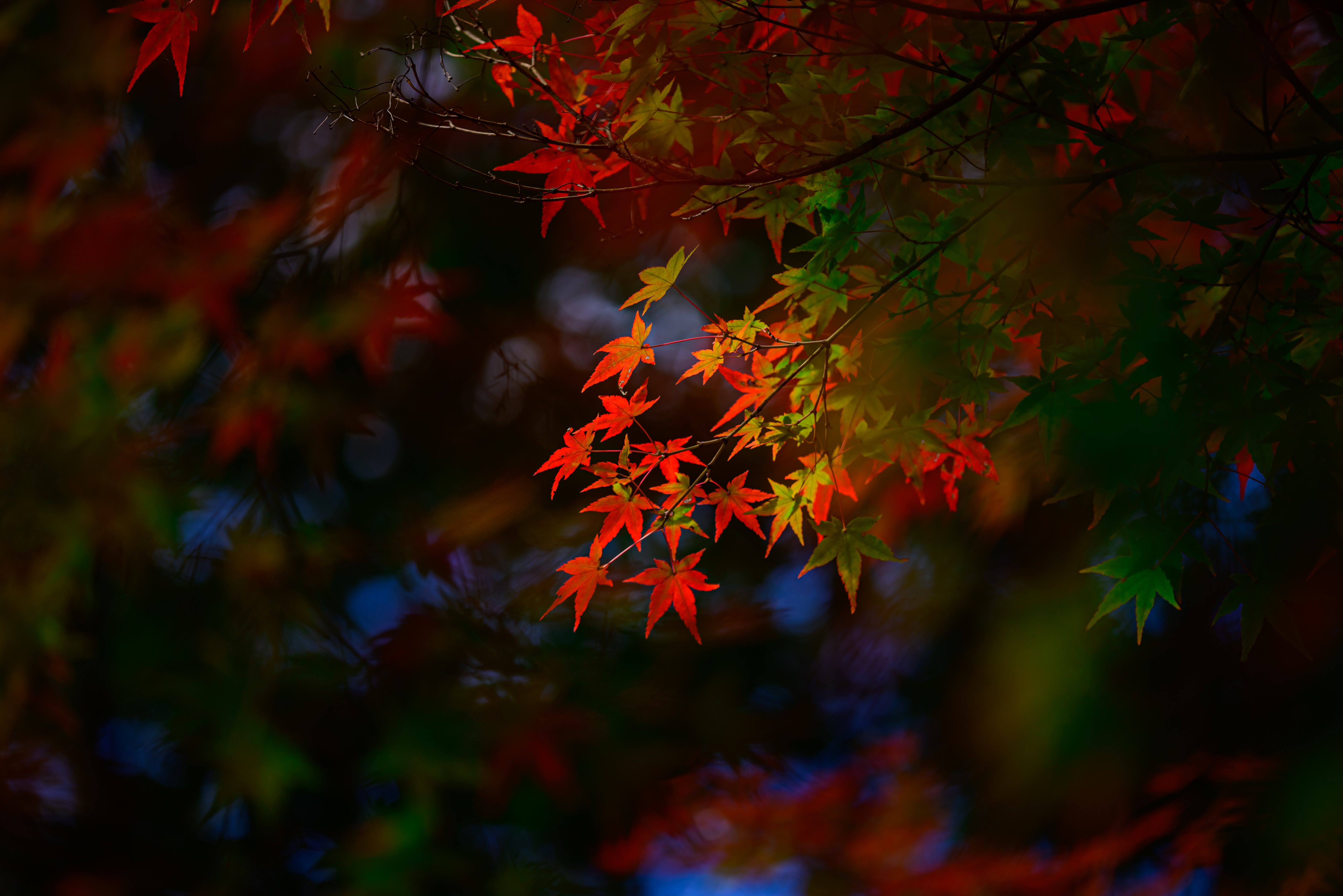 色づいた葉に惹かれてカメラを向けたら玉ボケのともしびを発見。