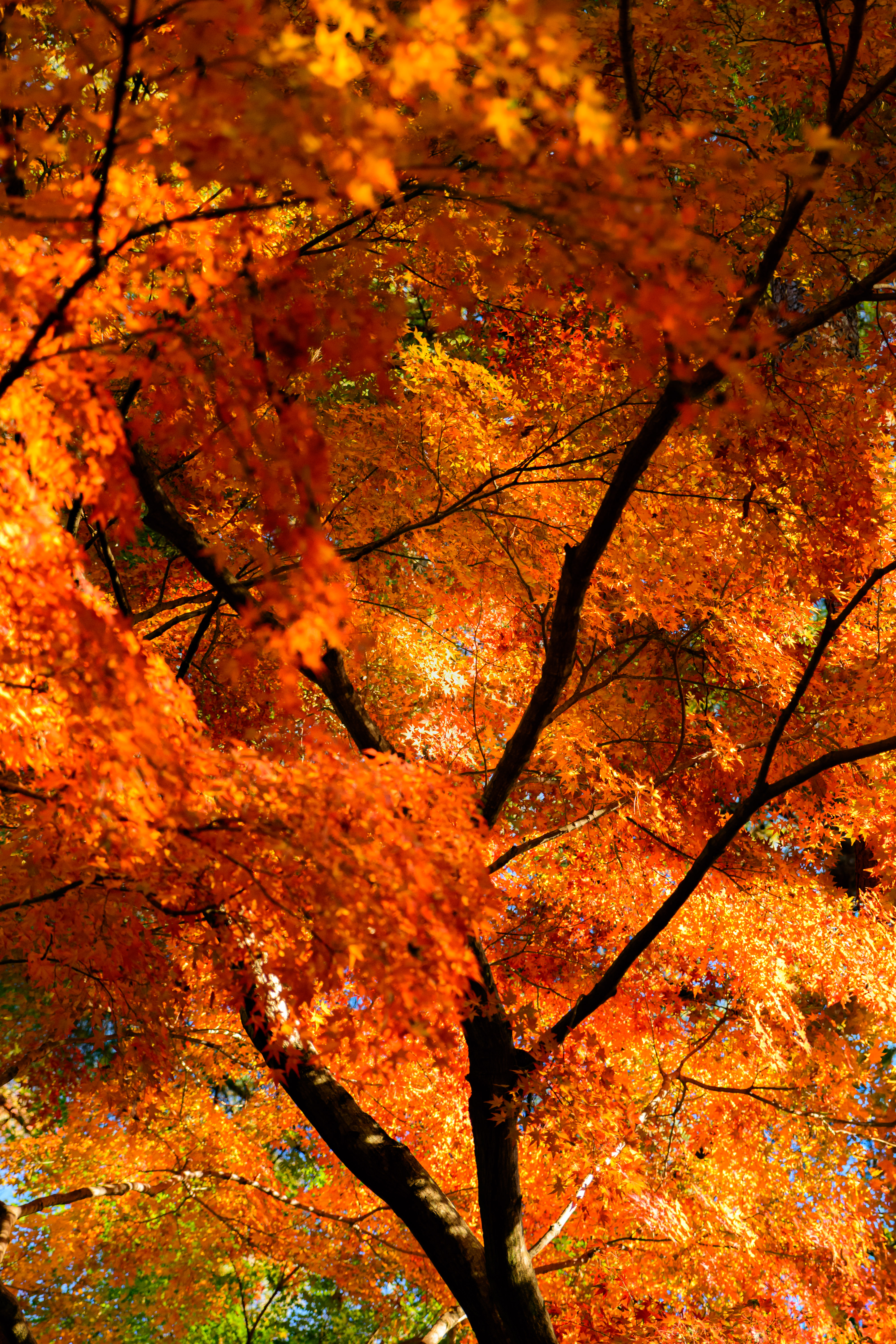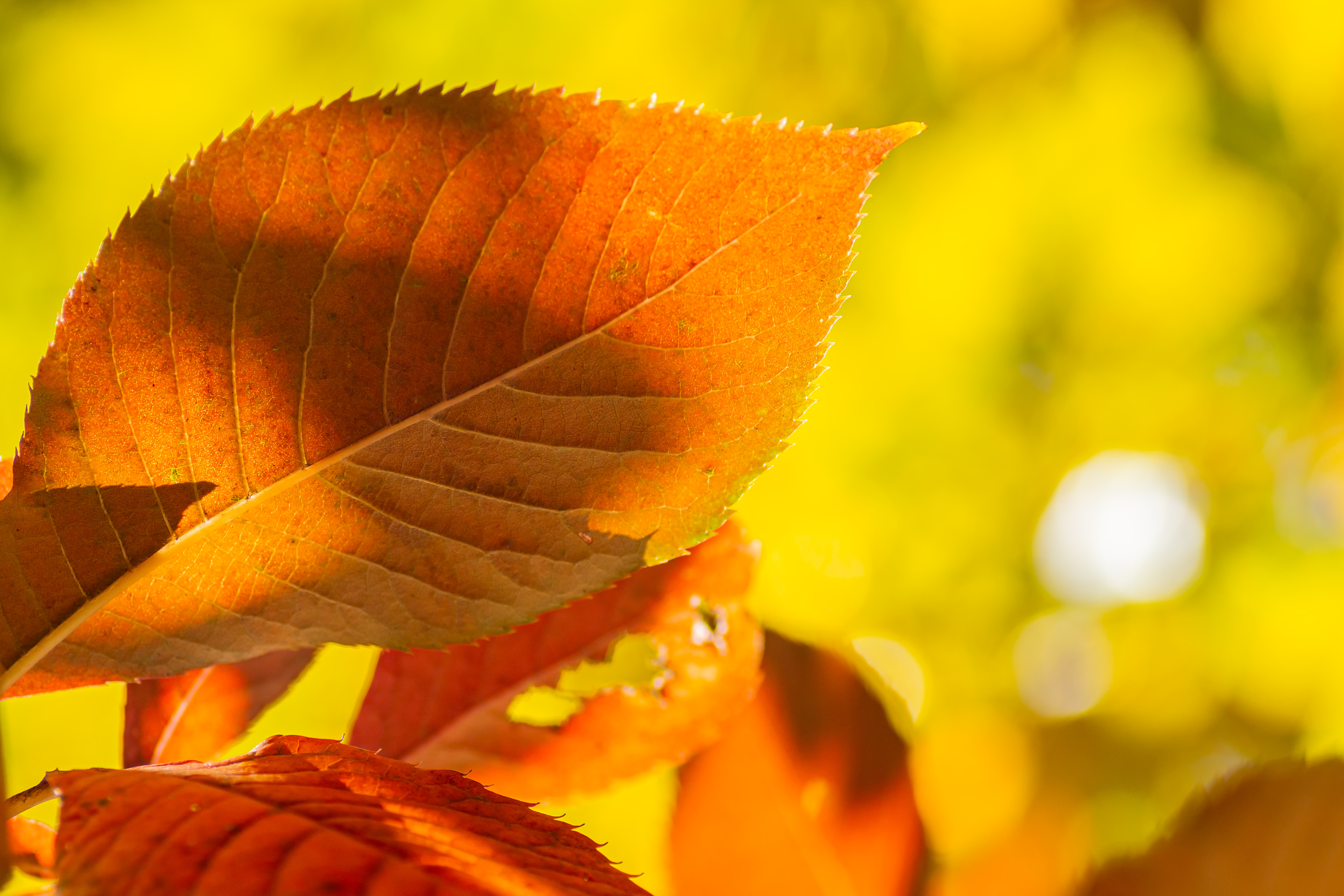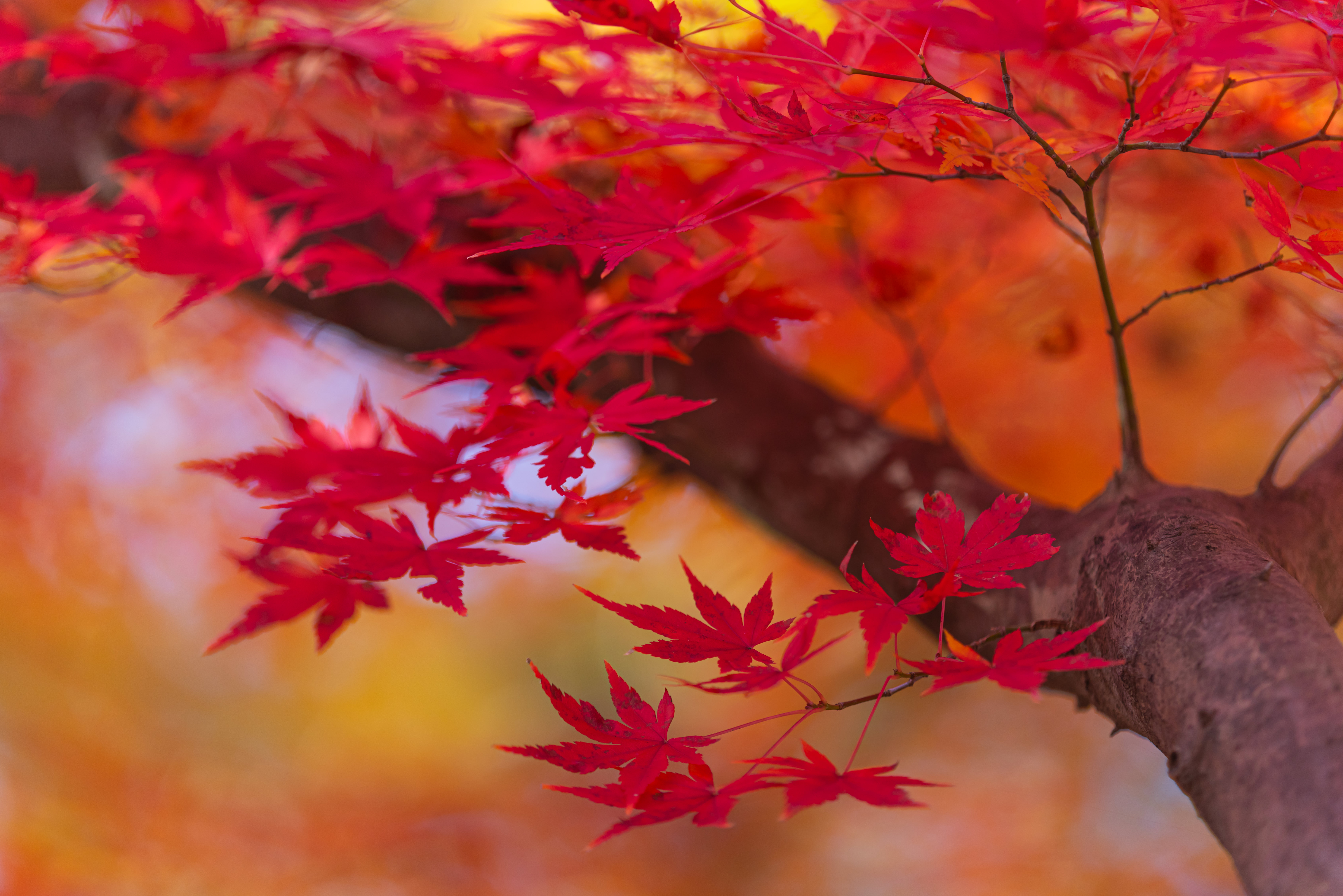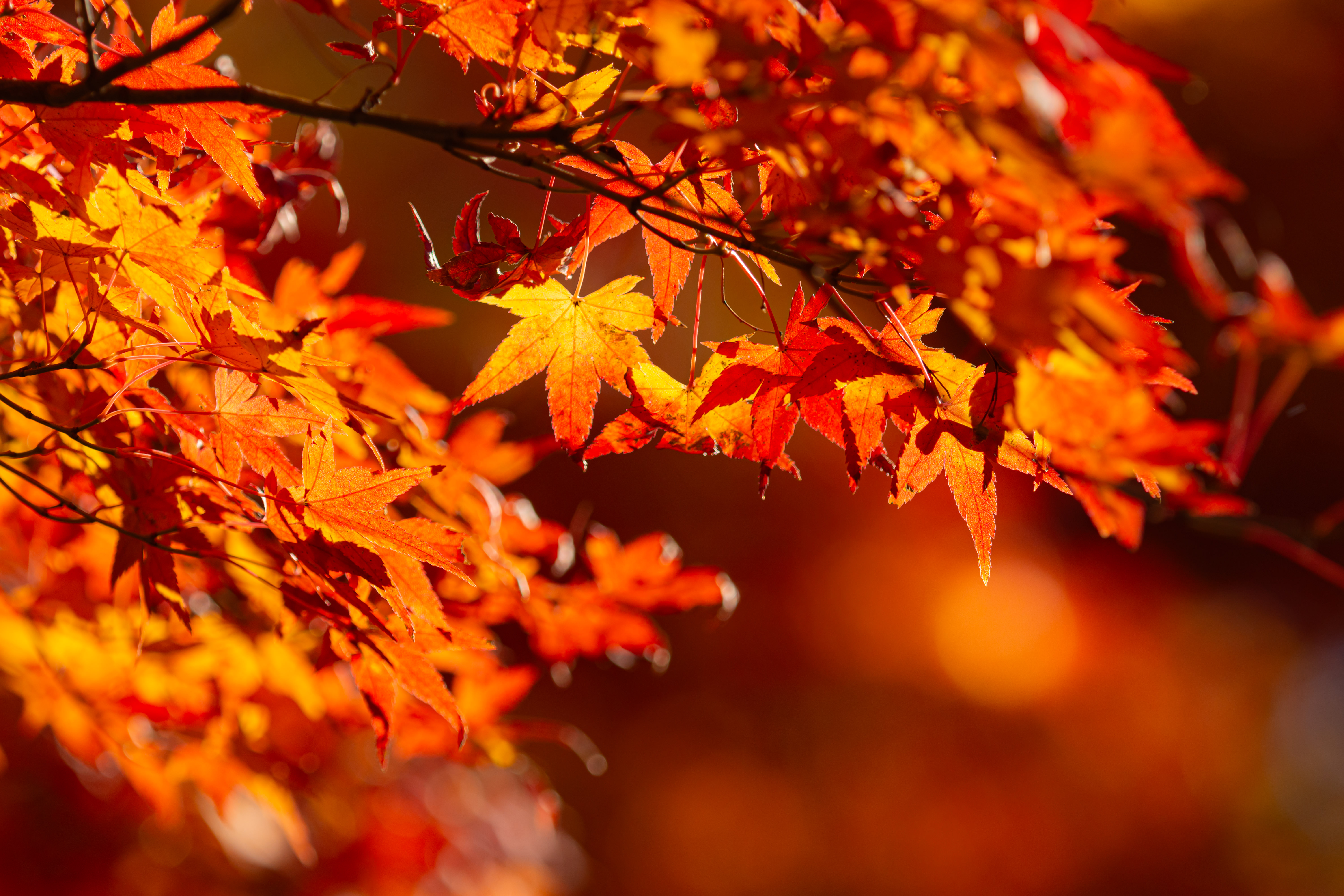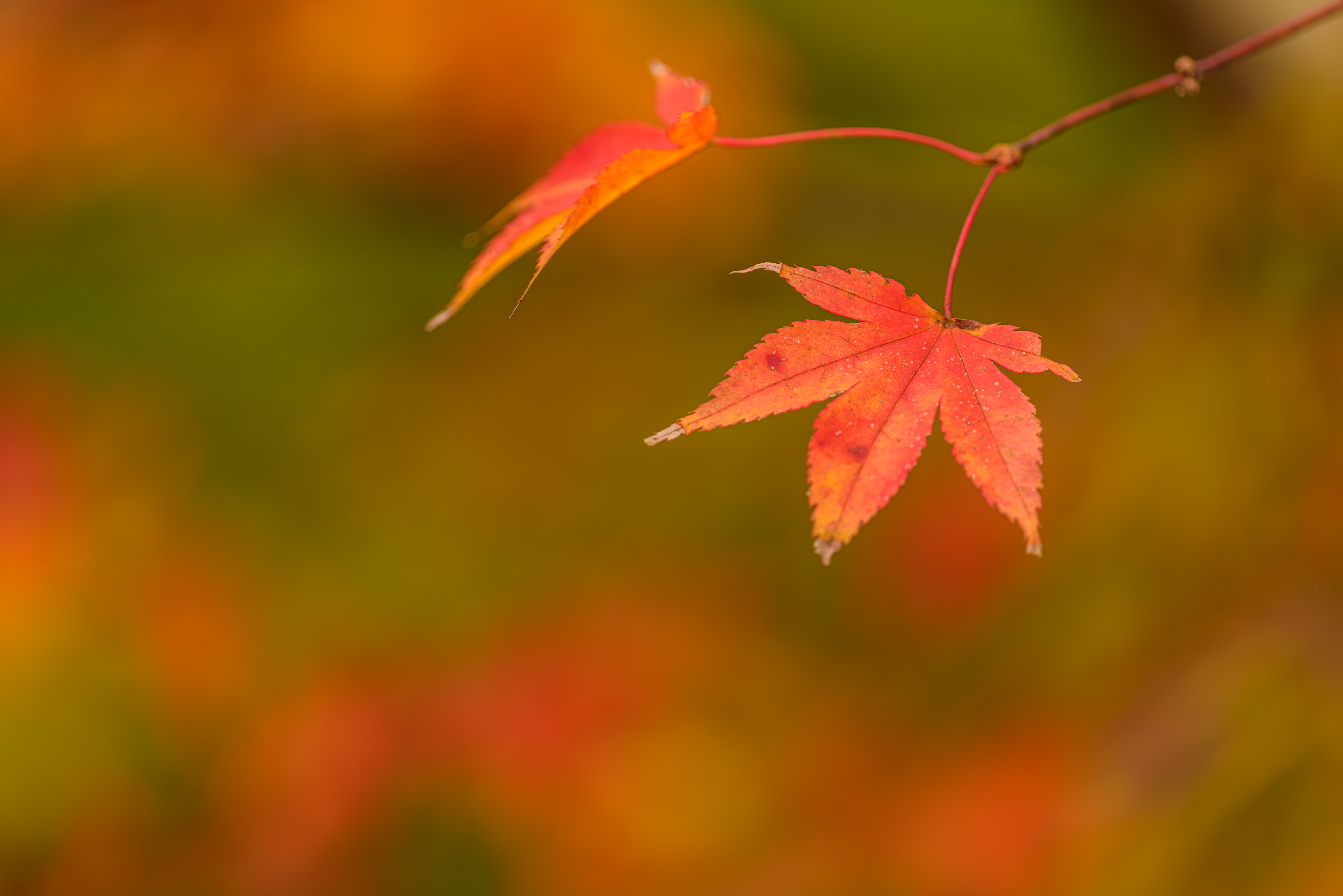色づいた葉に惹かれてカメラを向けたら玉ボケのともしびを発見。