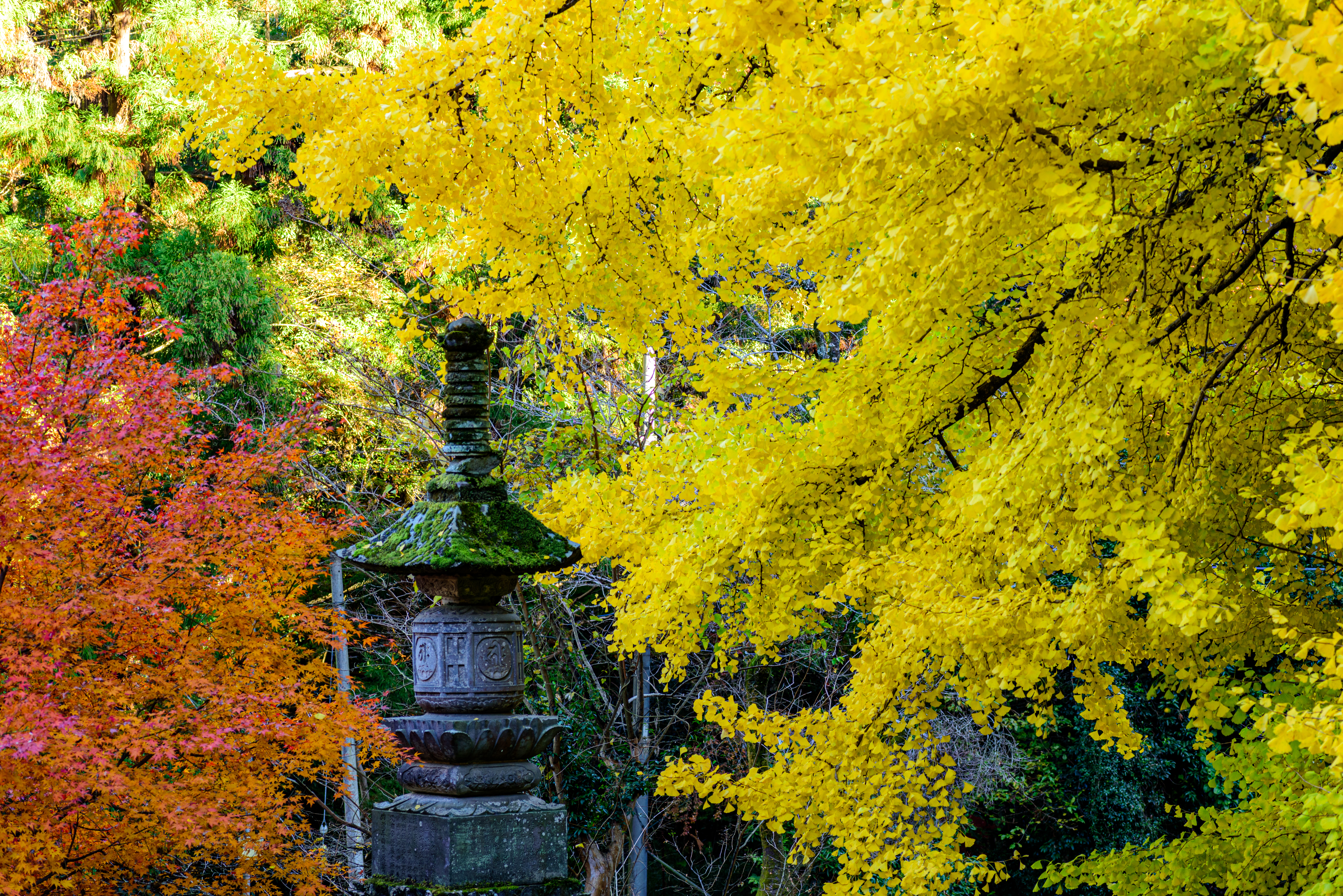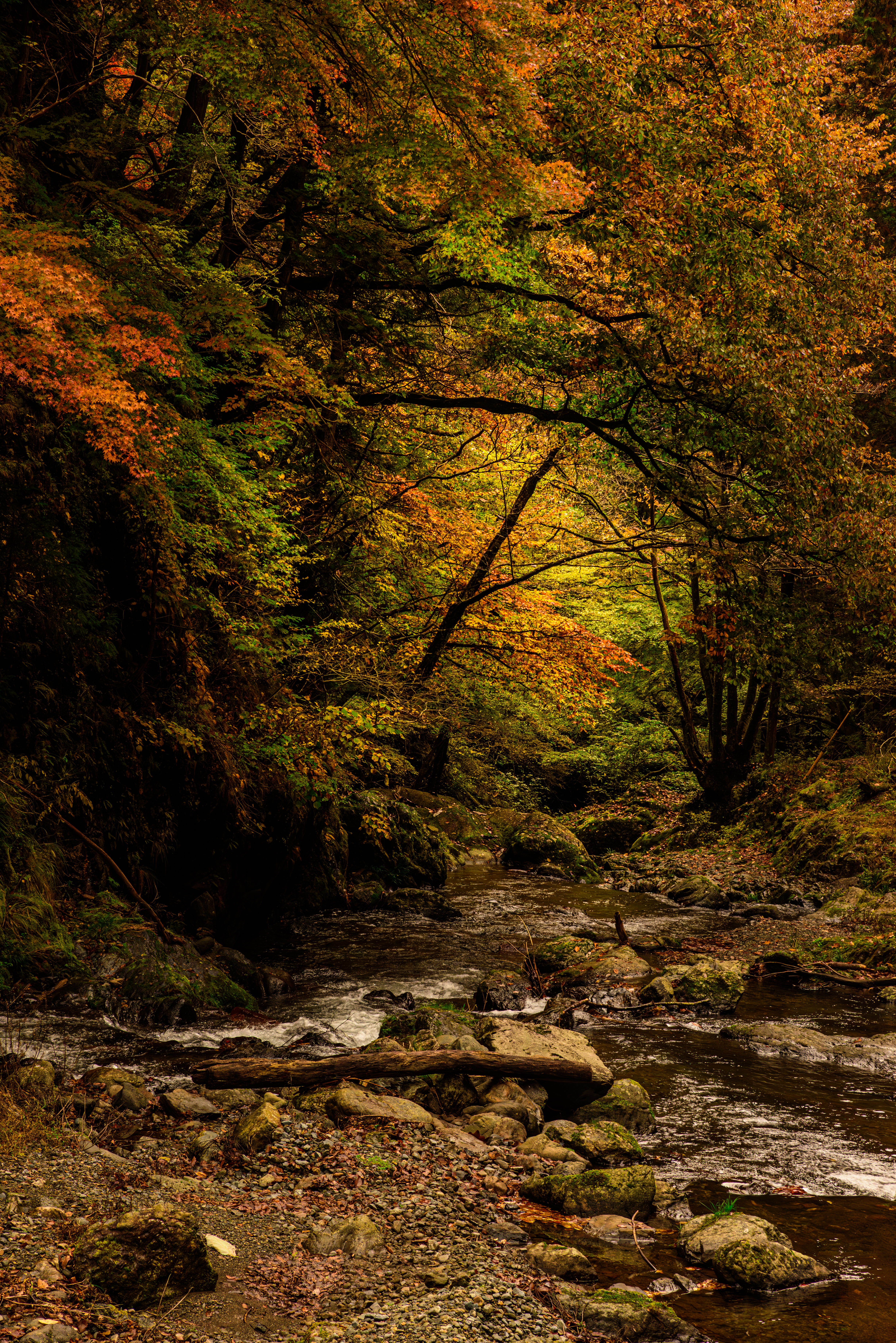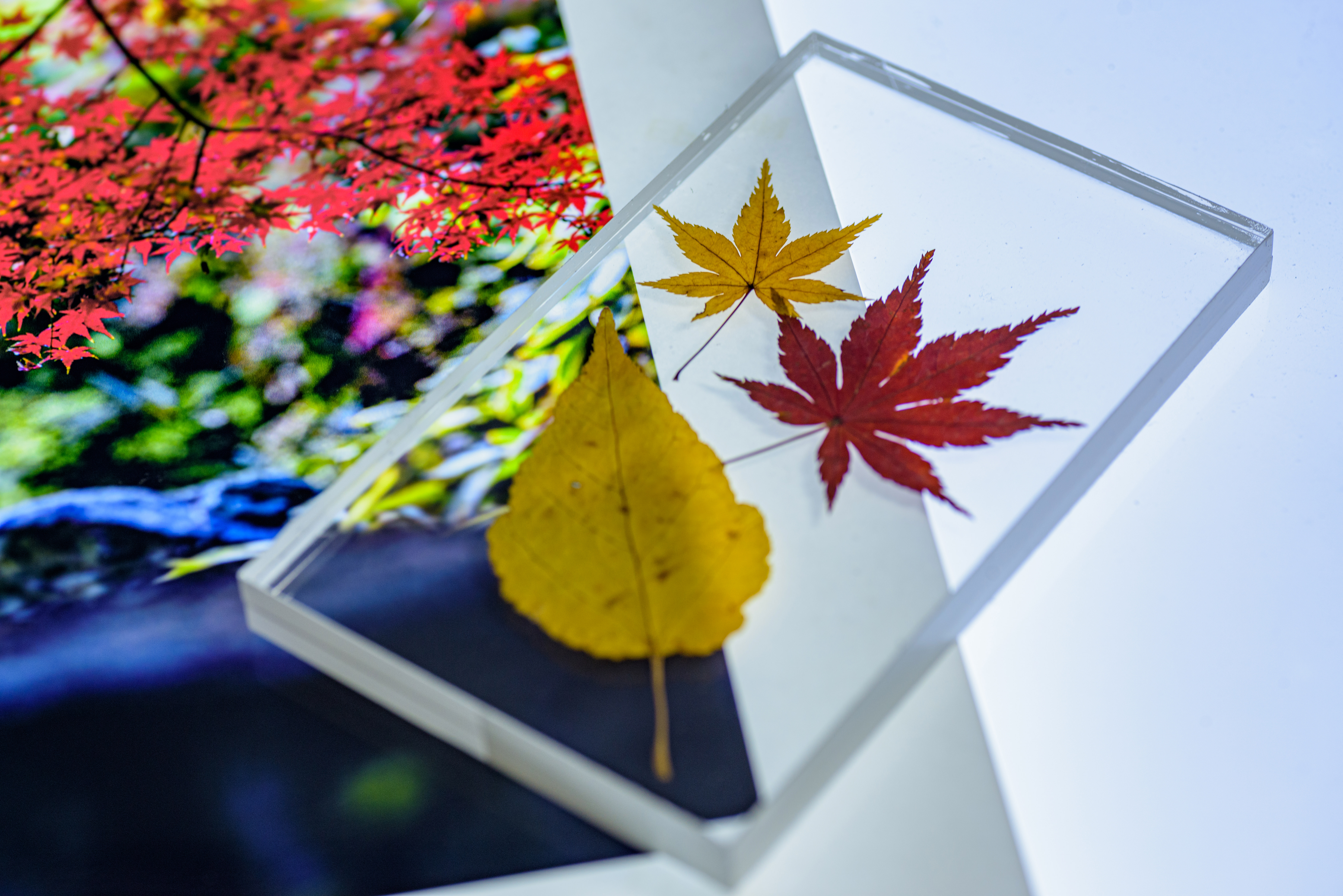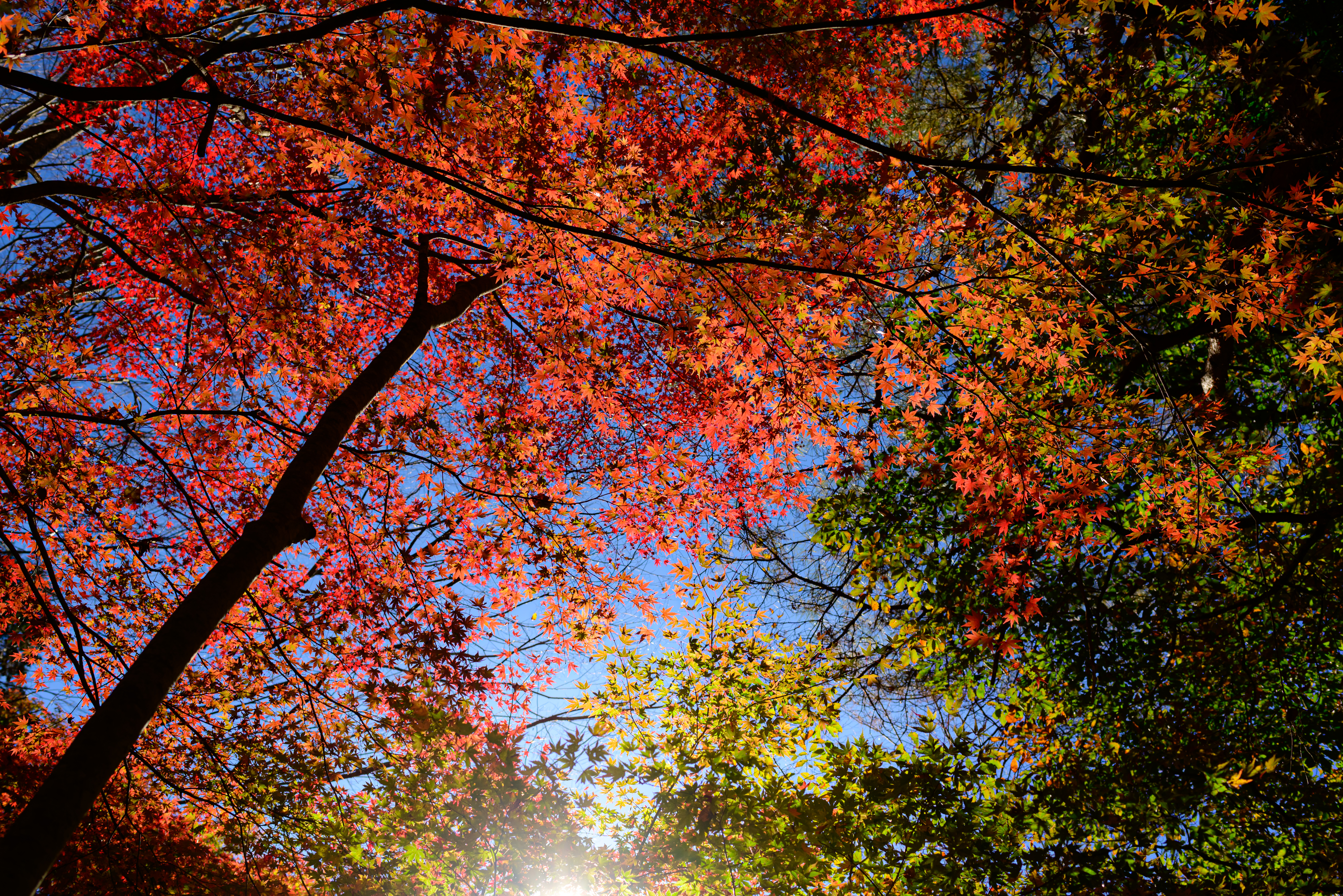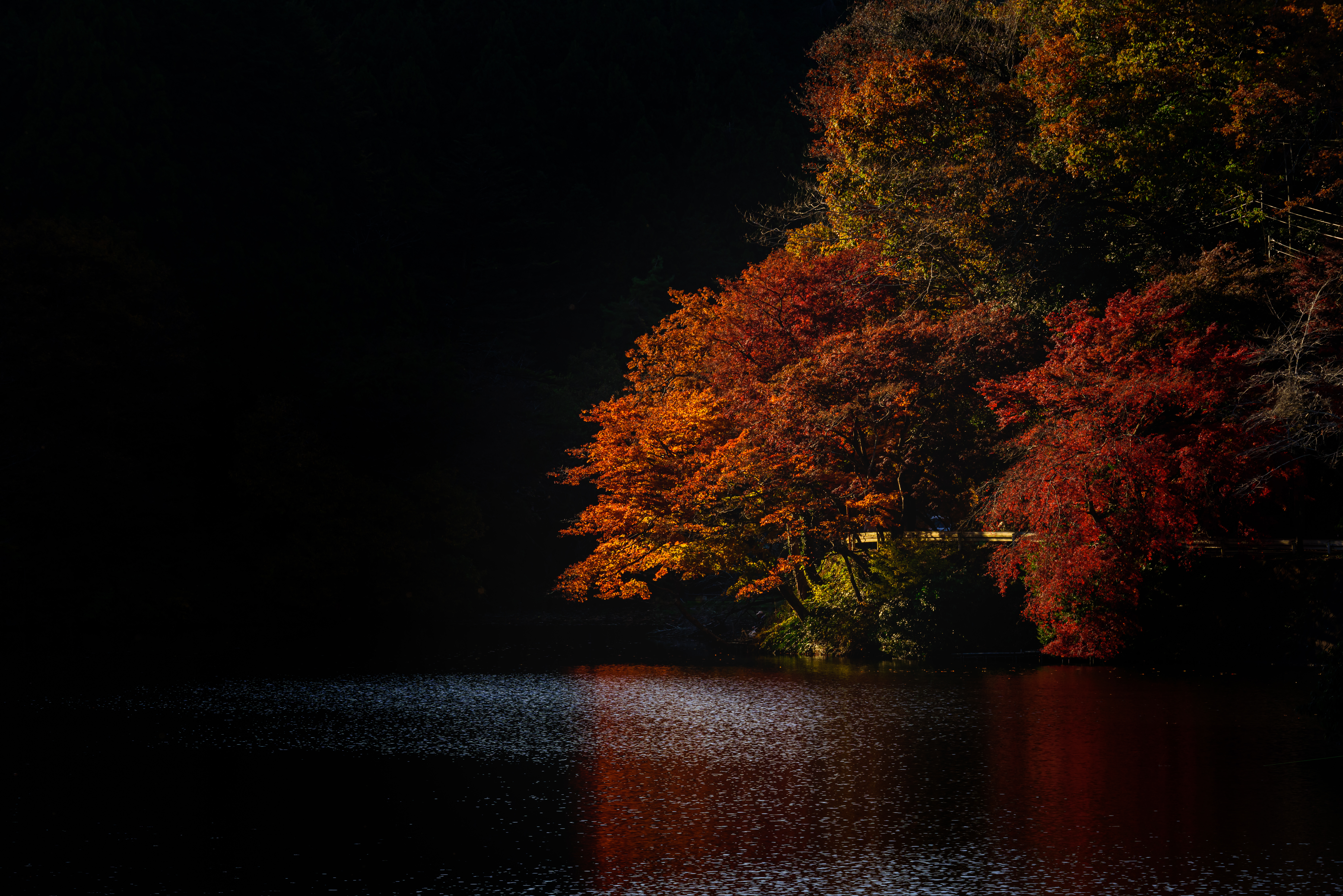色づいた葉に惹かれてカメラを向けたら玉ボケのともしびを発見。