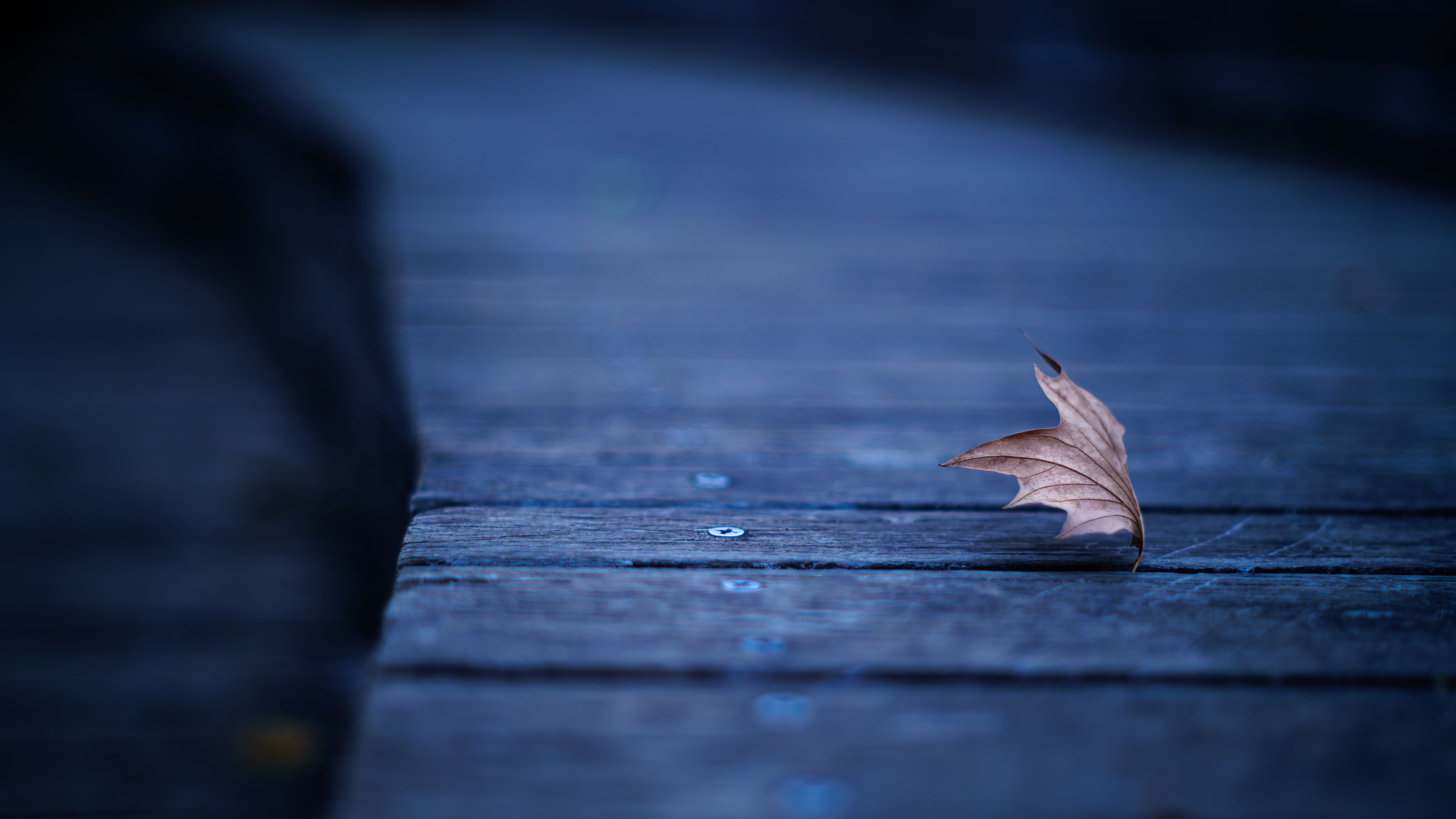 木枯らしが吹き荒れて飛んできた楓の葉がウッドデッキの隙間に引っかかったまま風が止み、霜が降りた朝です。