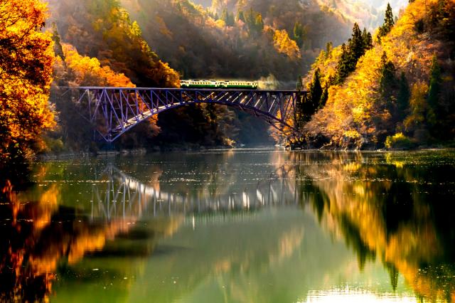 紅葉の中を列車が気持ちよさそうに走っていきました。