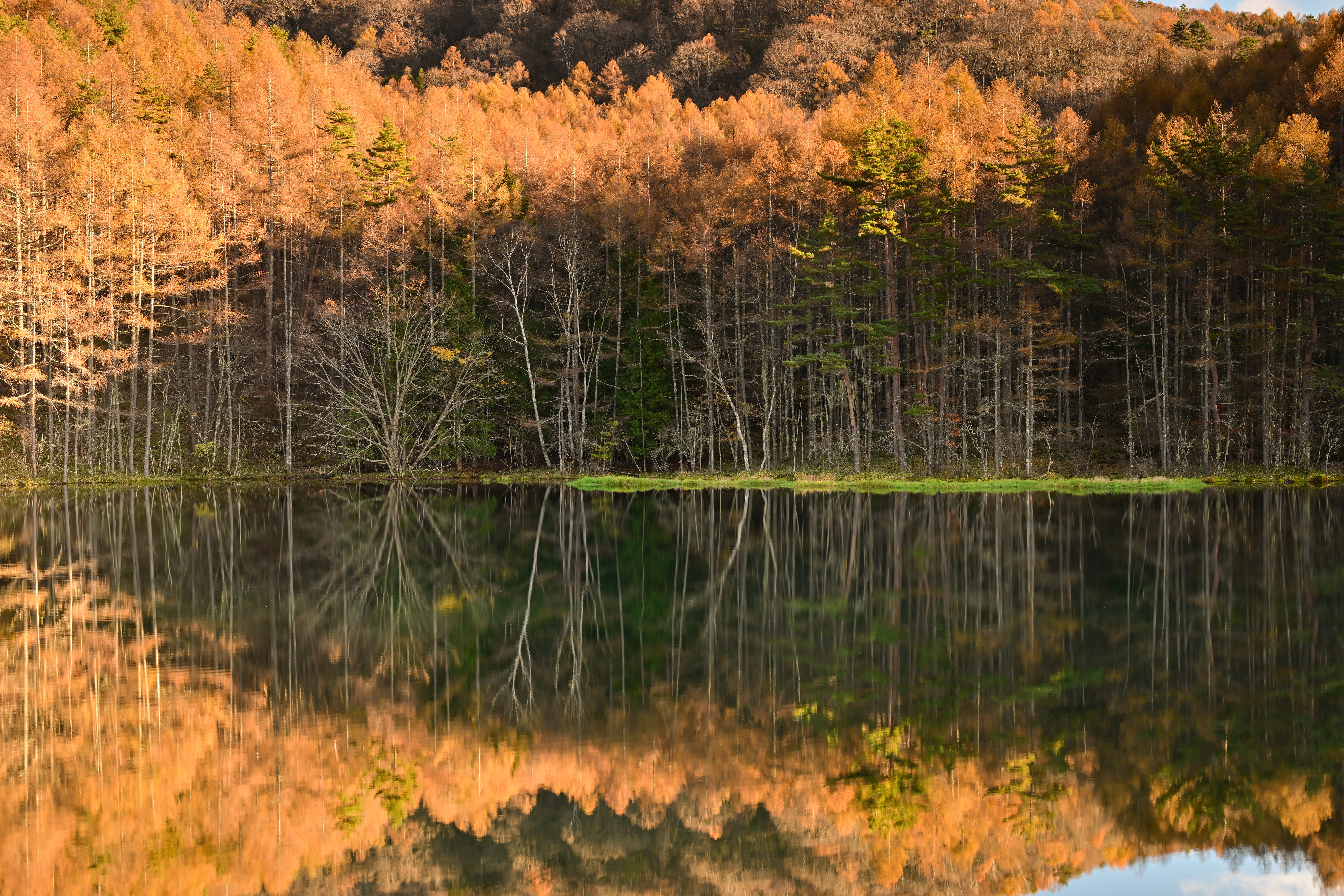 晴天時の順光となる夕刻、カラマツの黄葉が光輝く瞬間を狙いました。