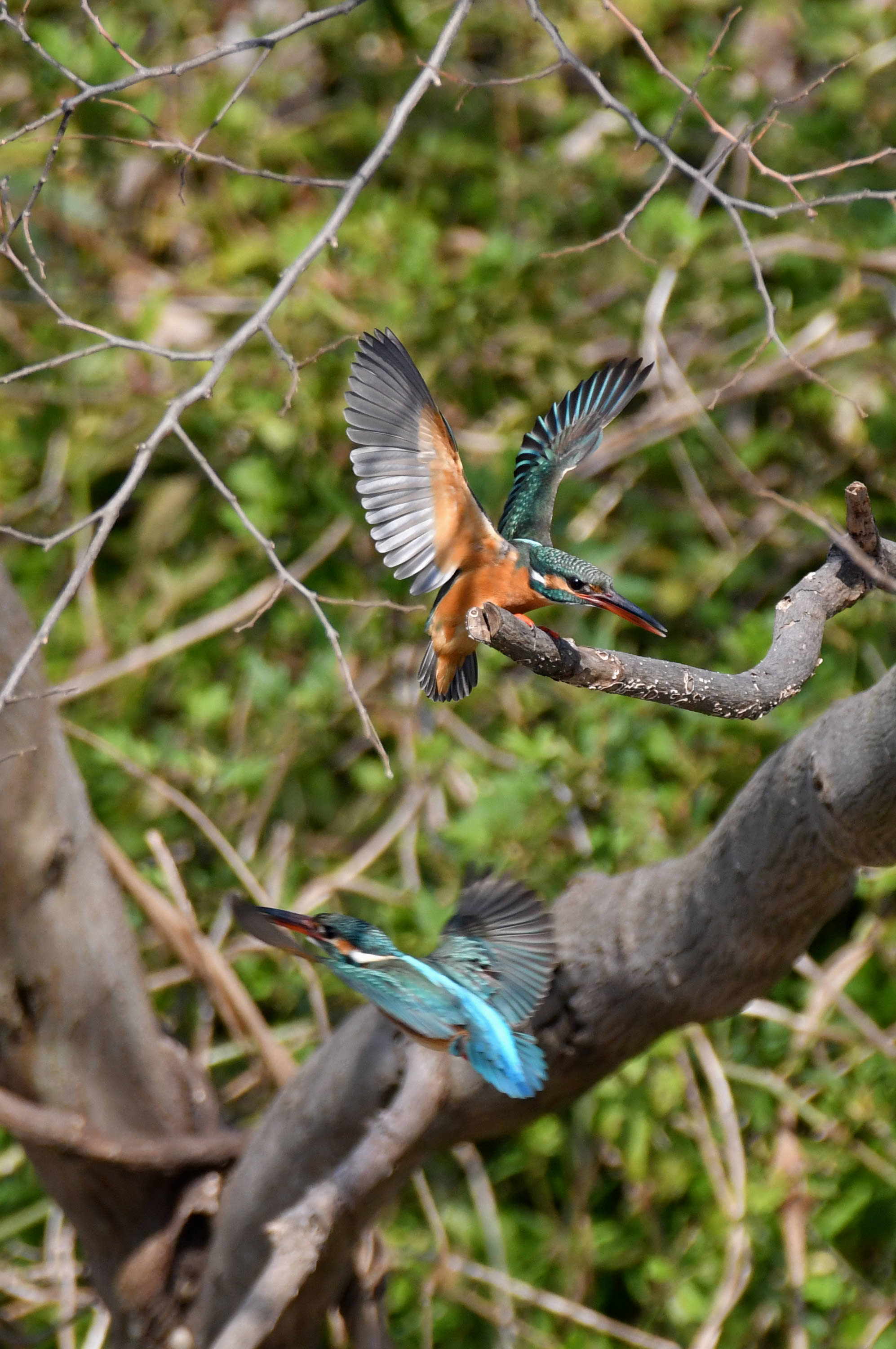 雌が枝で止まってと時に、別の雌が目の前を通過