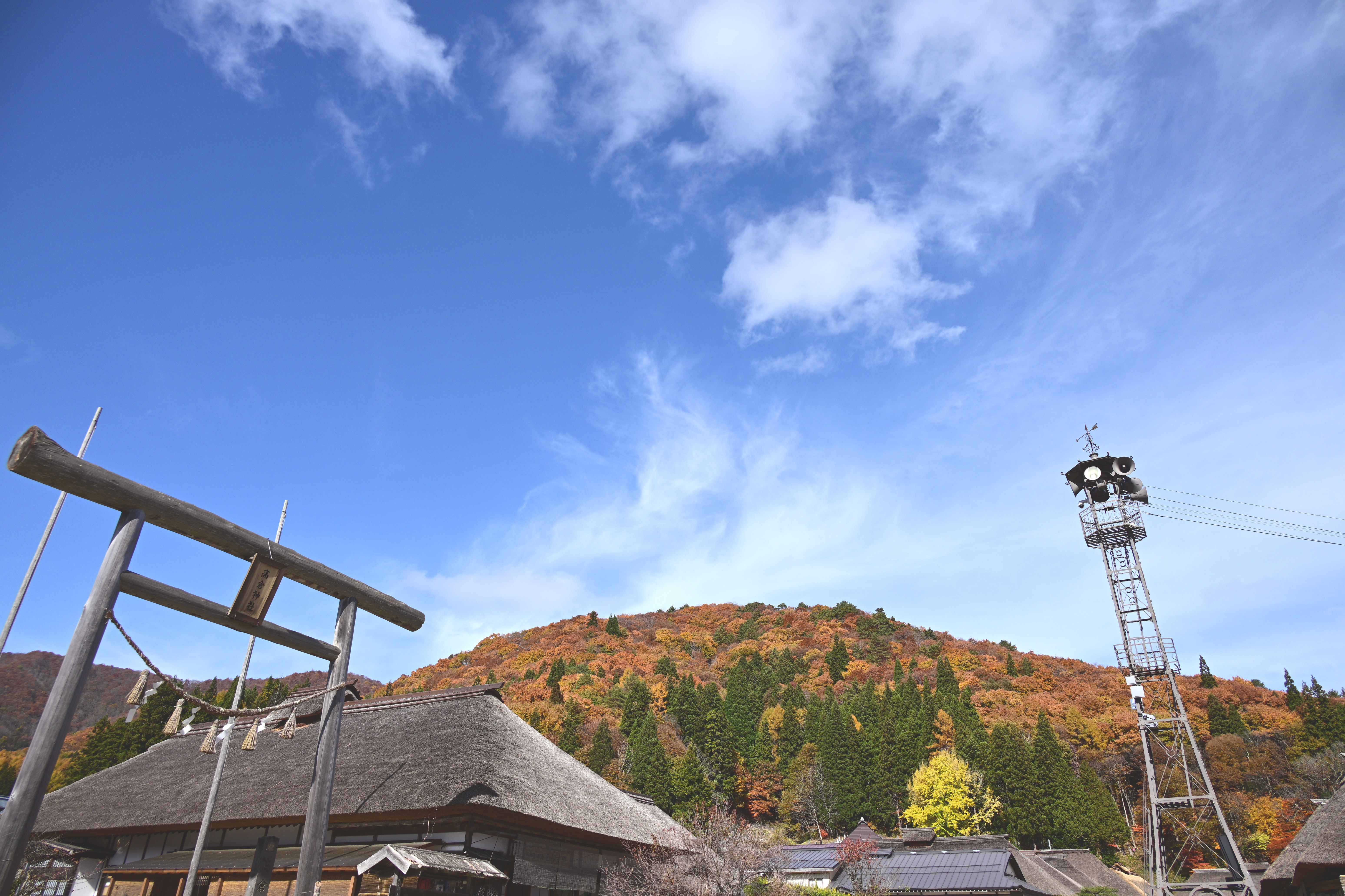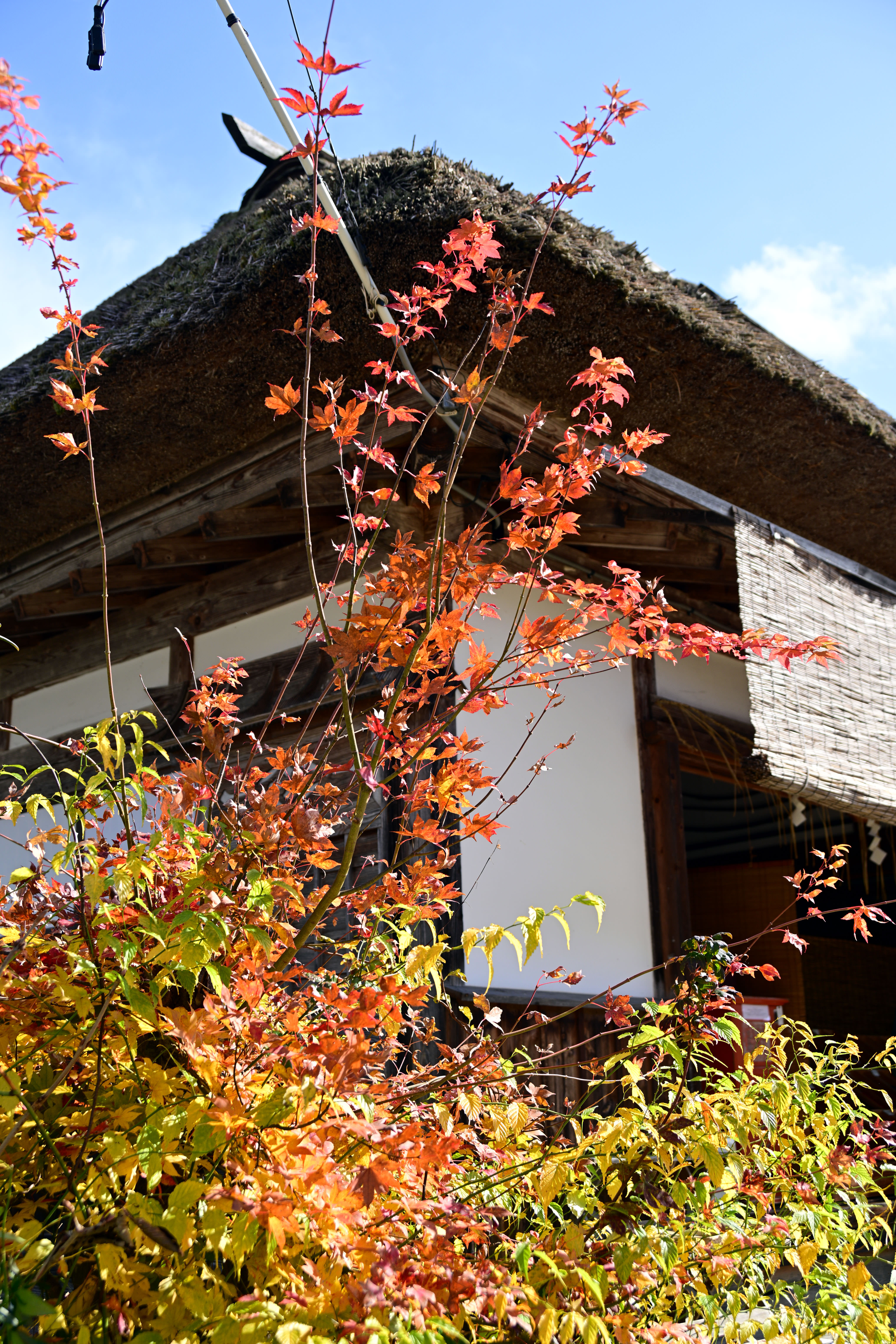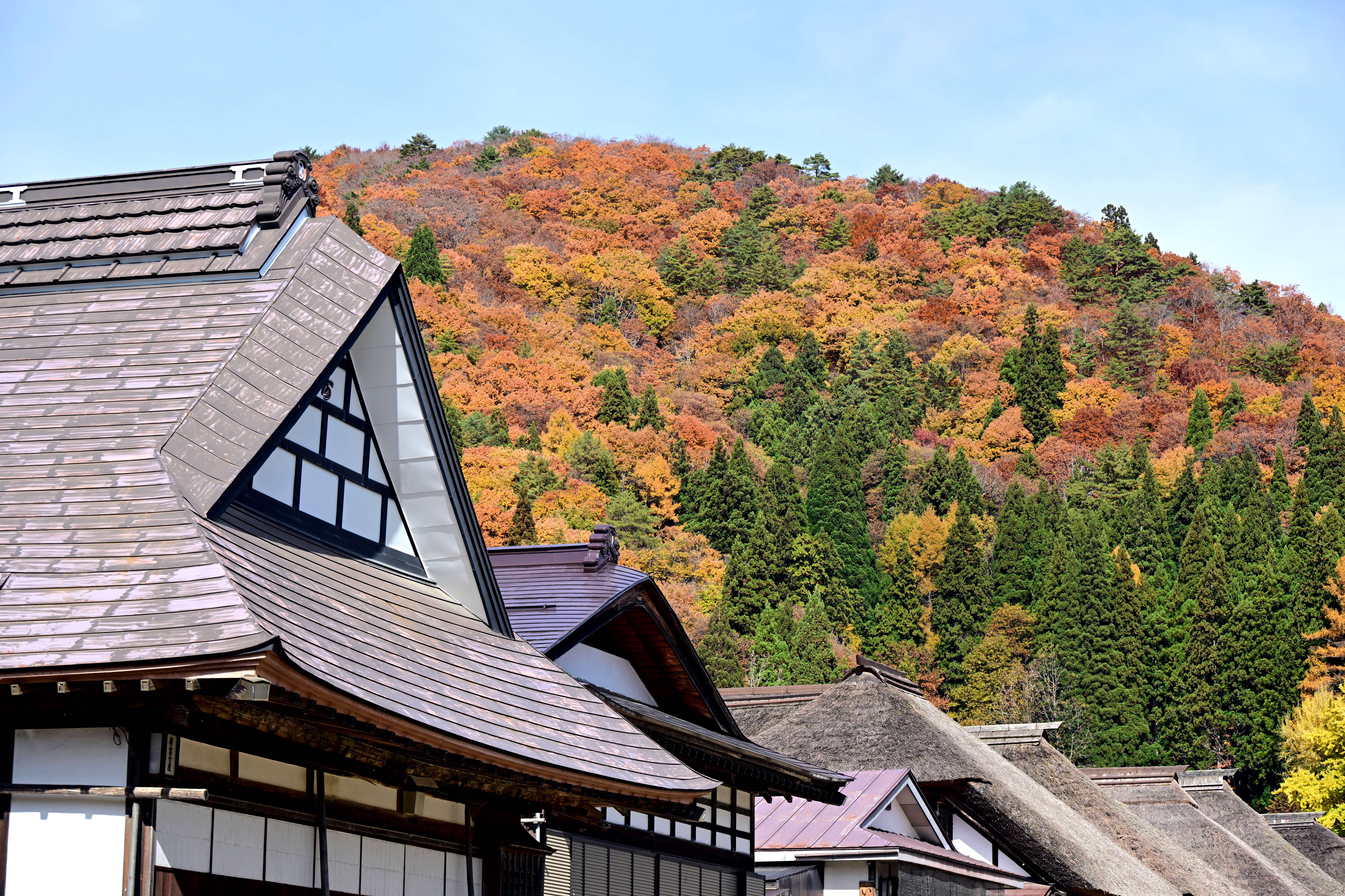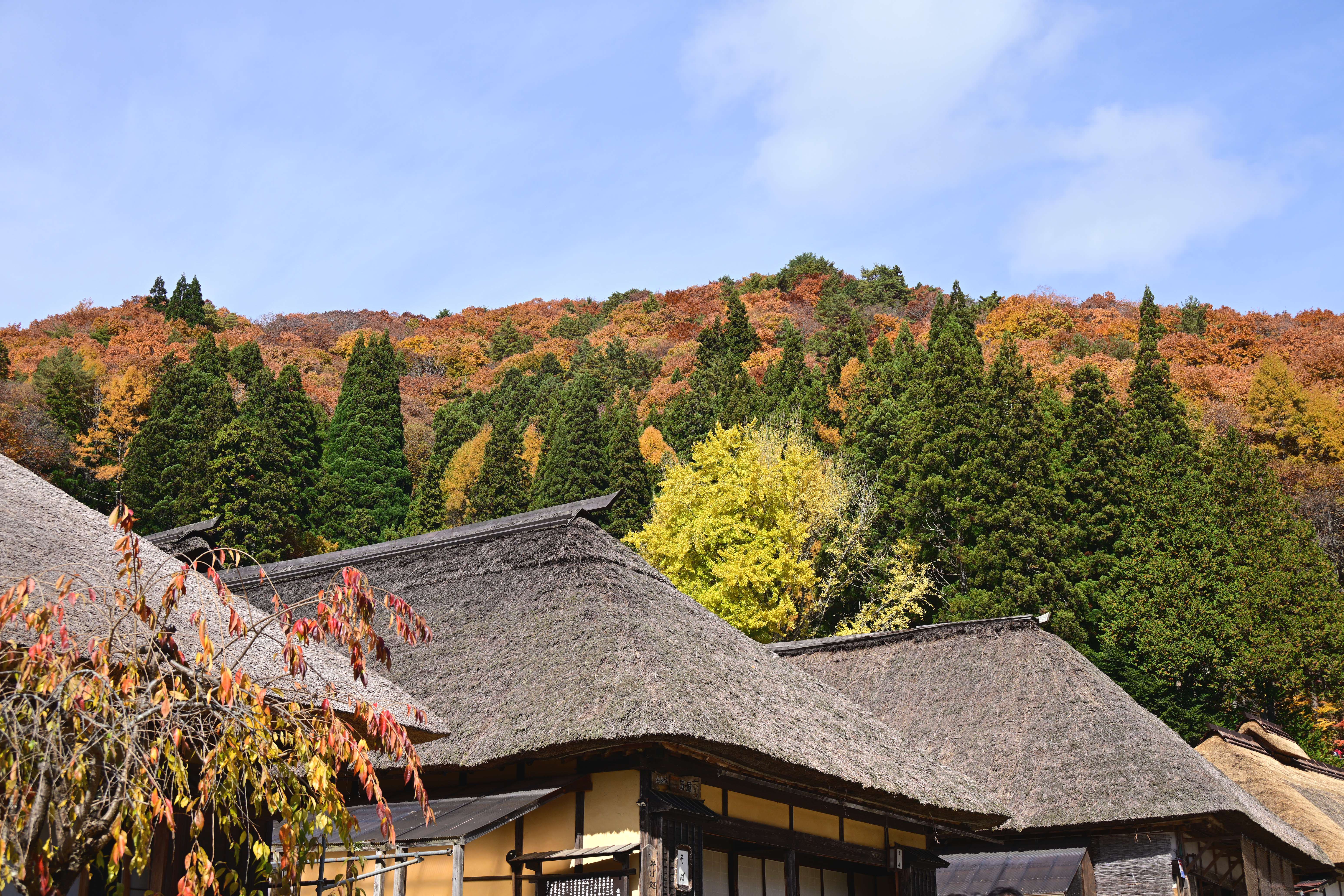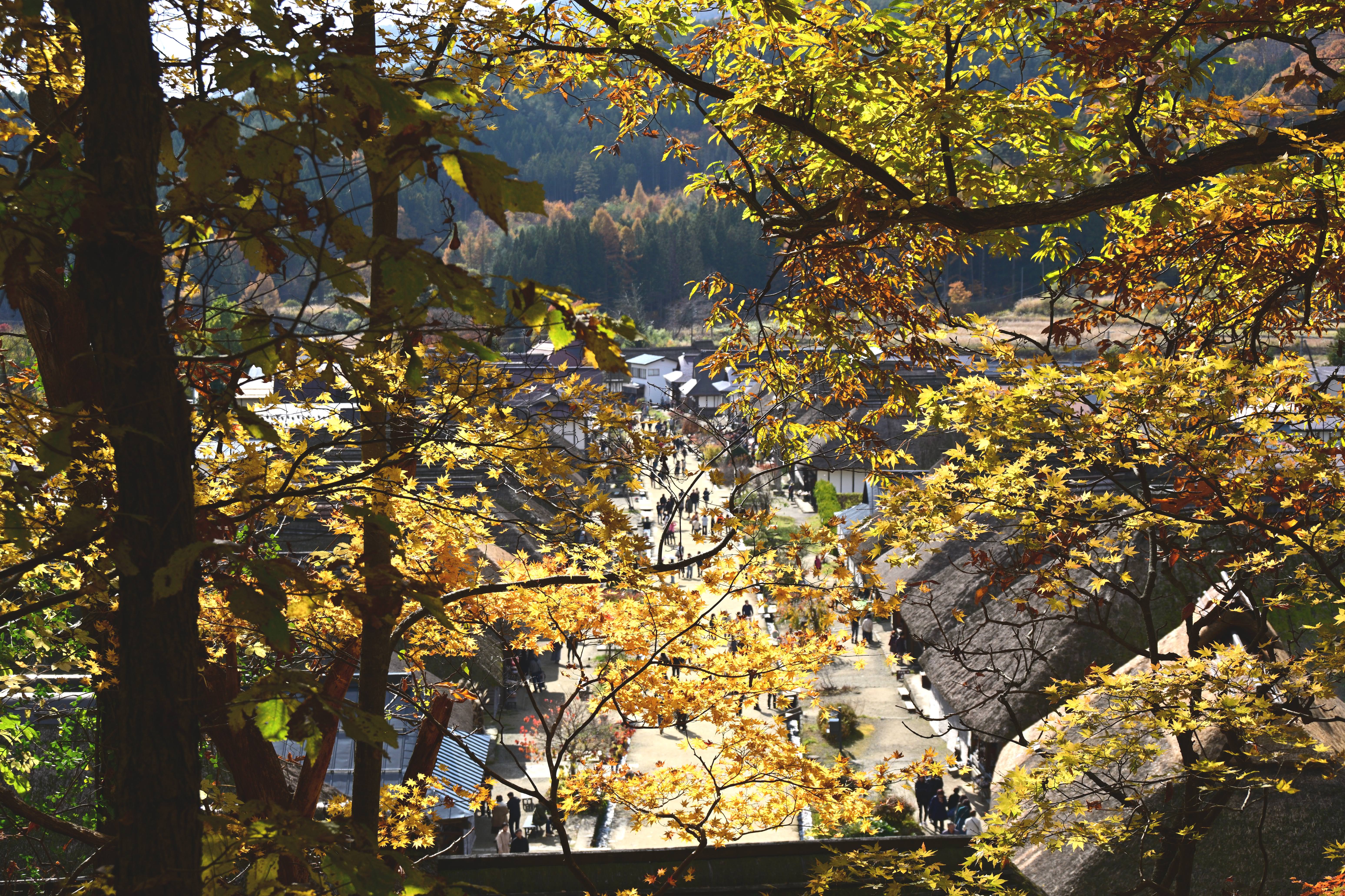 紅葉の見頃を迎えた大内宿、秋の美しい風景