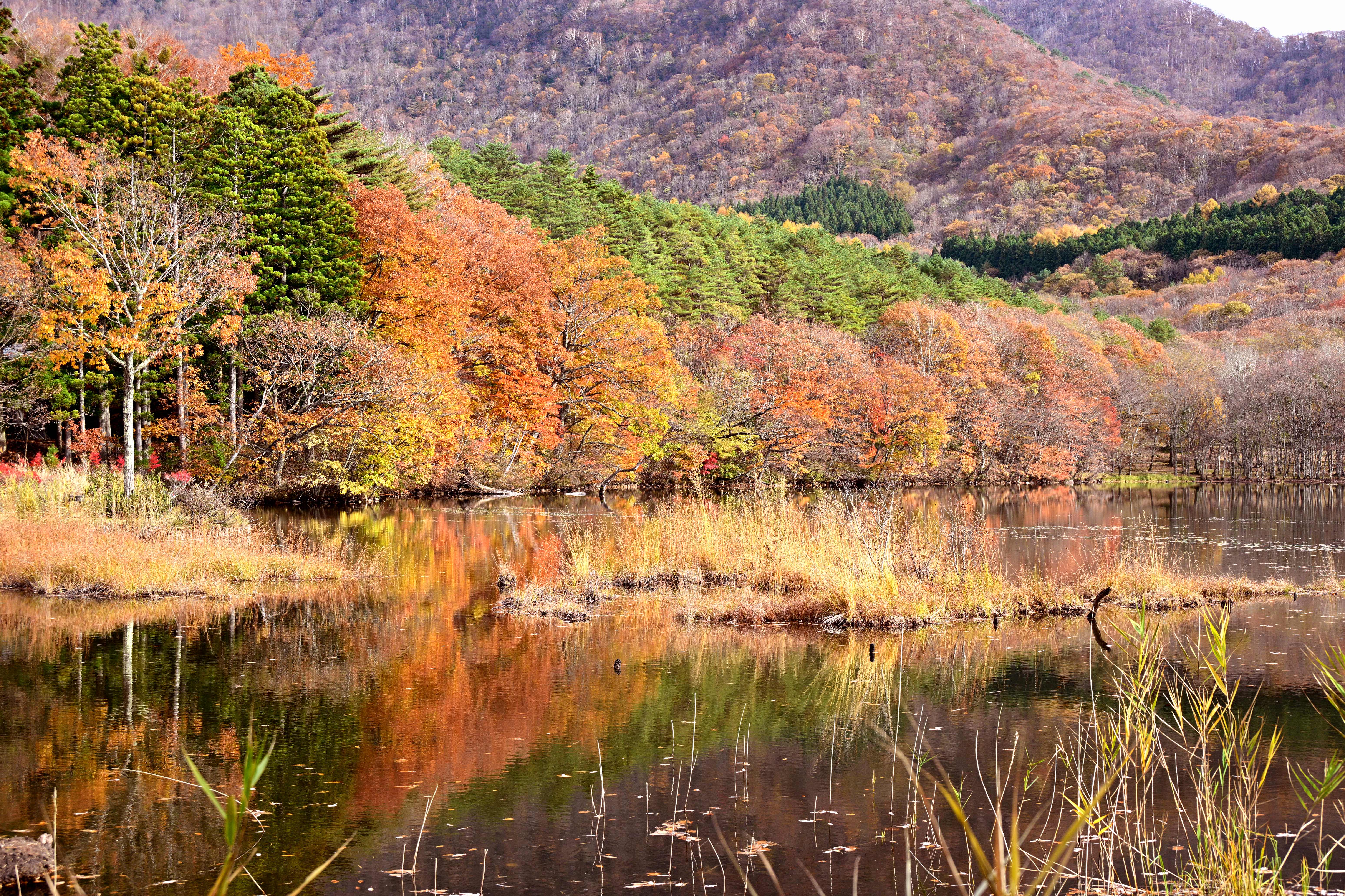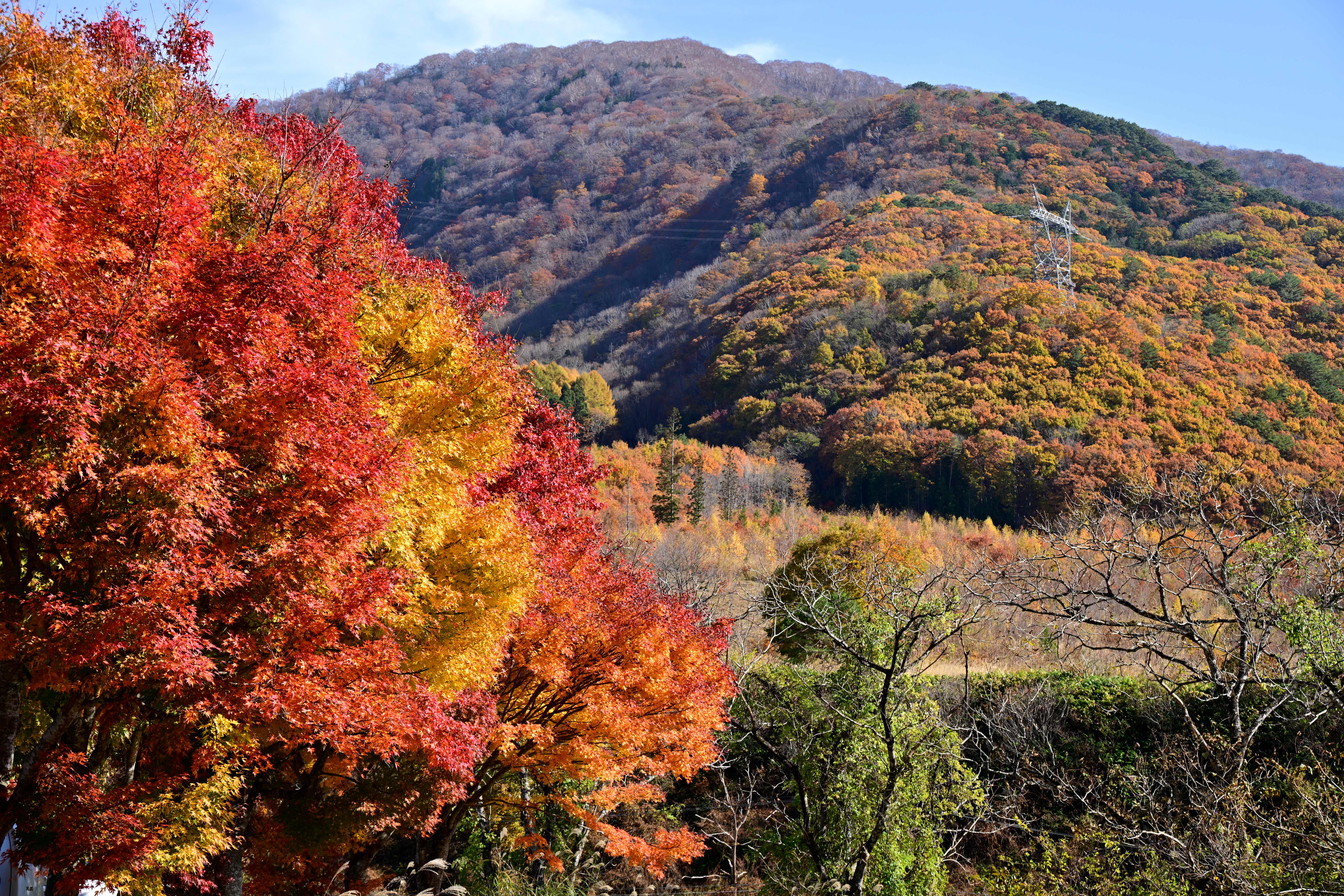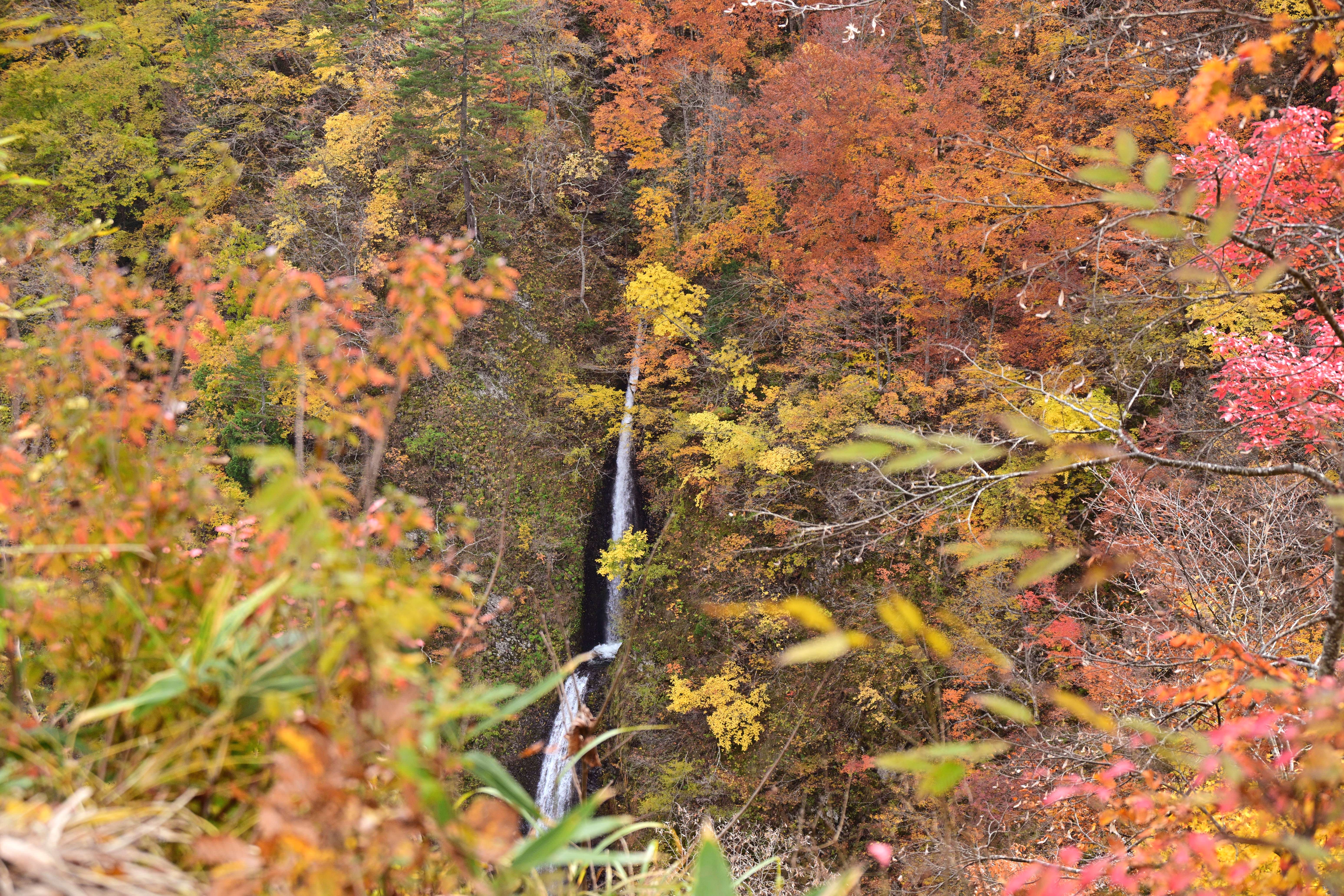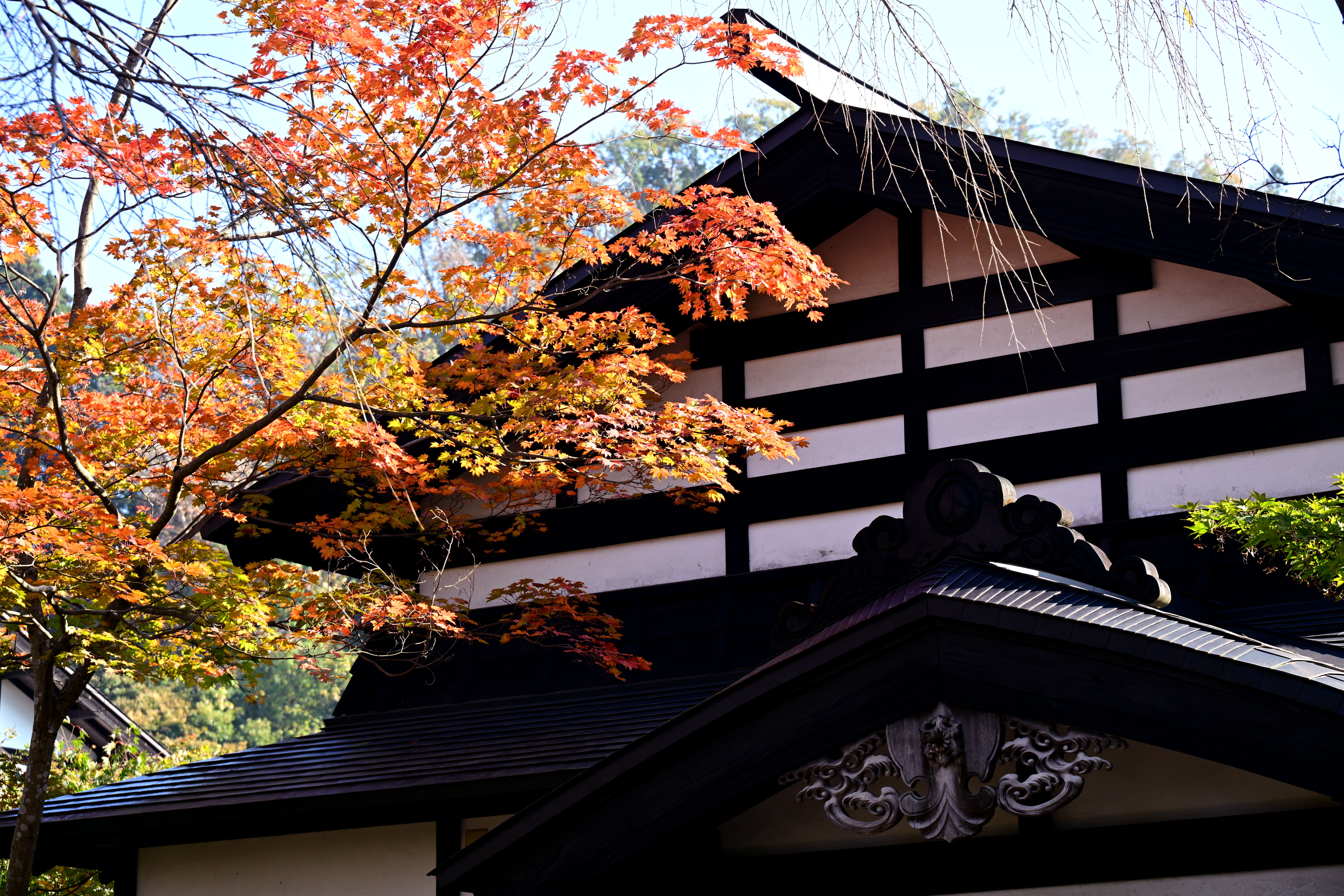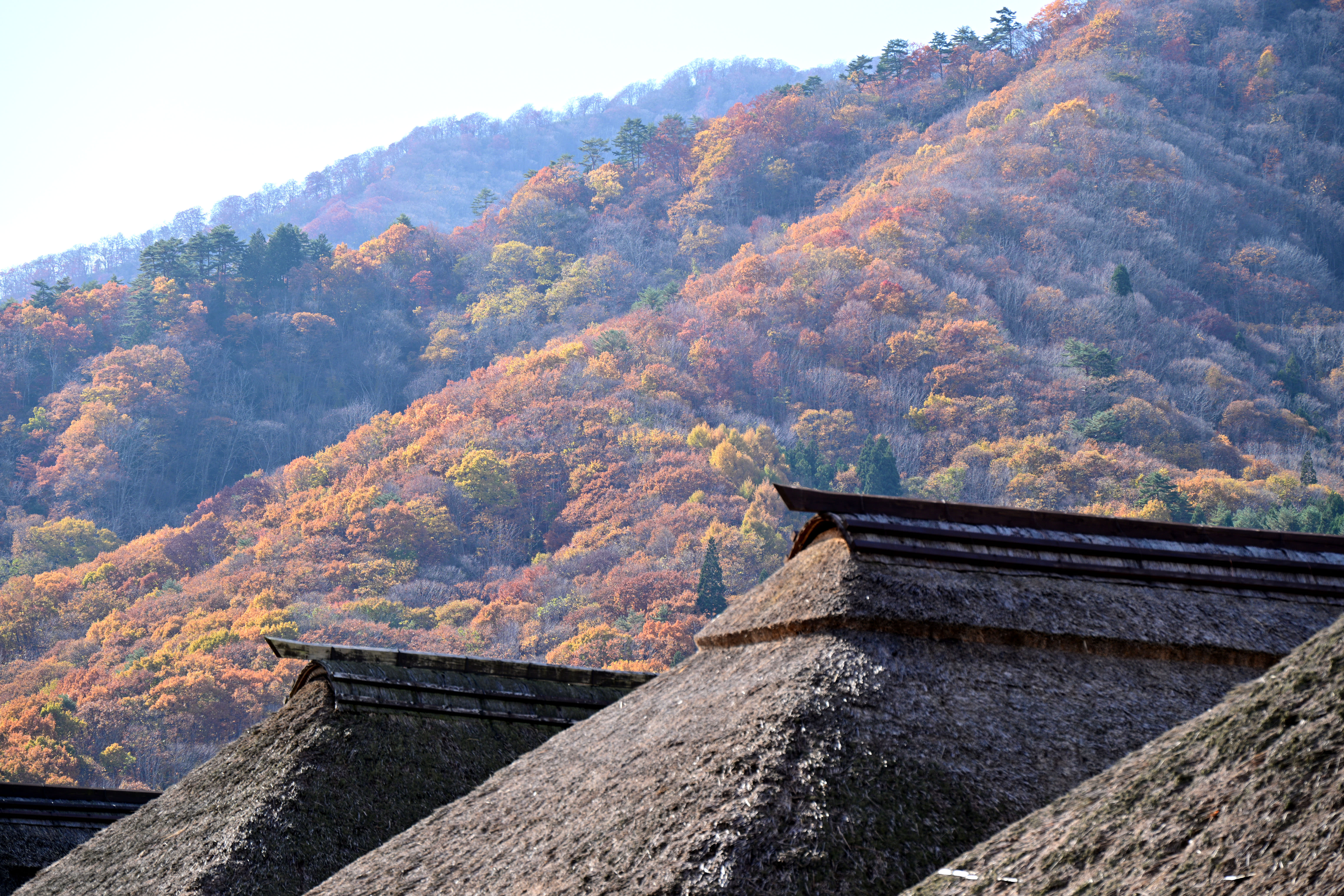 紅葉の見頃を迎えた大内宿、秋の美しい風景