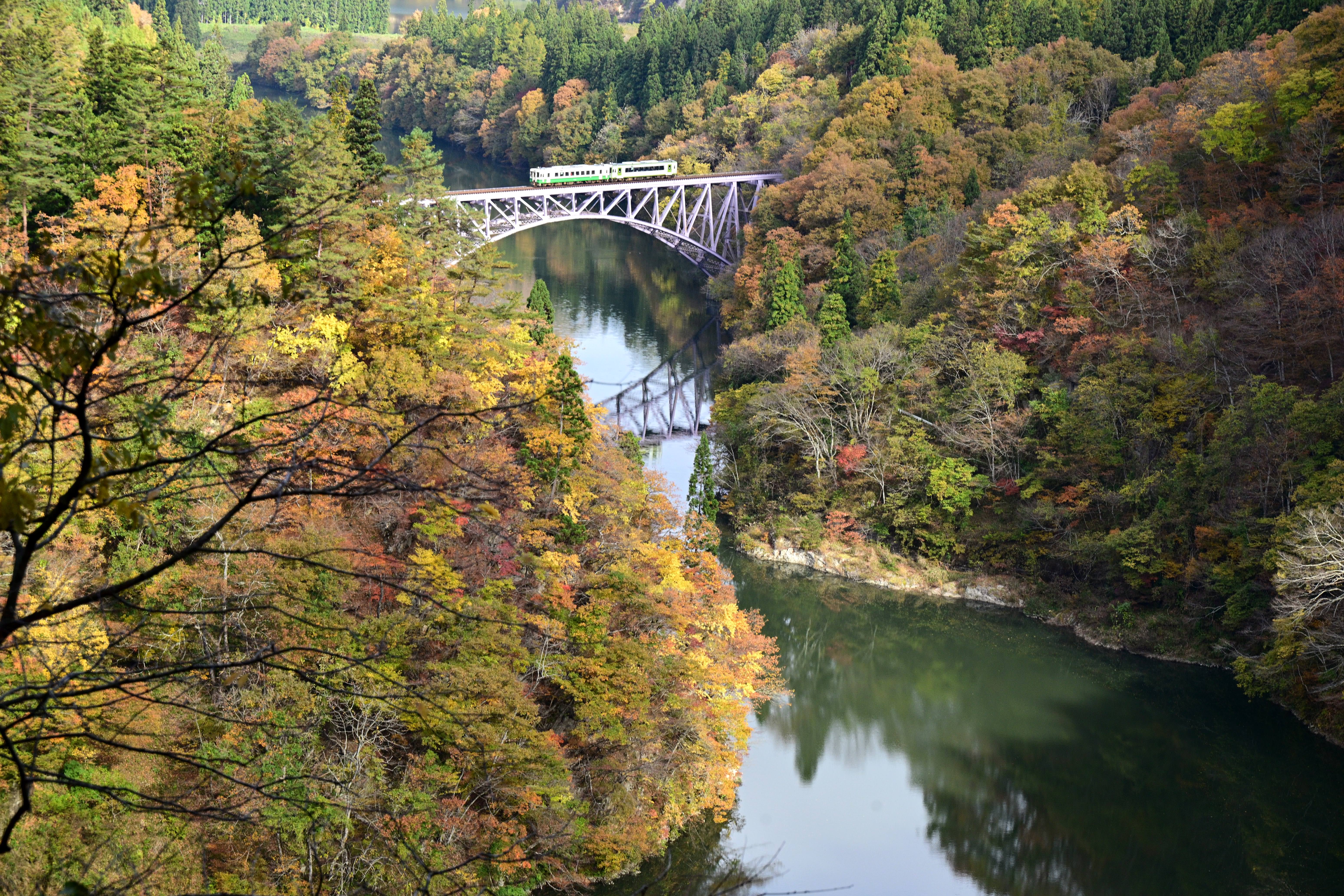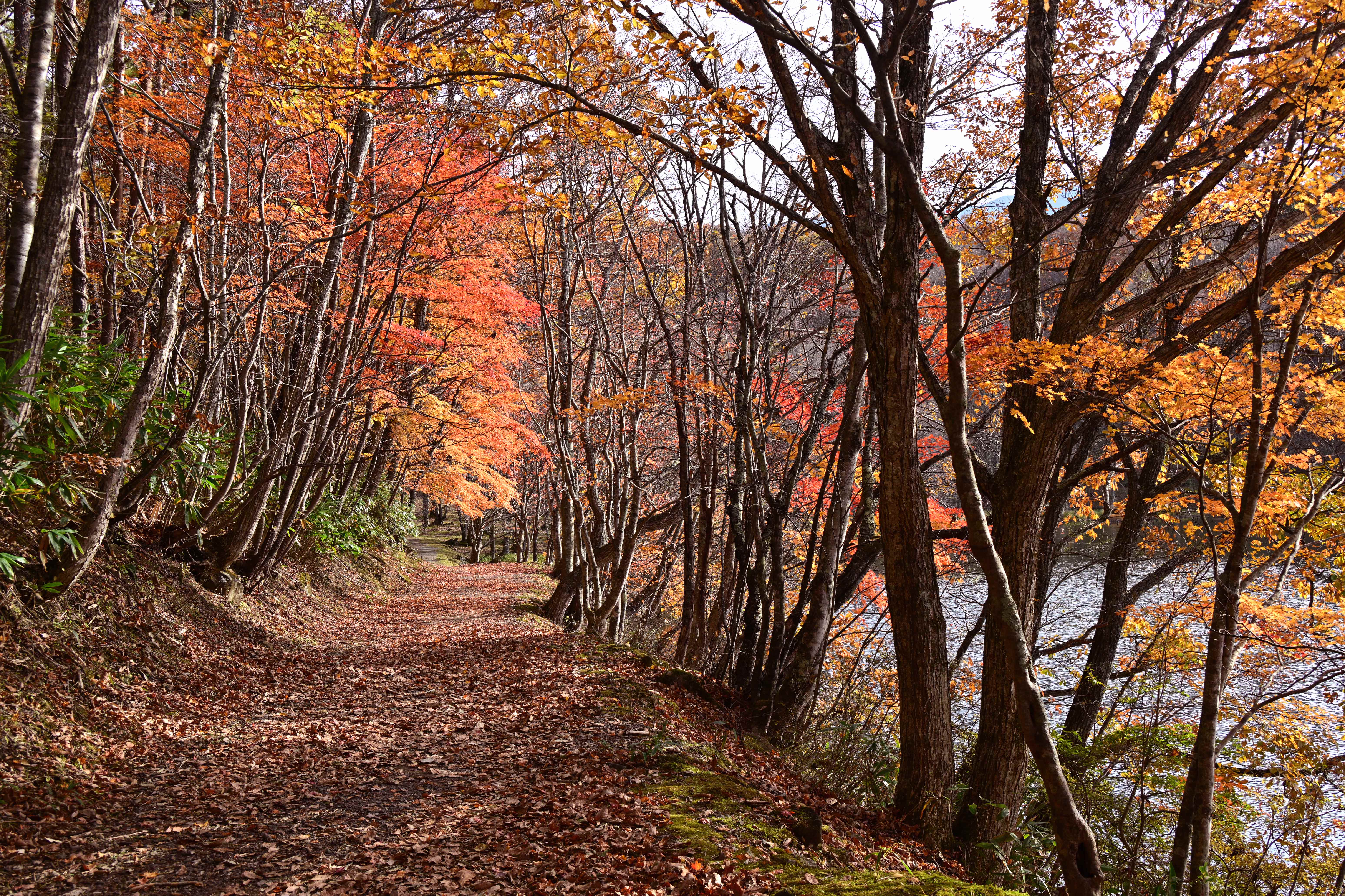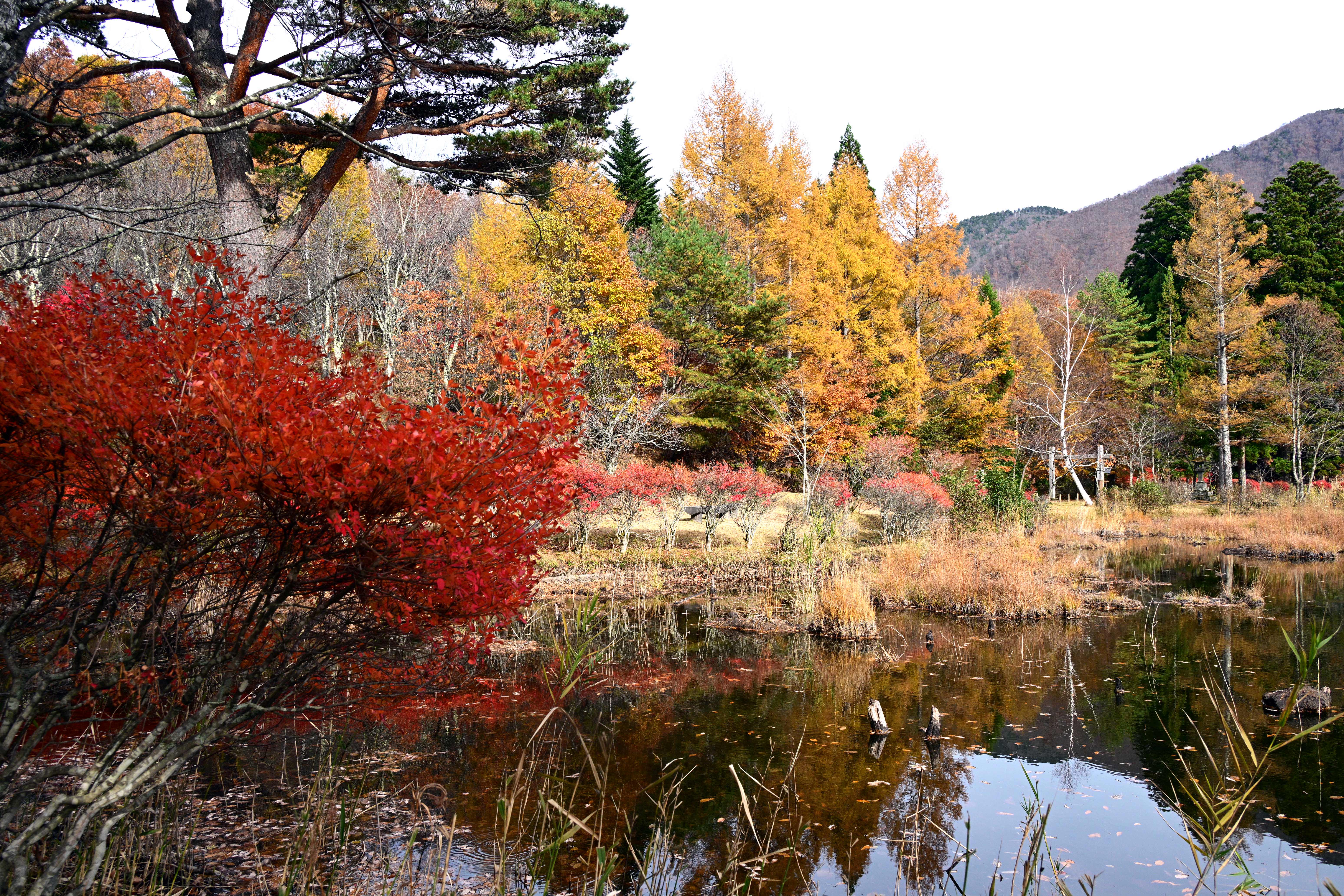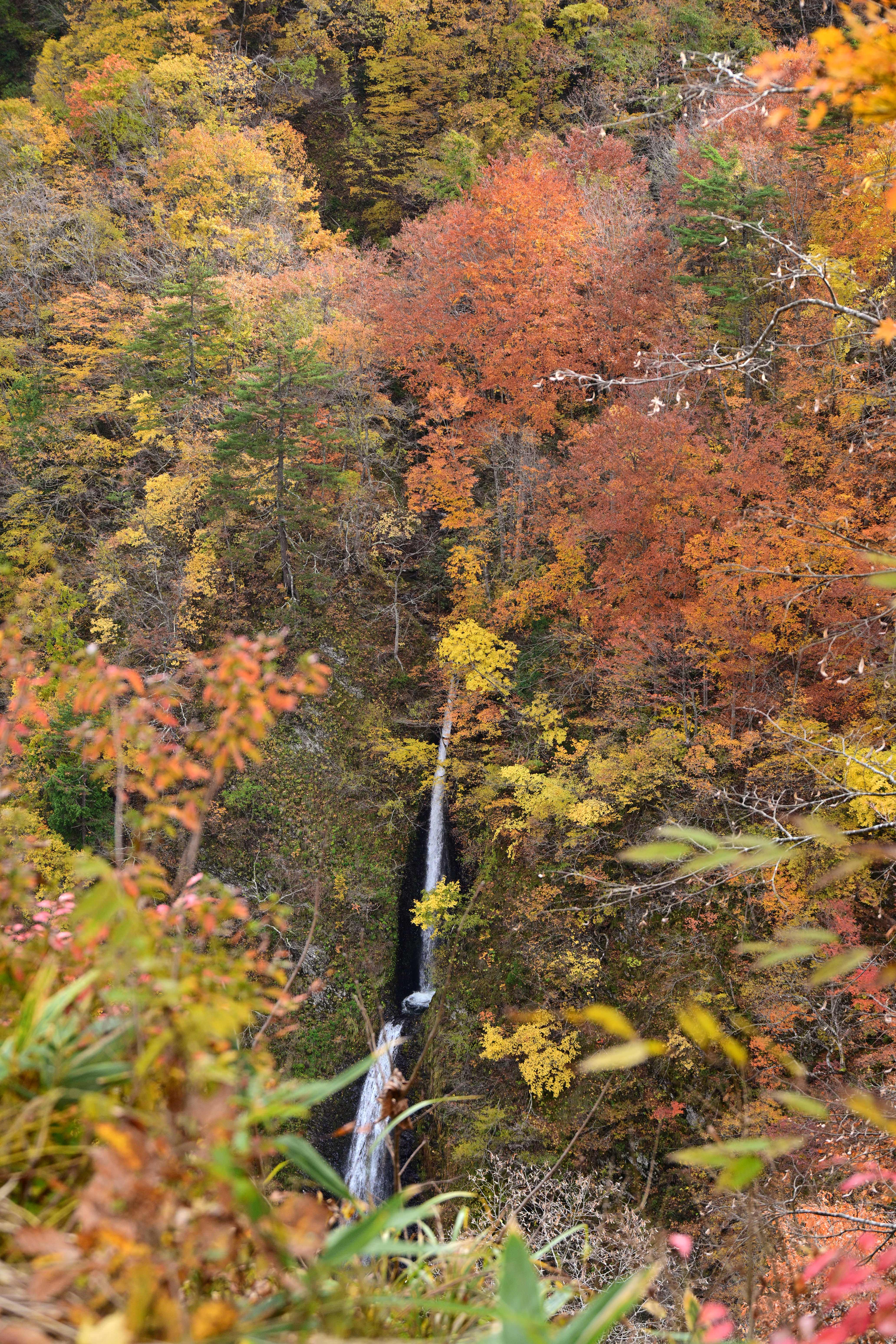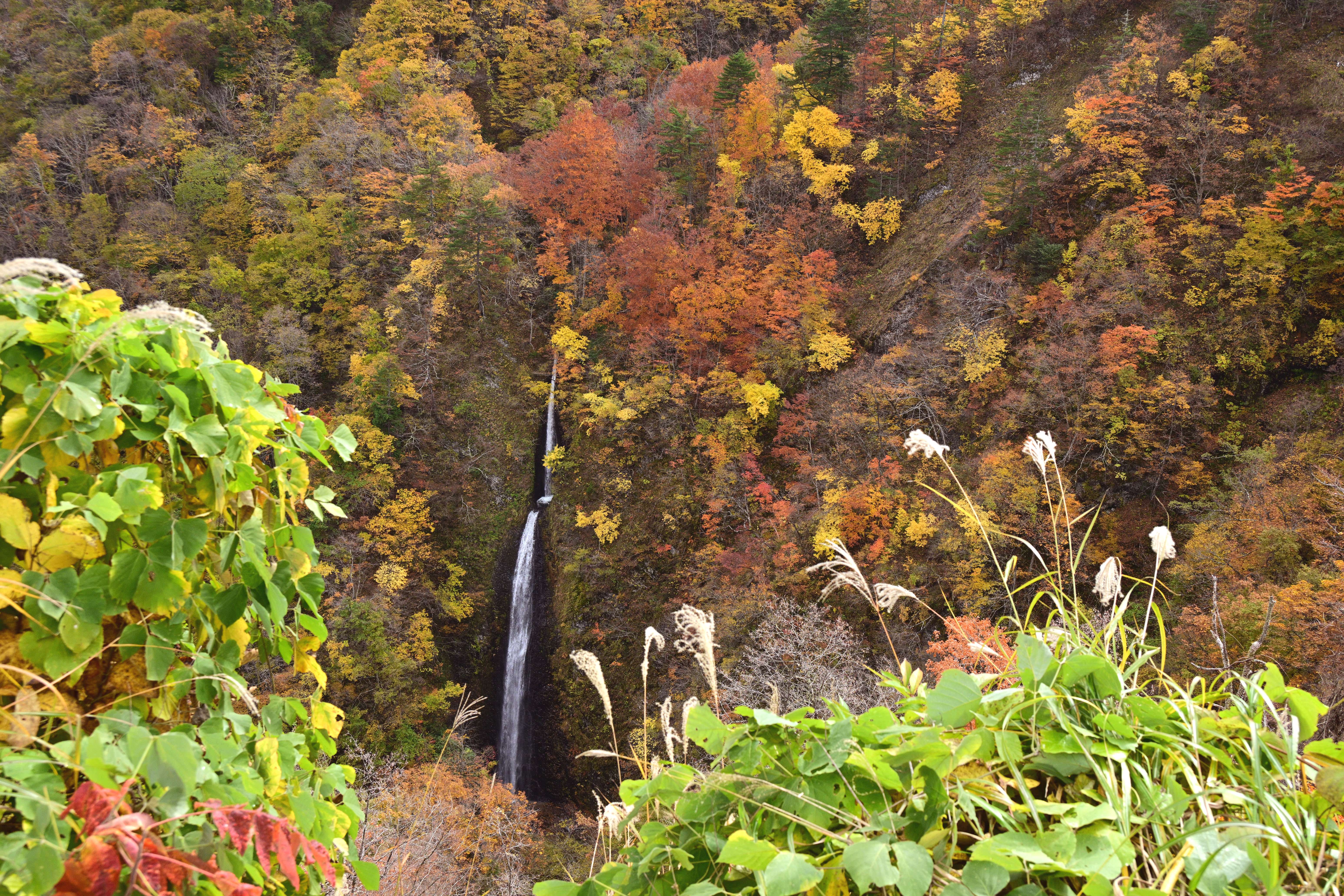 紅葉の見頃を迎えた大内宿、秋の美しい風景