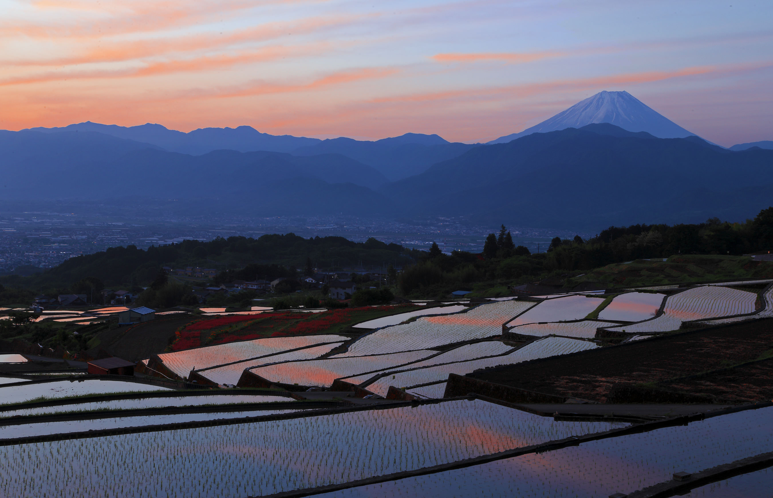朝焼けが棚田に投影され、富士山が向こうに少しだけ、頭をだしました