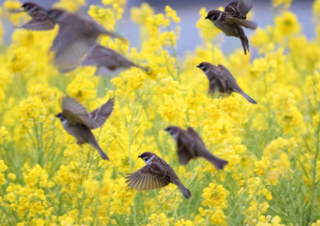 武庫川の菜の花畑に隠れるスズメ