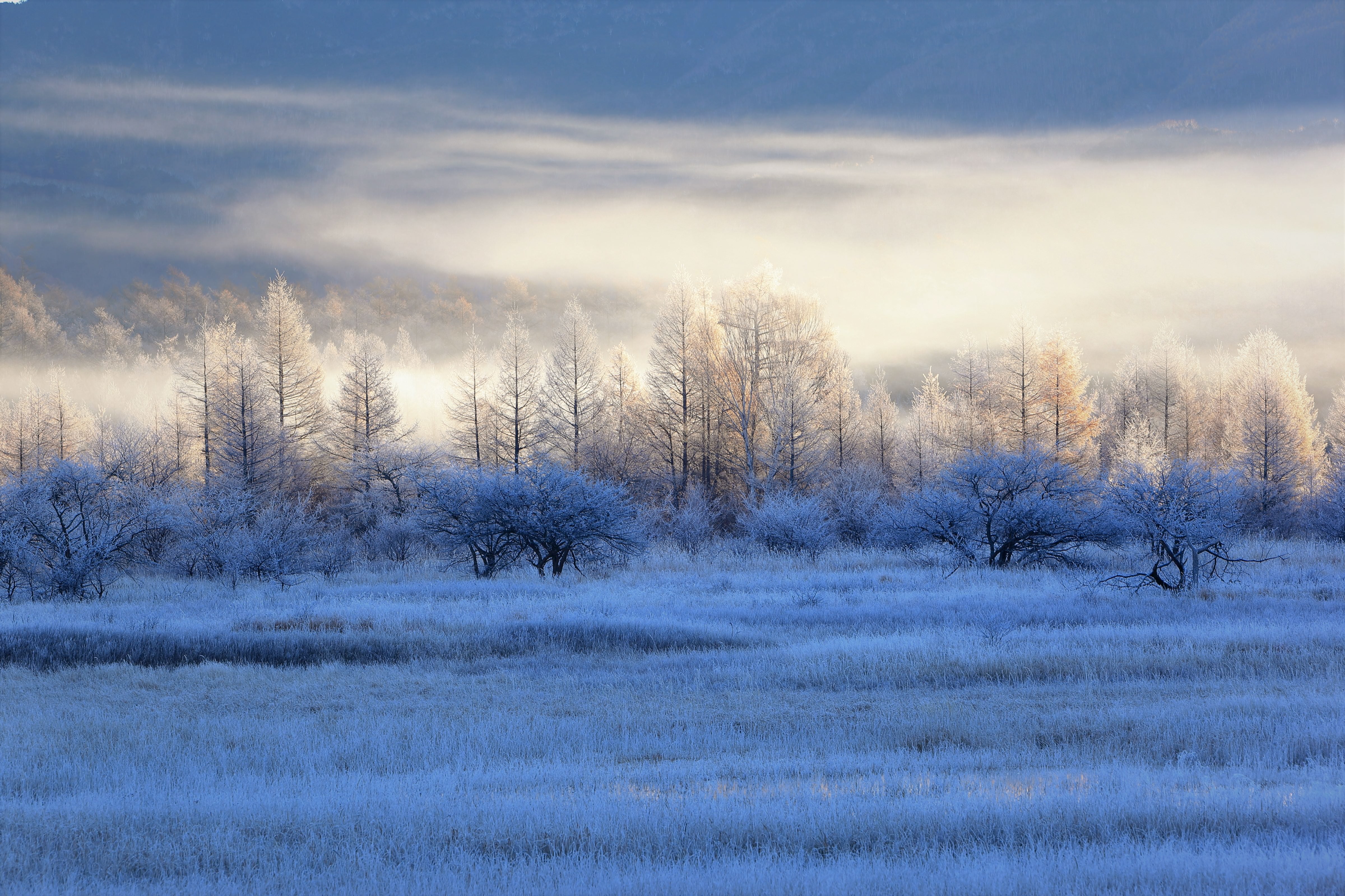 初めての場所で霧氷に出会えました。霧も突然現れ驚きマイナス4度の体験二回目はでません・・その時の白川郷です。