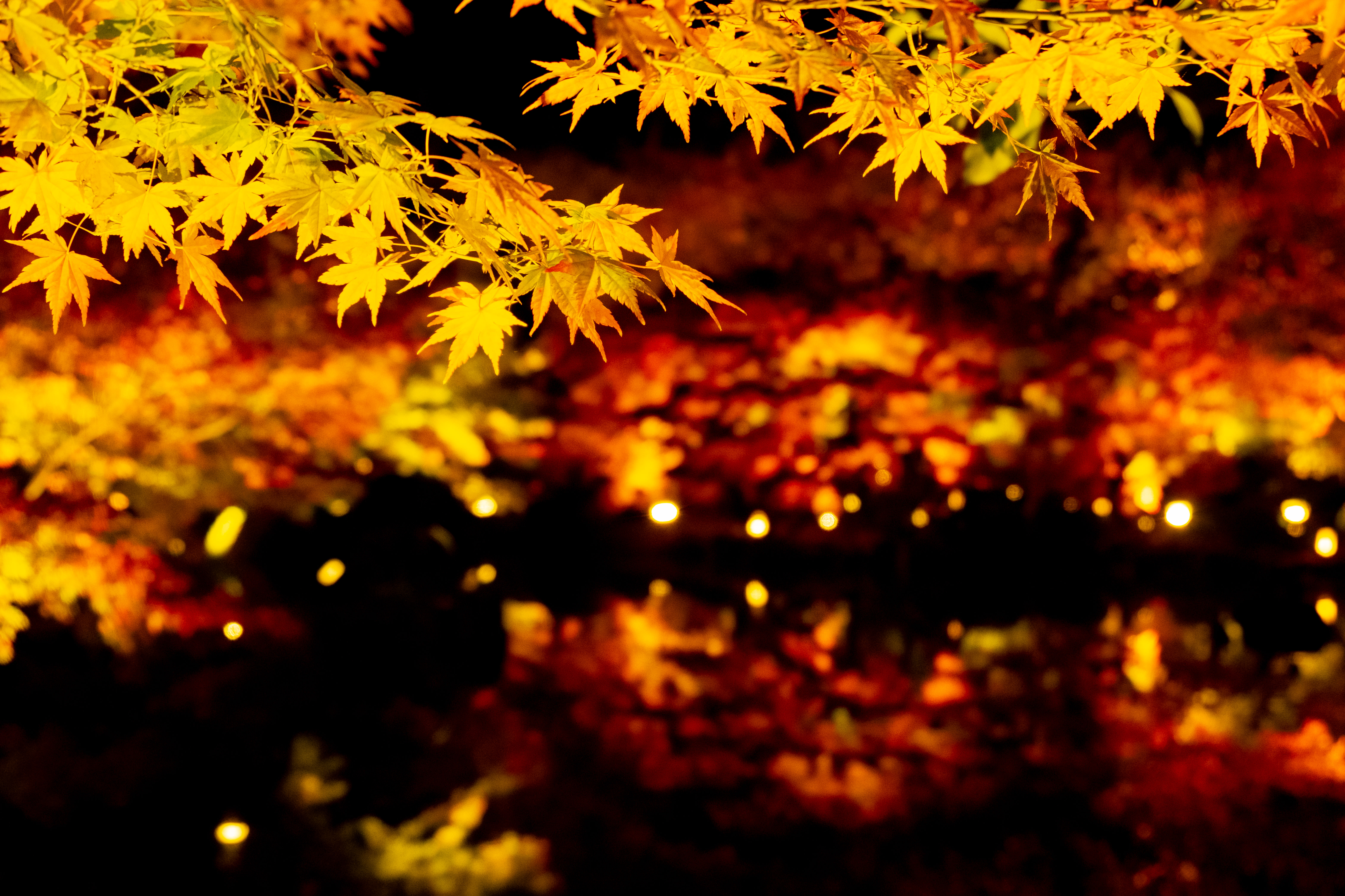 池に写った紅葉が花火のようです。