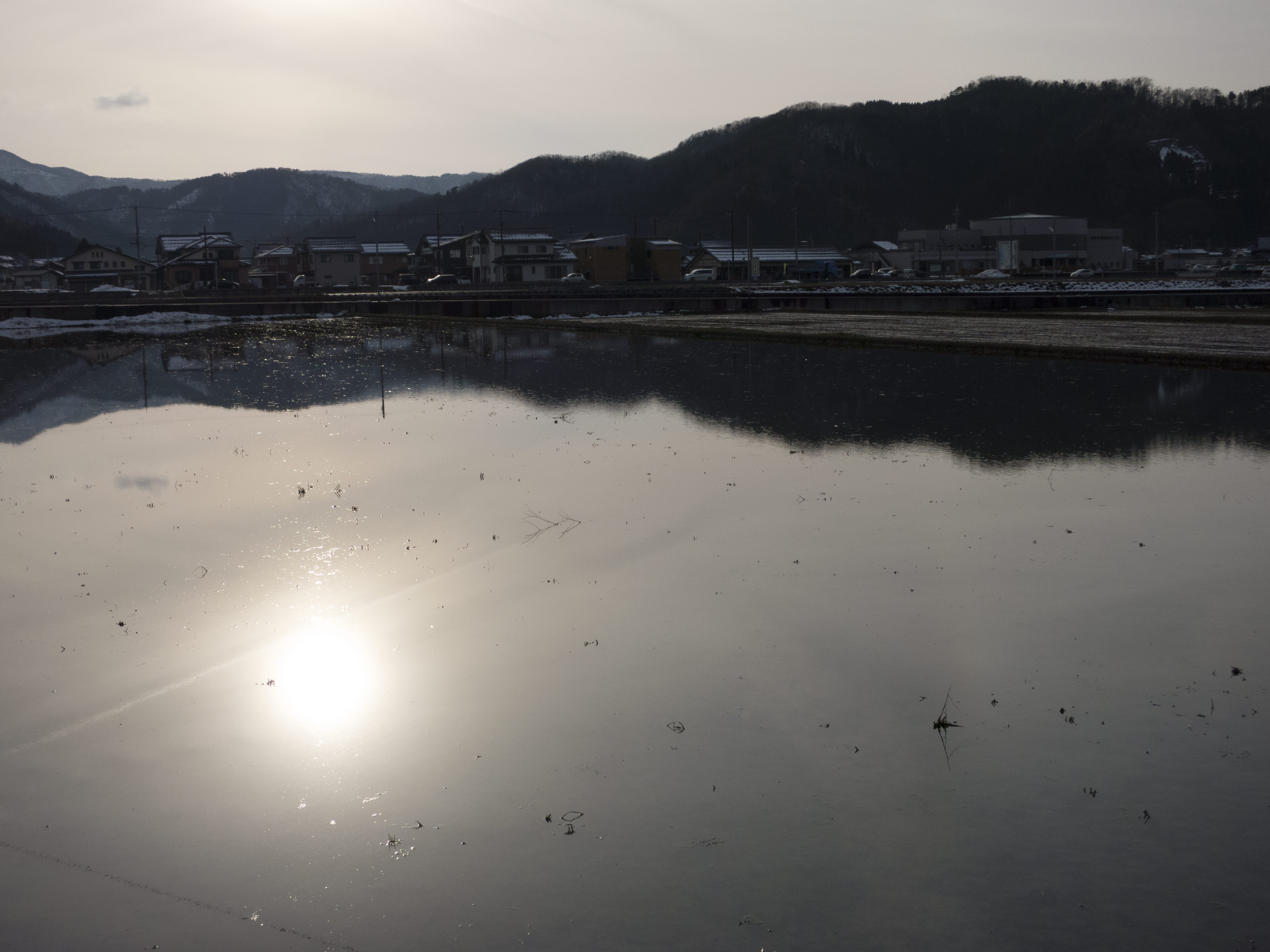 季節外れの田圃であるが、平な耕作地は水を蓄え池のように綺麗だ。