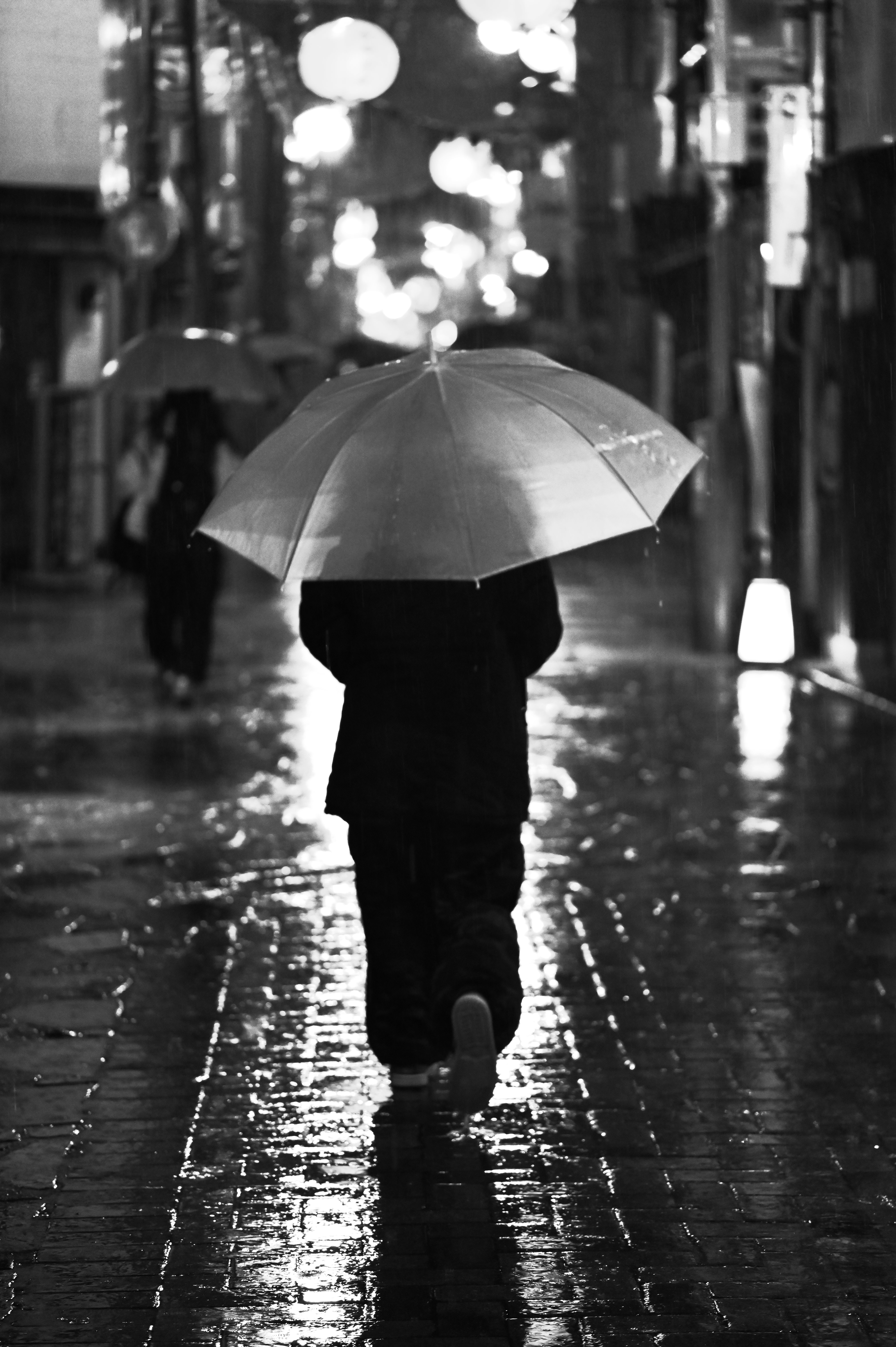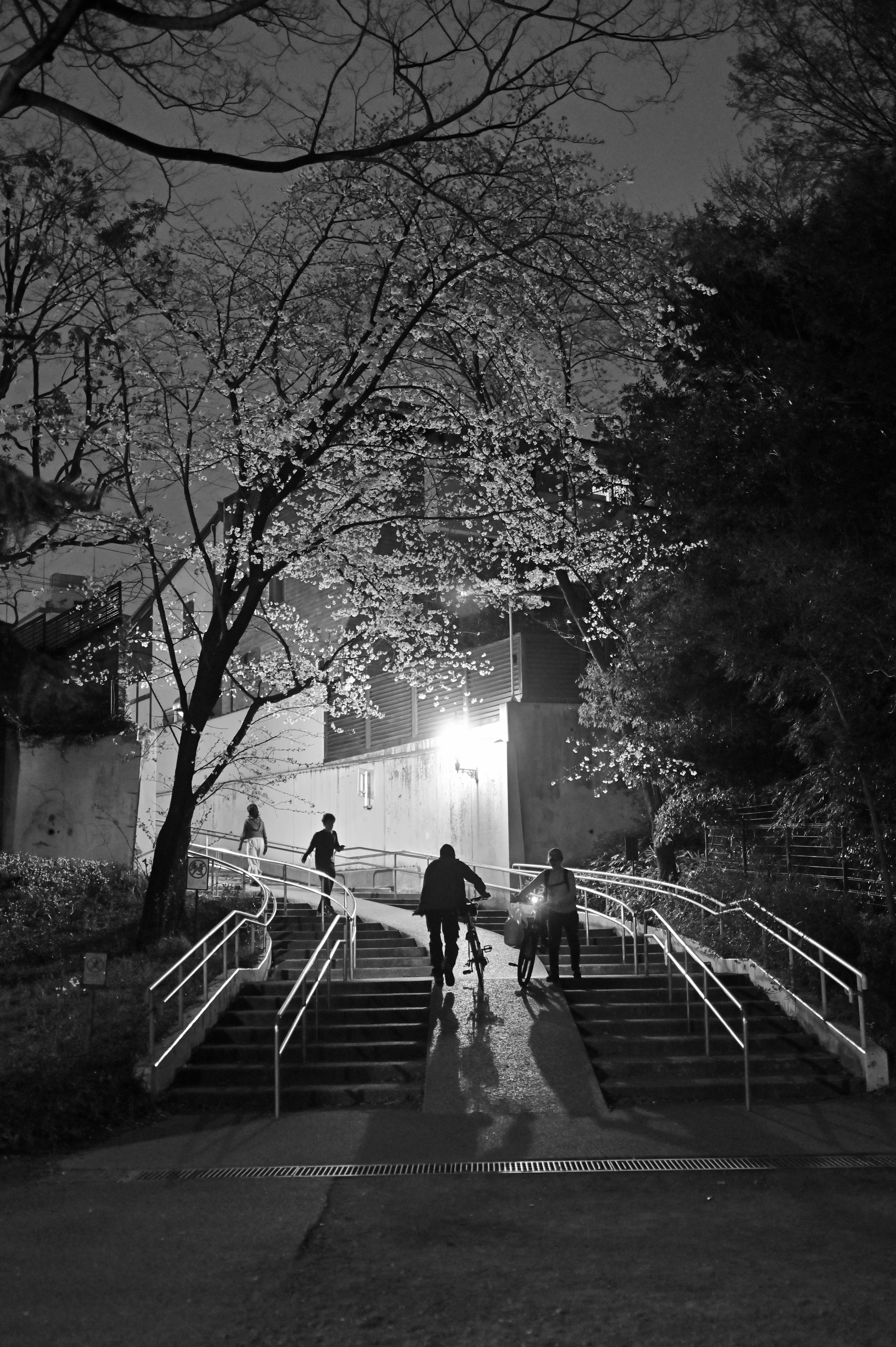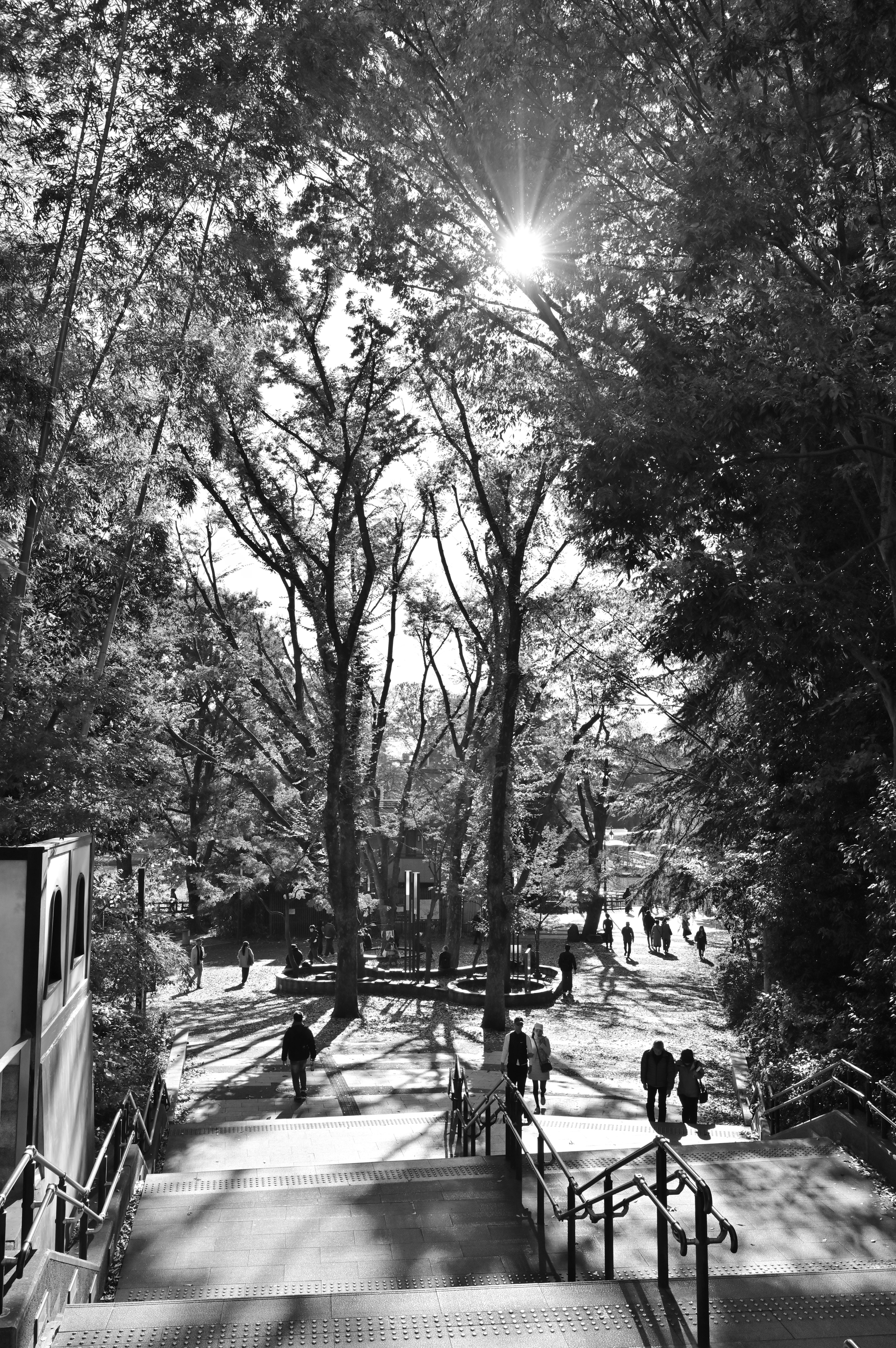 影に包まれた階段から、光溢れる広場へと視線を誘導しました。緻密に重なり合う枝葉が天然のフレームとなり、行き交う人々の営みをドラマチックに演出していました。