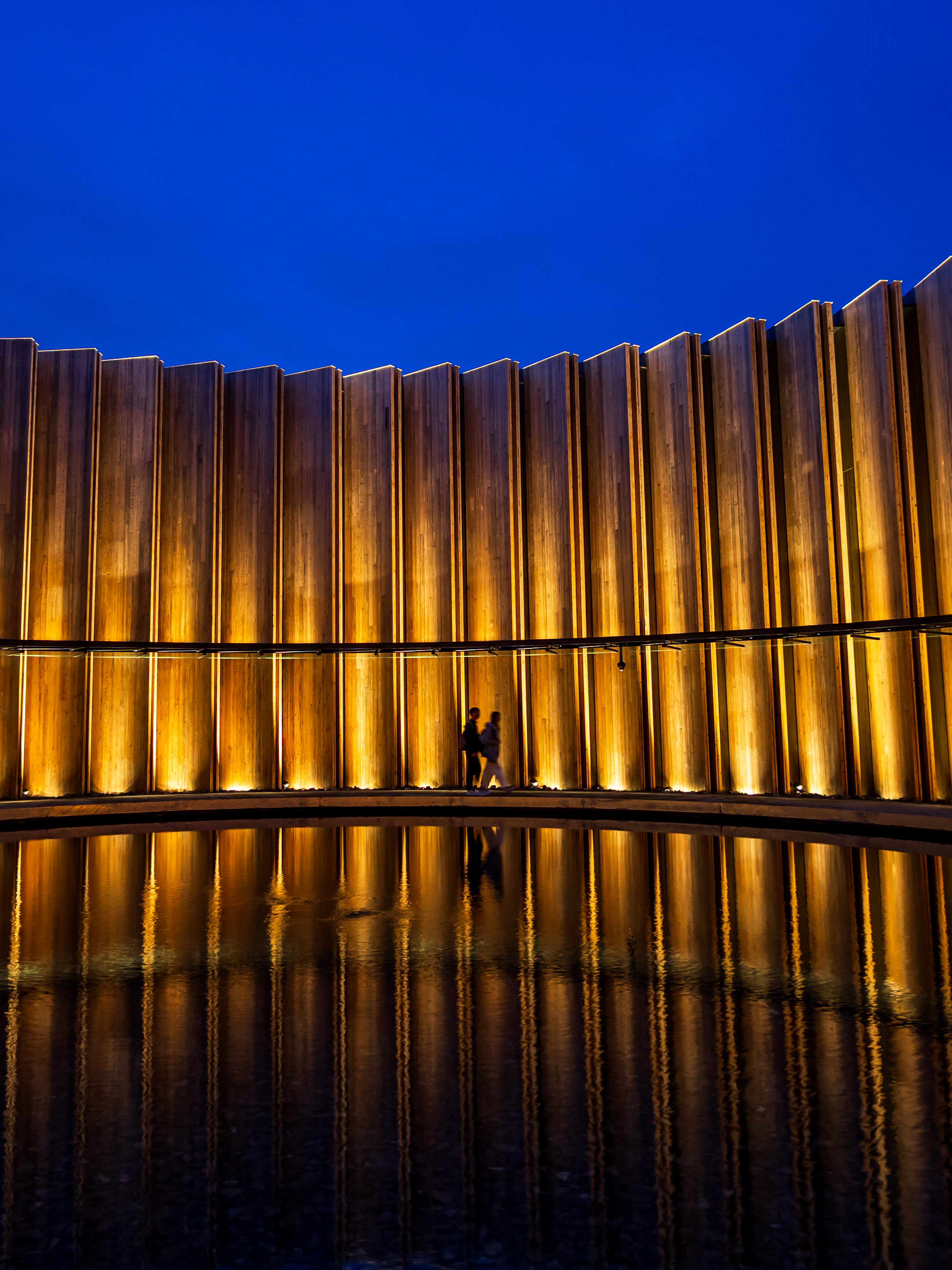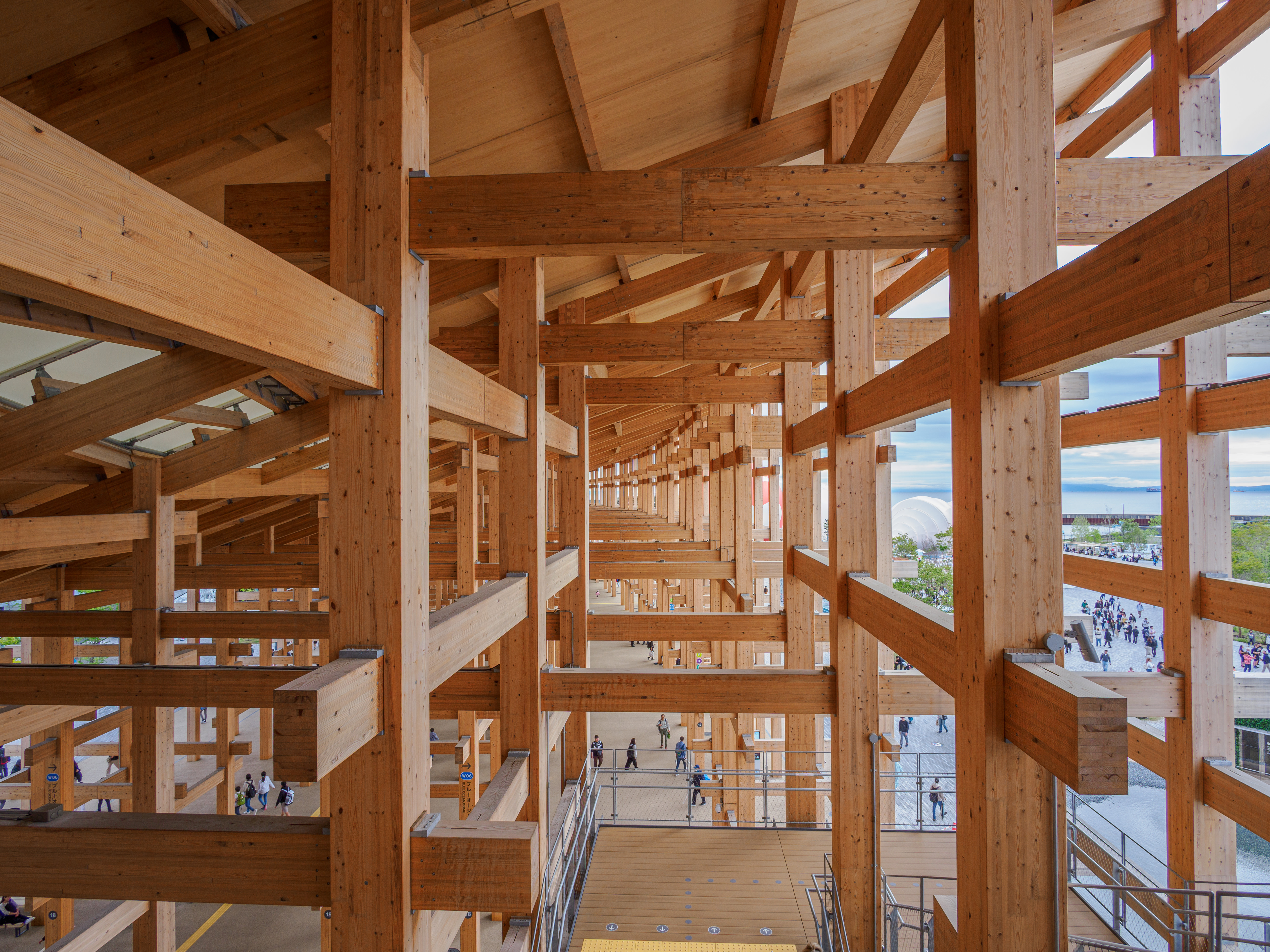 大阪・関西万博の大屋根リングを真下から仰ぎ見た一枚。伝統的な木組みの構造と広がる空が呼応し、空間と時間をつなぐ架け橋のような風景が現れる。空を見上げる来場者の姿に、未来へのまなざしが重なる。