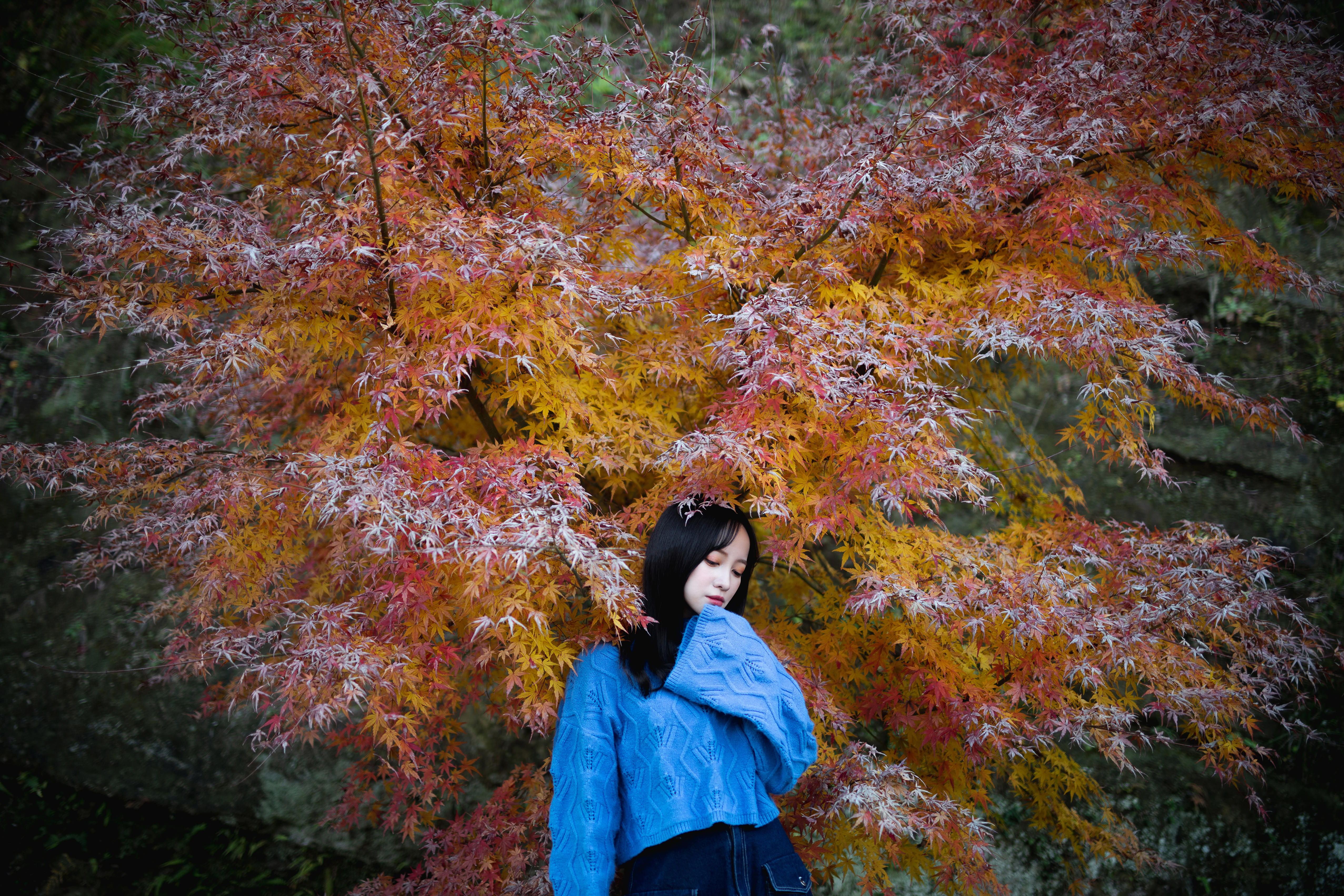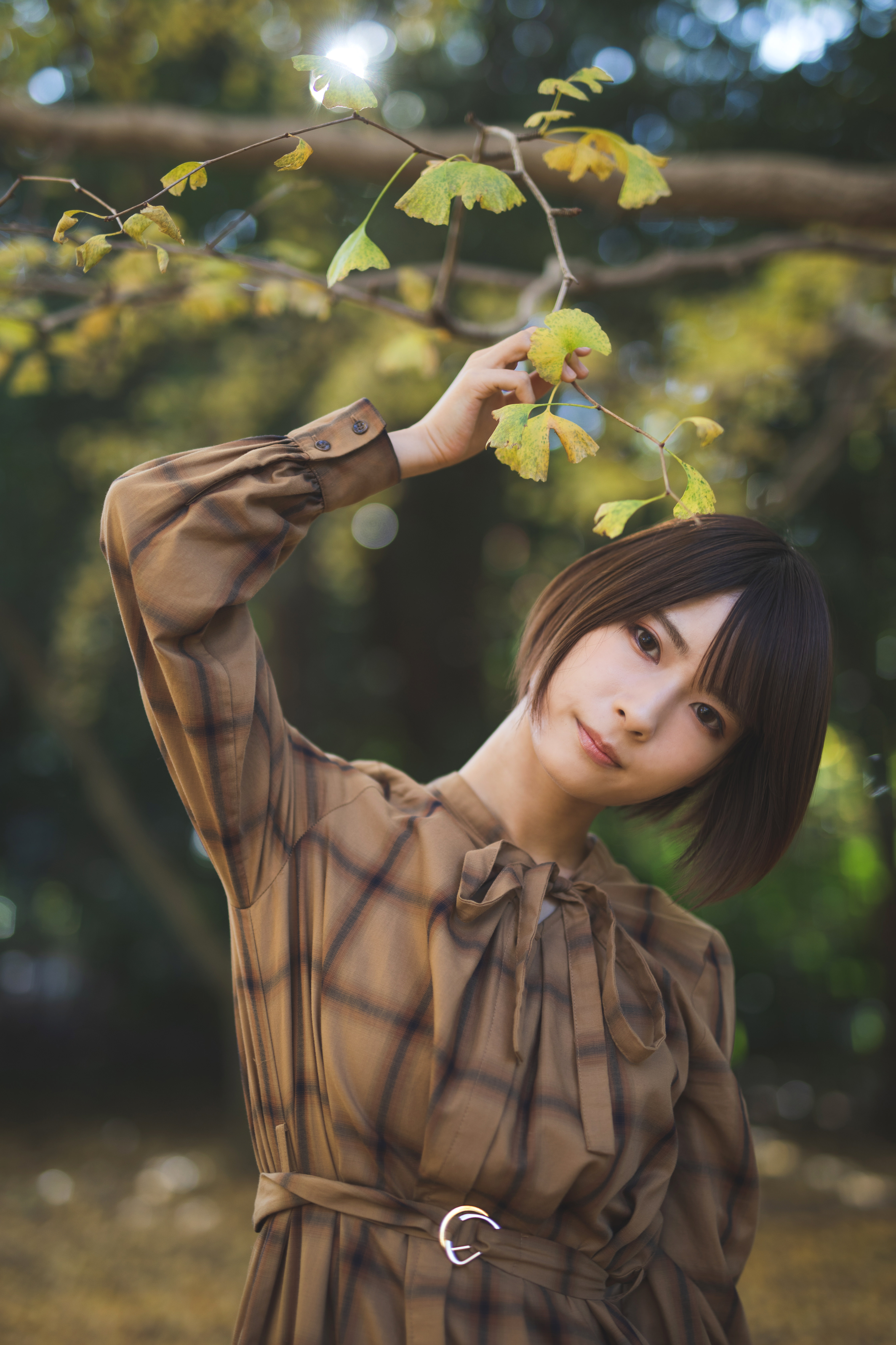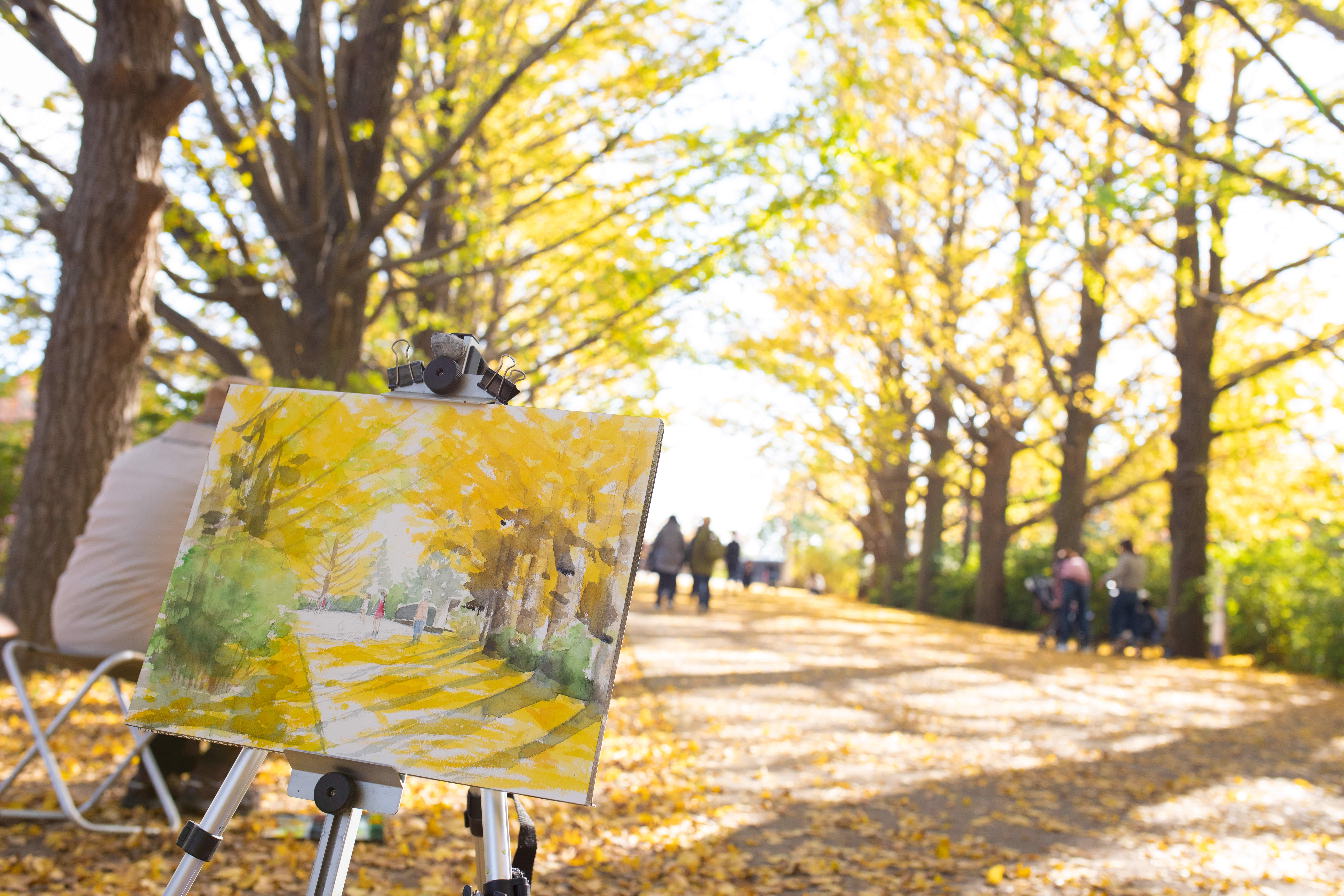 落ち葉になっている黄色く染まった紅葉を綺麗に舞うように投げてもらいました。