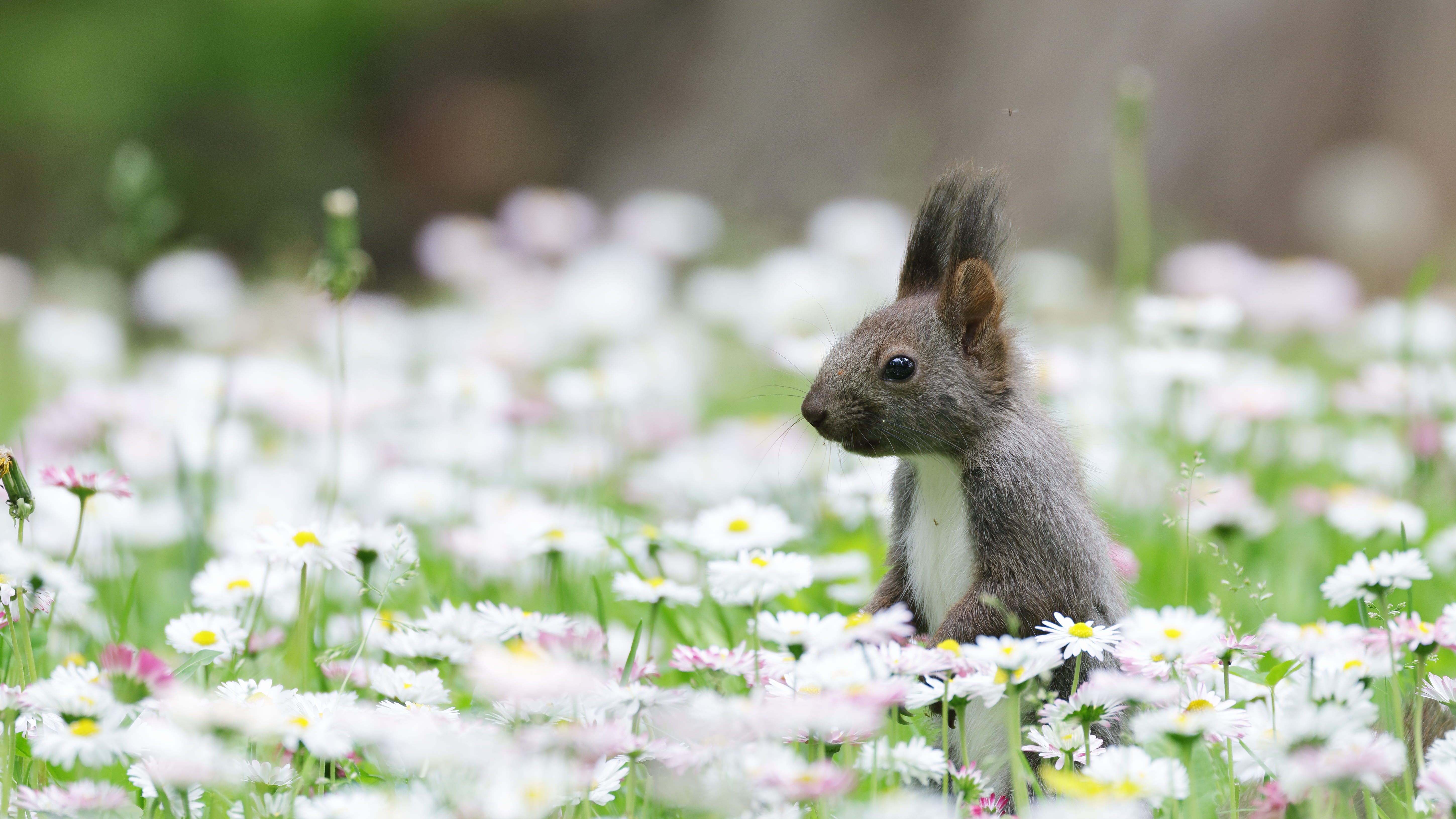 春に独り立ちしたばかりの子リスが花畑に遊びに来ました