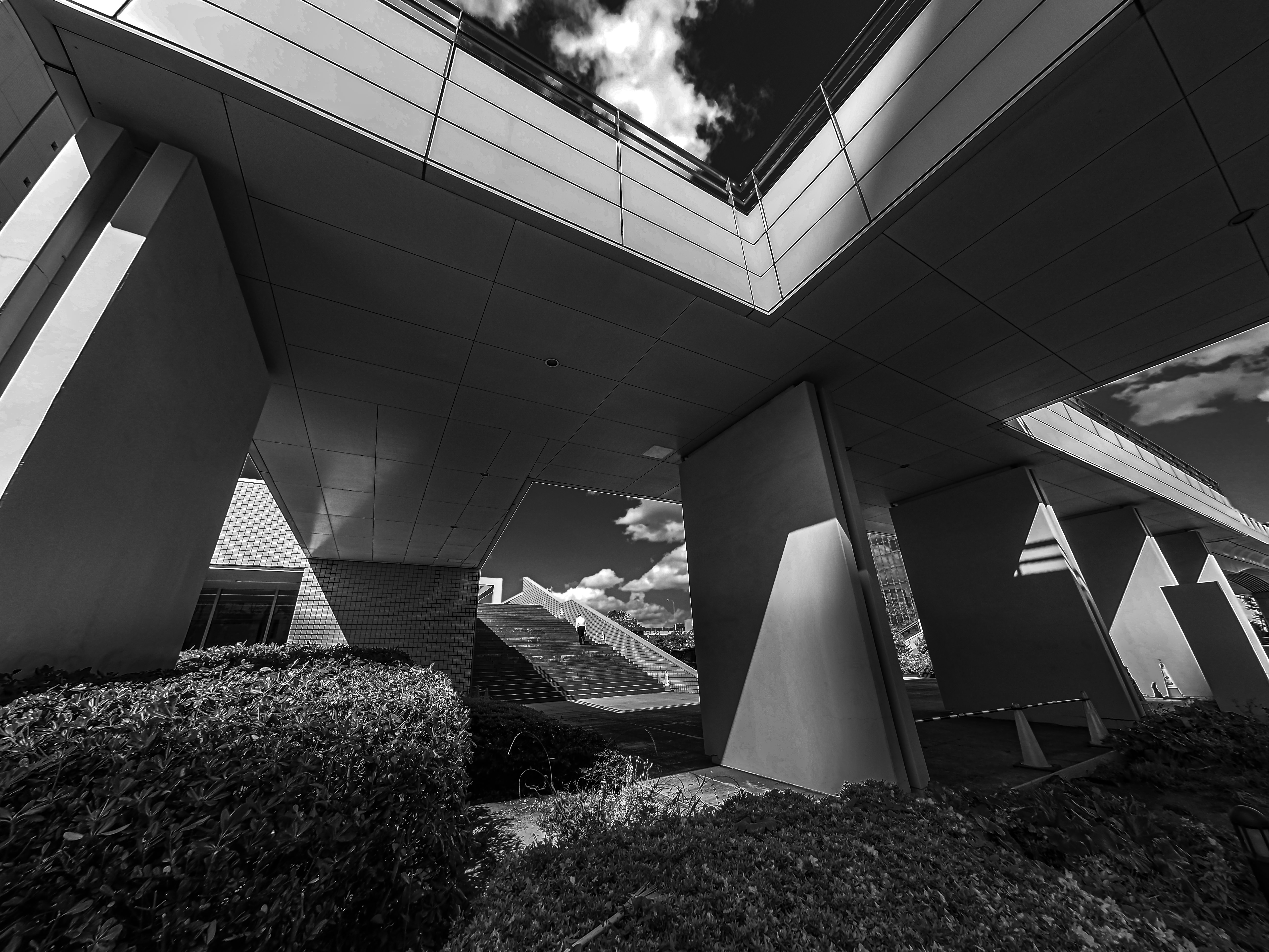 無機質な都市空間に夏の光が注ぐ、階段を登り行く人は一人。