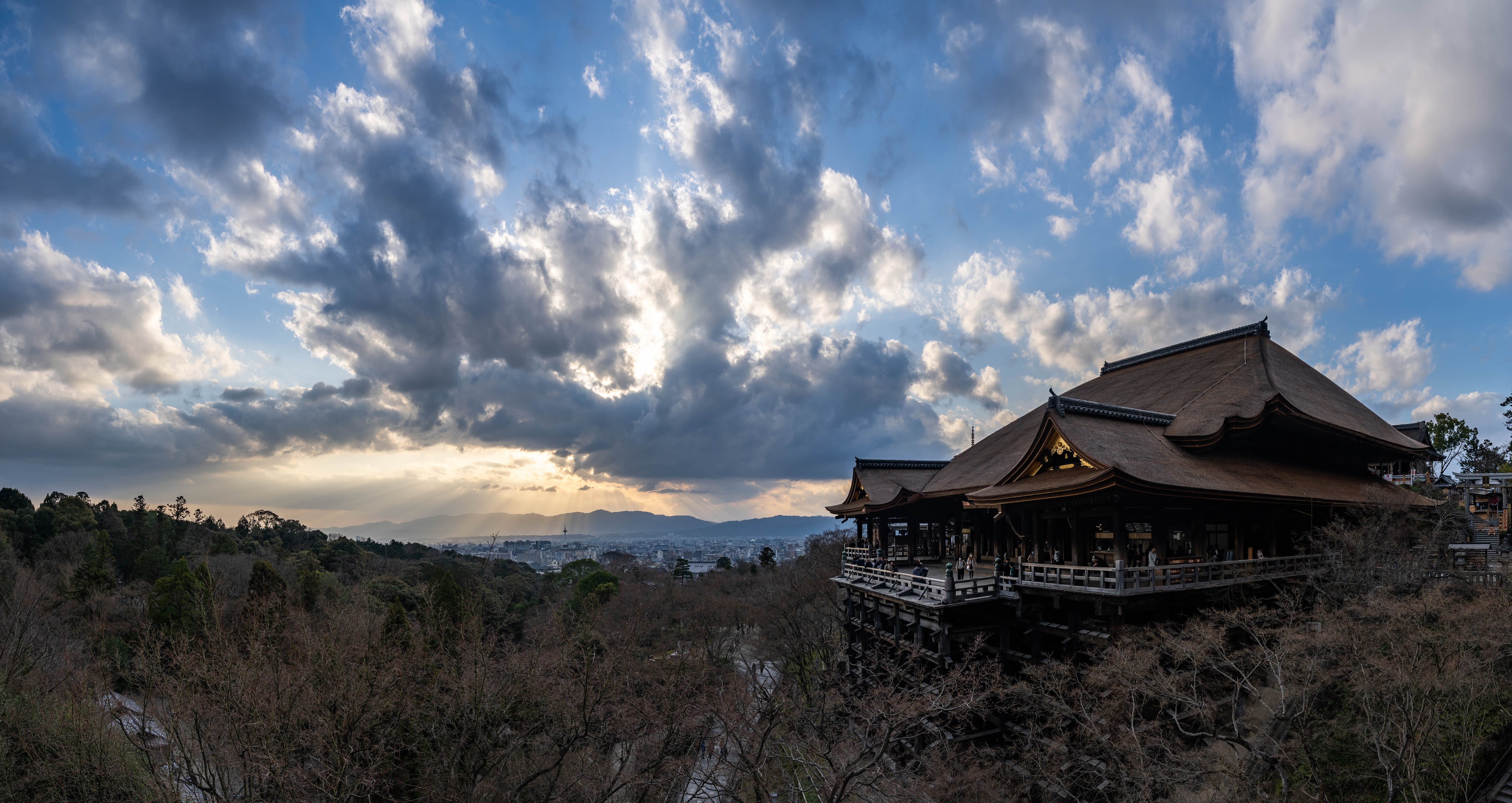 24mmの縦構図で撮影した写真をパノラマ合成したため広角特有のパース感が強調され、清水の舞台を引き立てる背景としての雲のダイナミックさを上手く表現できたと思います。