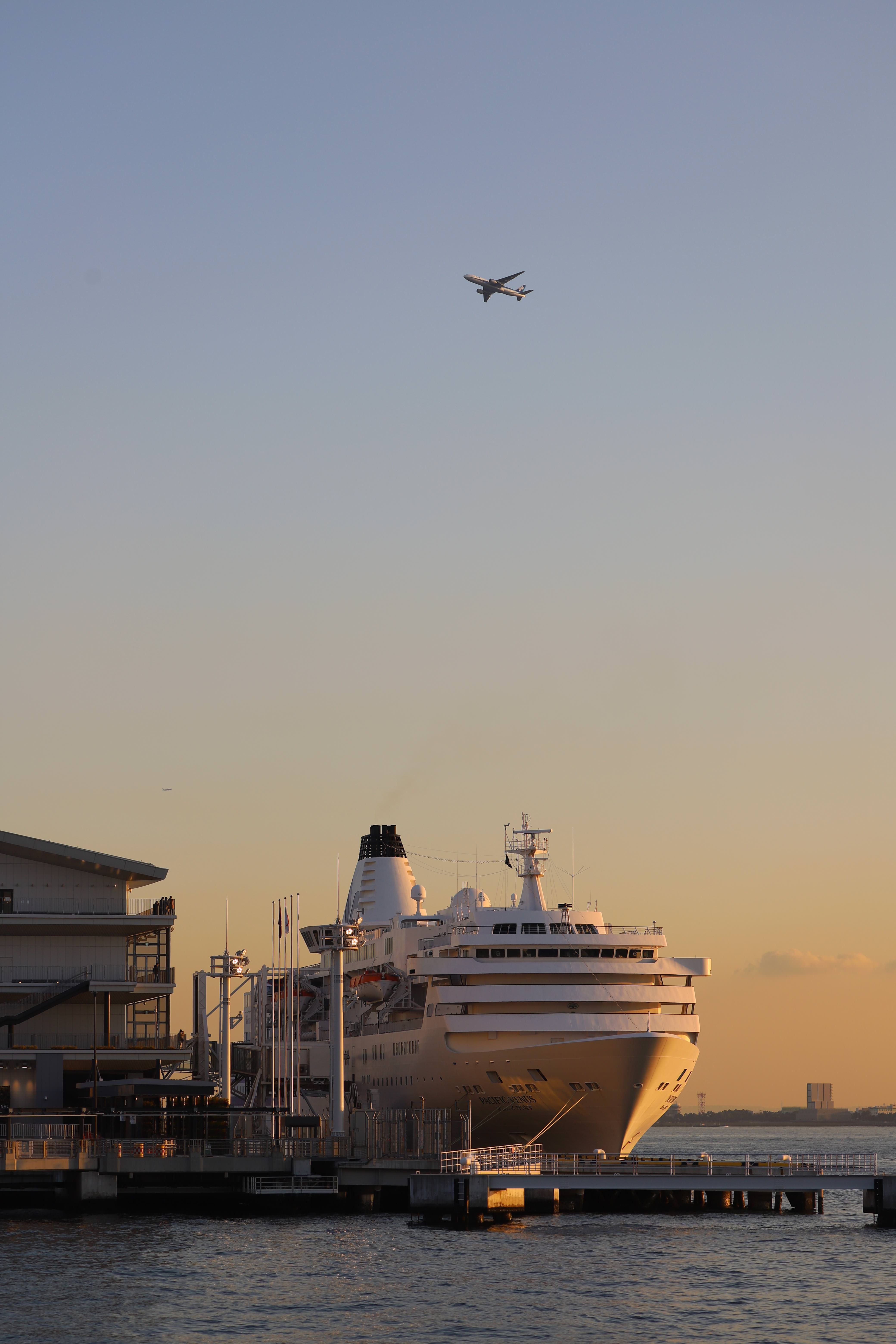 東京国際クルーズターミナルに停泊している客船ぱしふぃっくびいなすと羽田空港を離陸したANAの飛行機が交差したところを撮影しました。