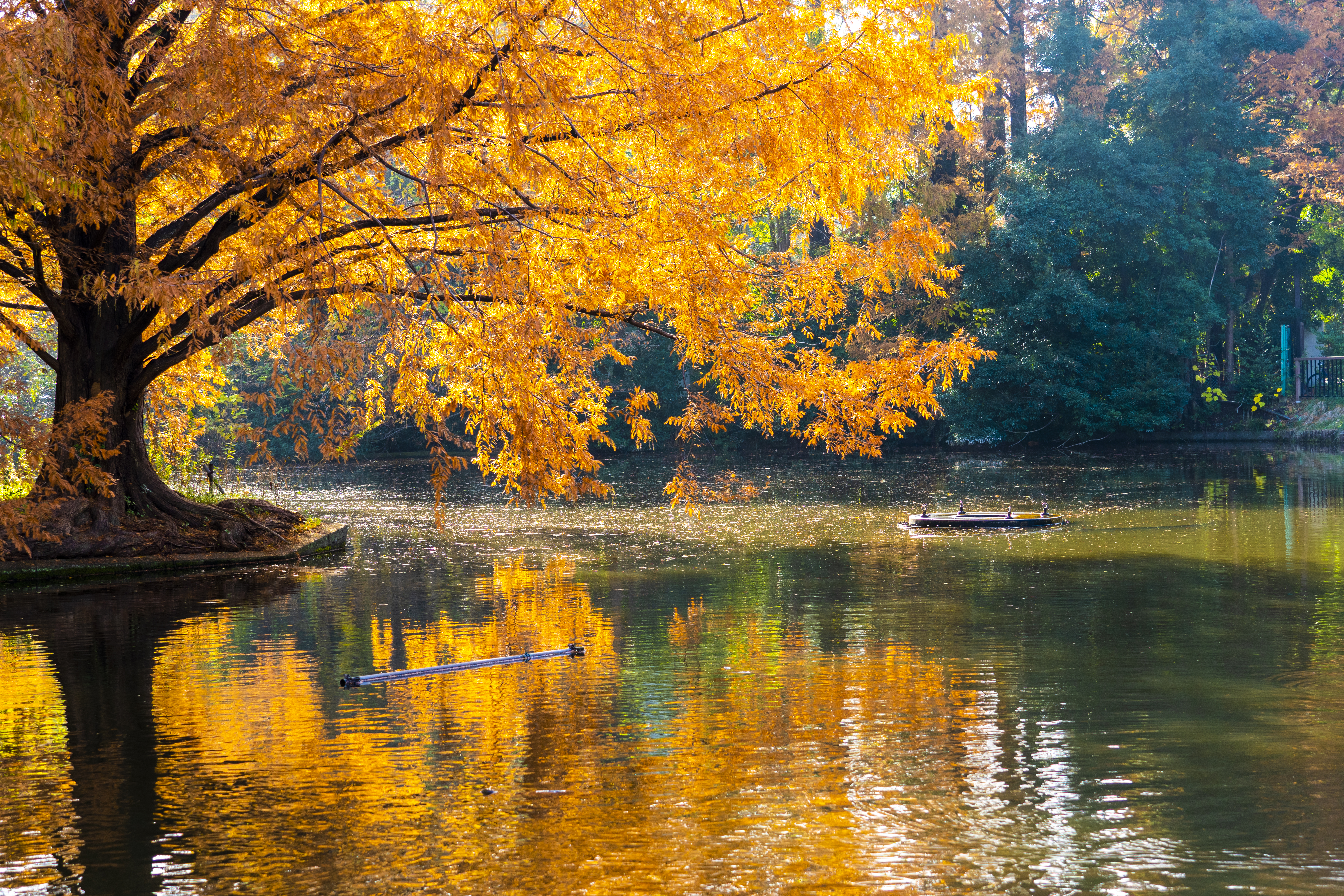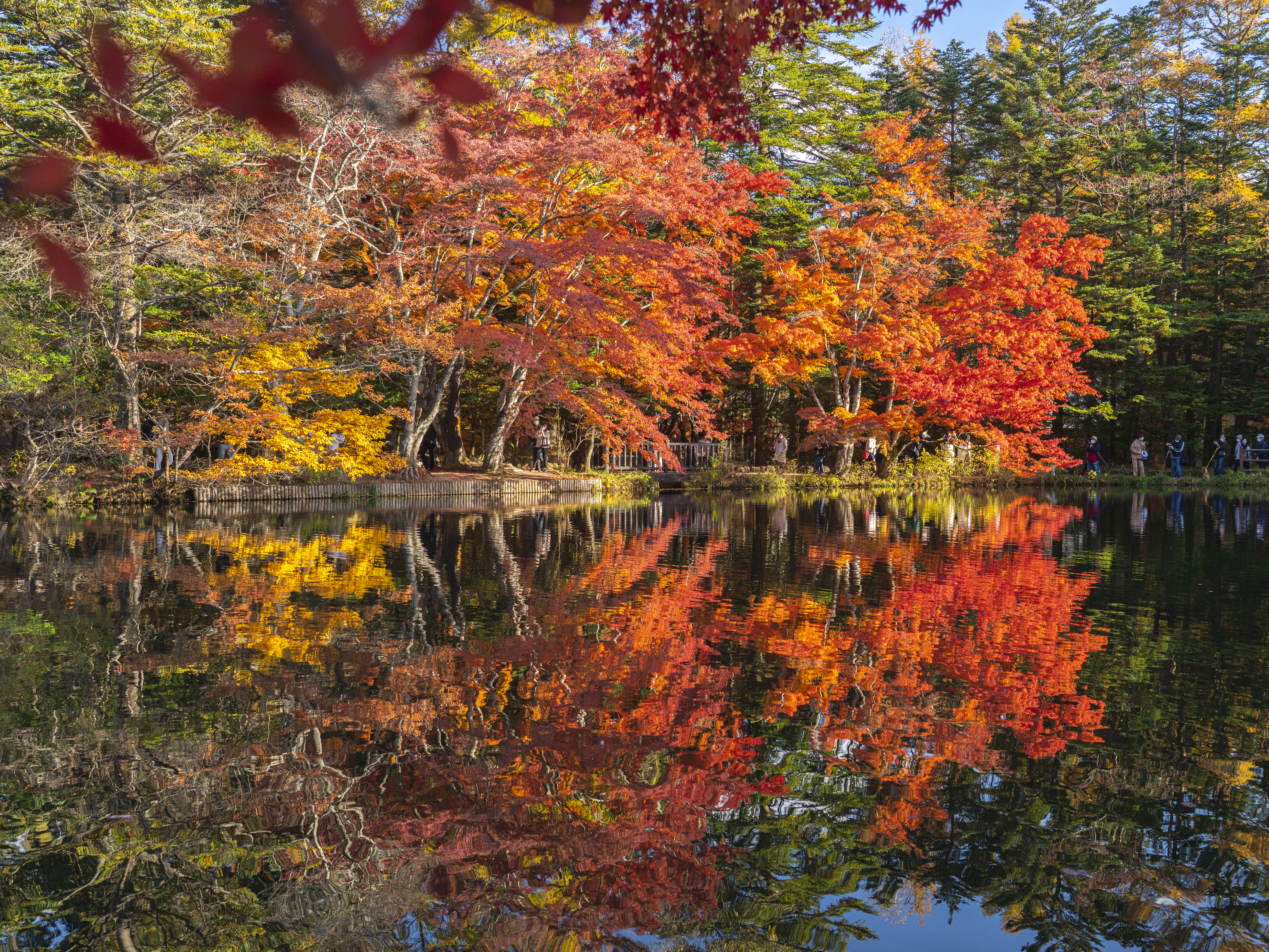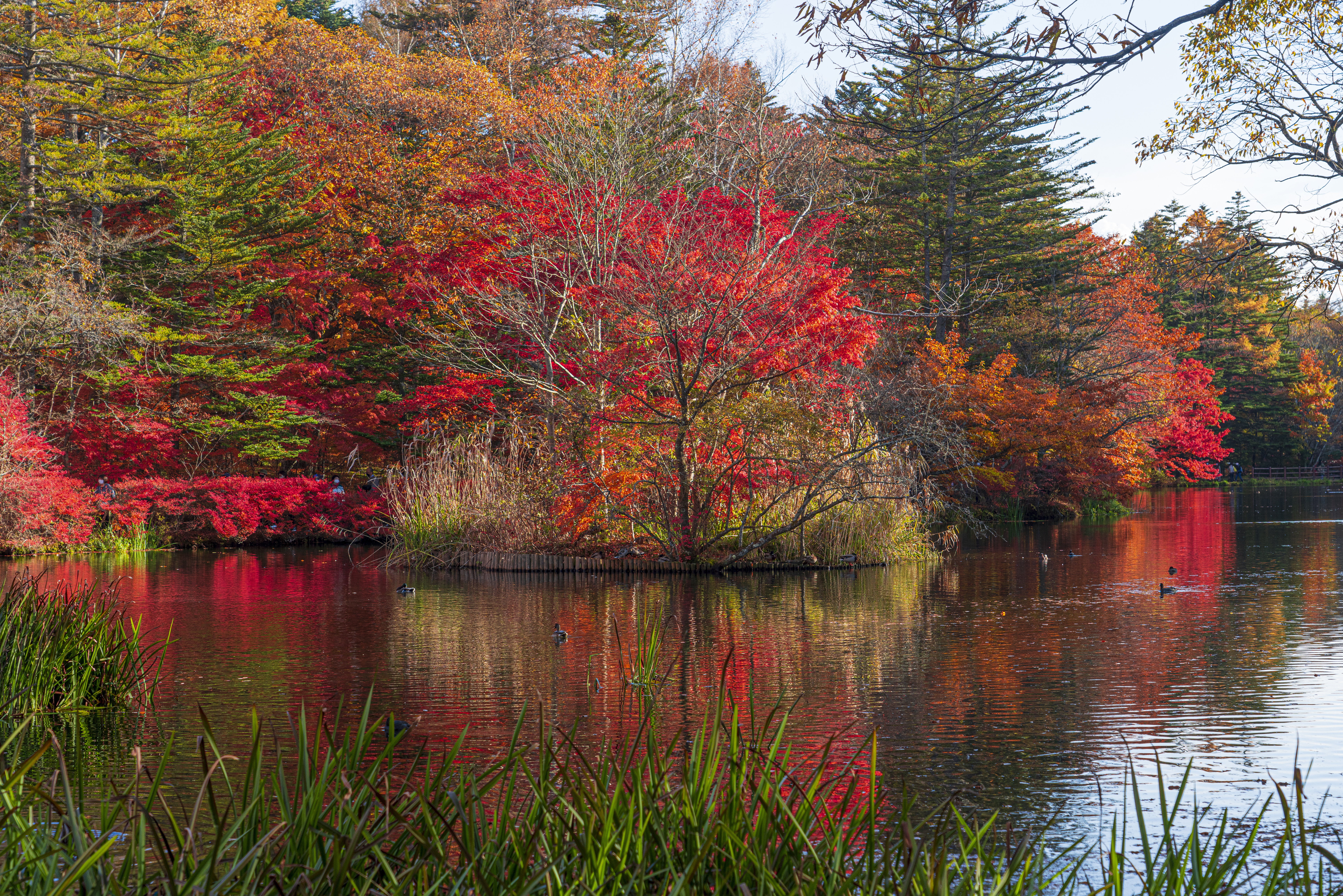 紅葉で赤く映える雲間池