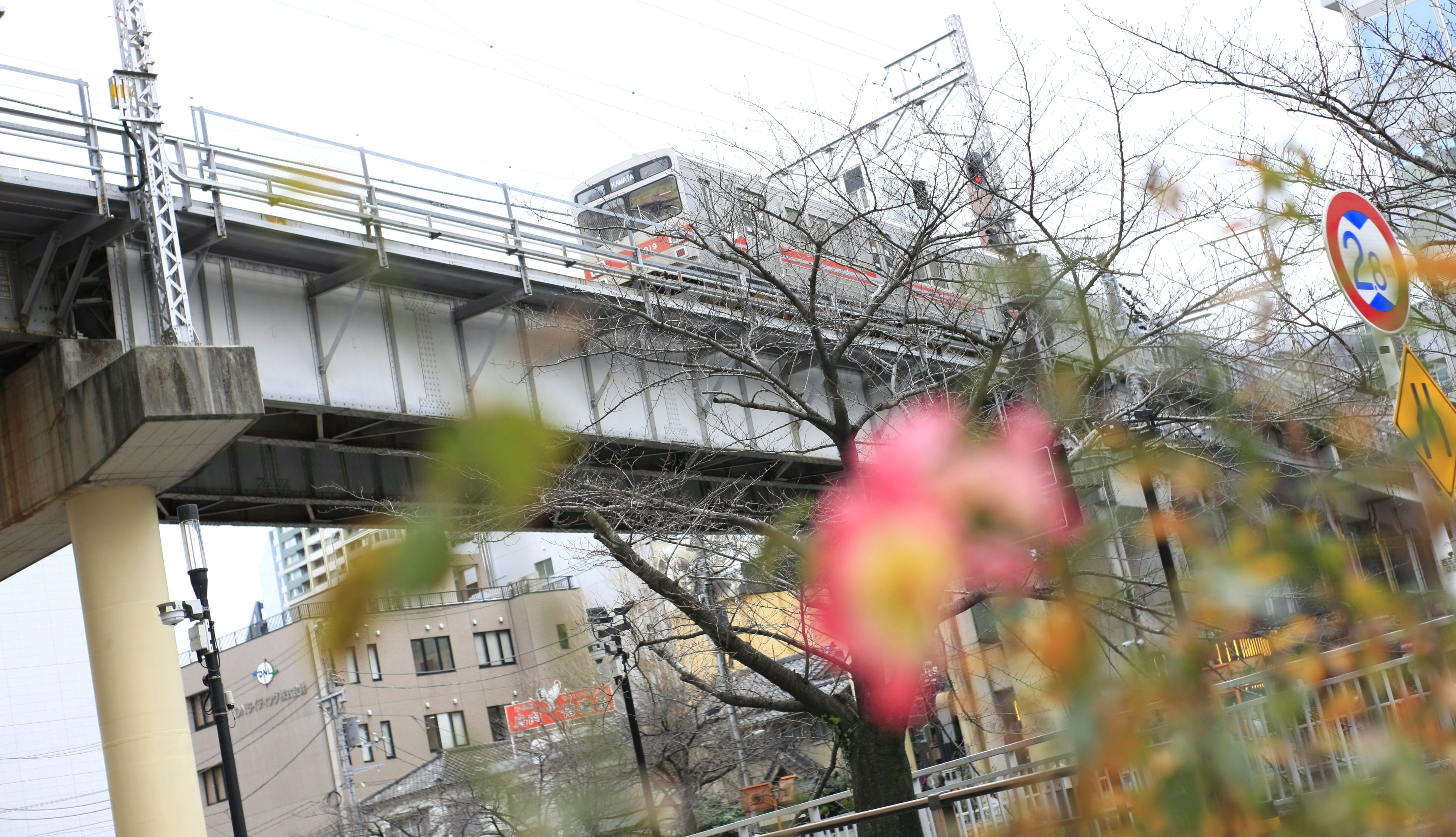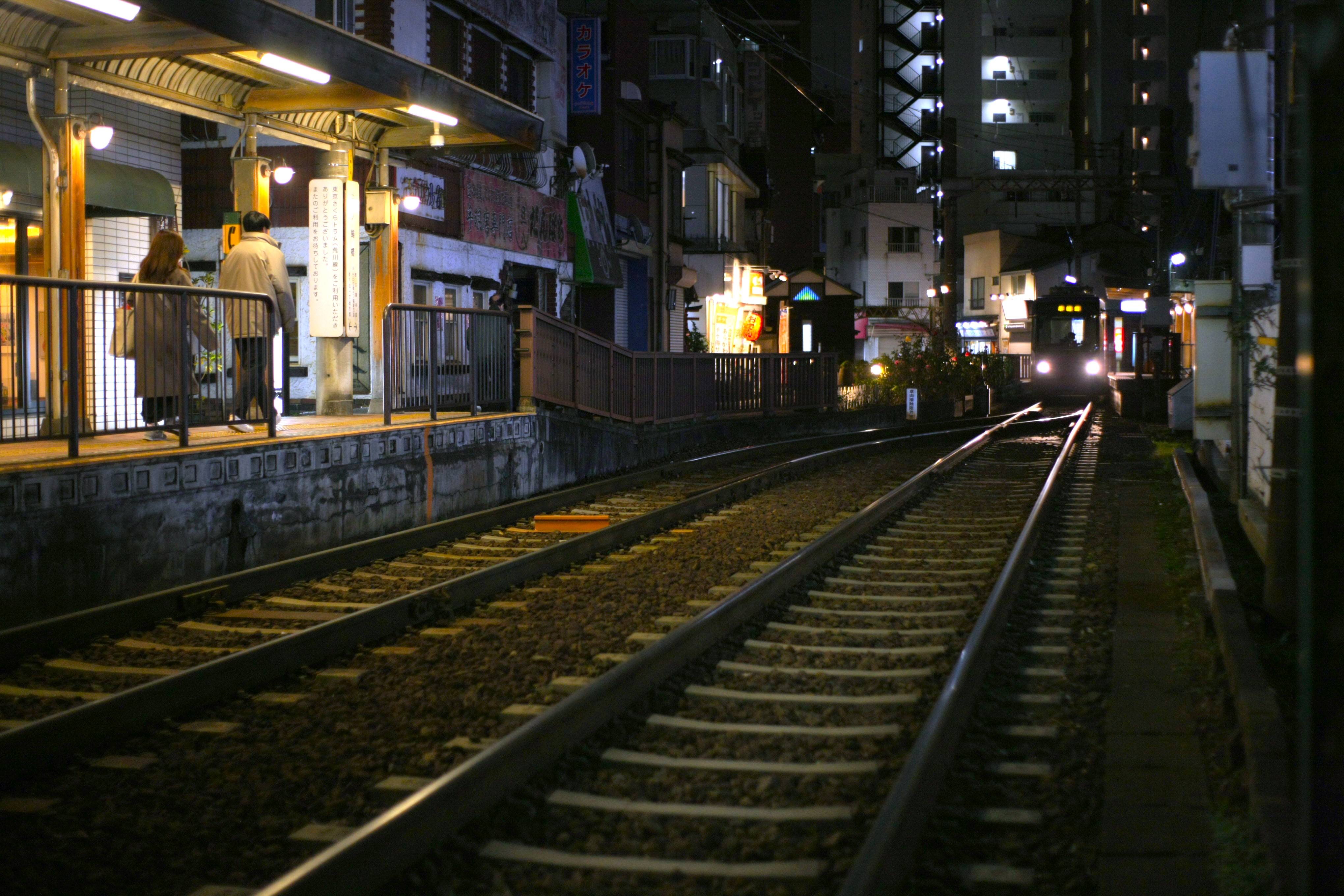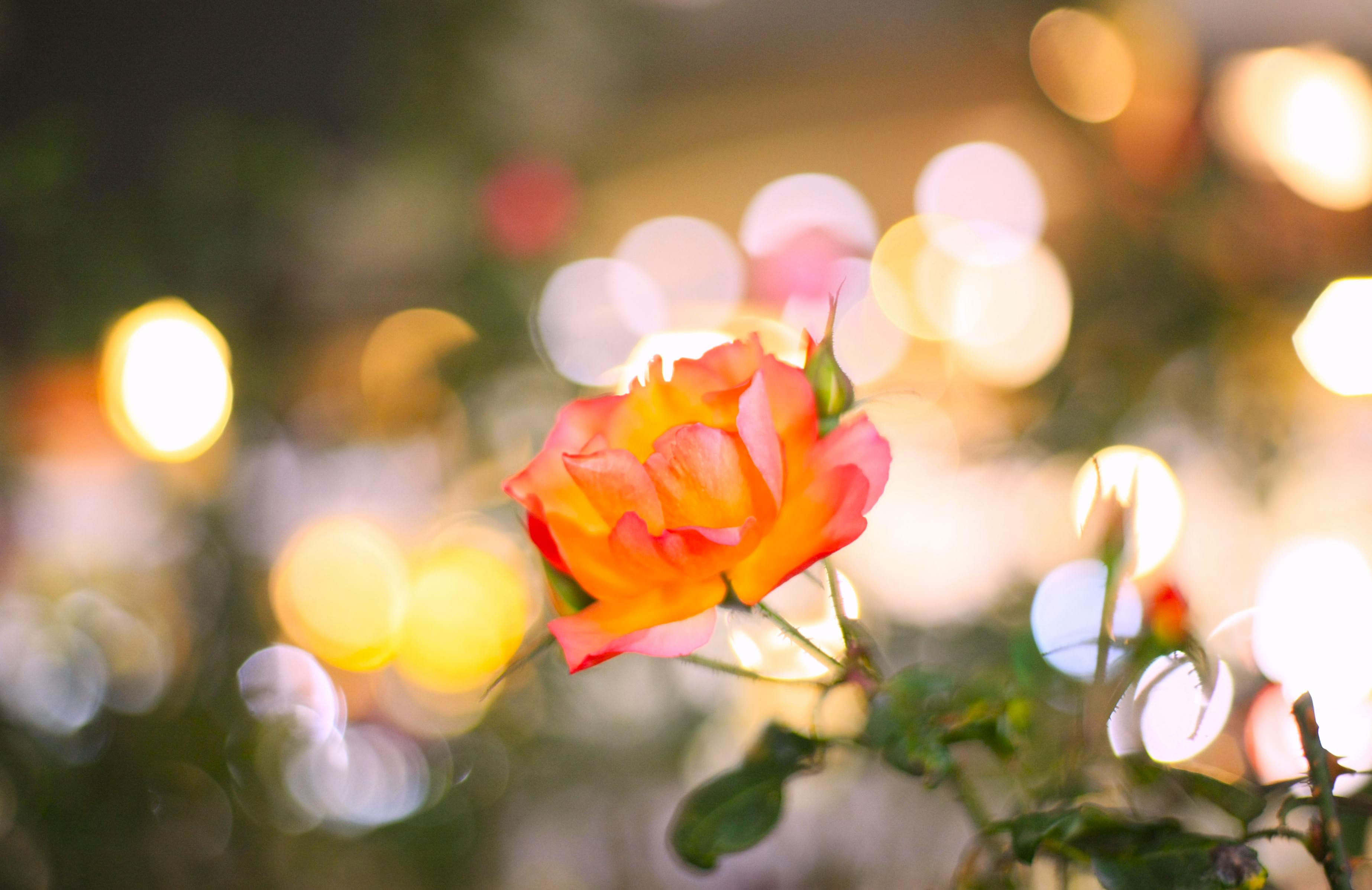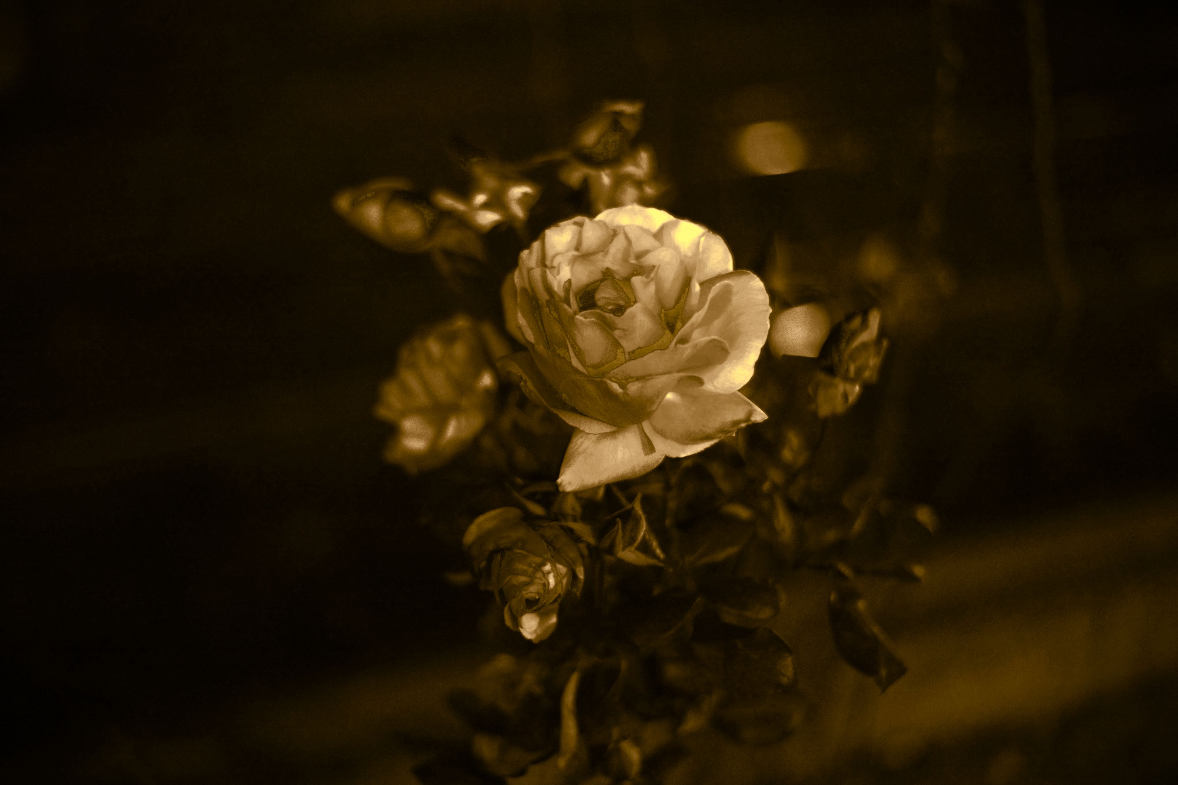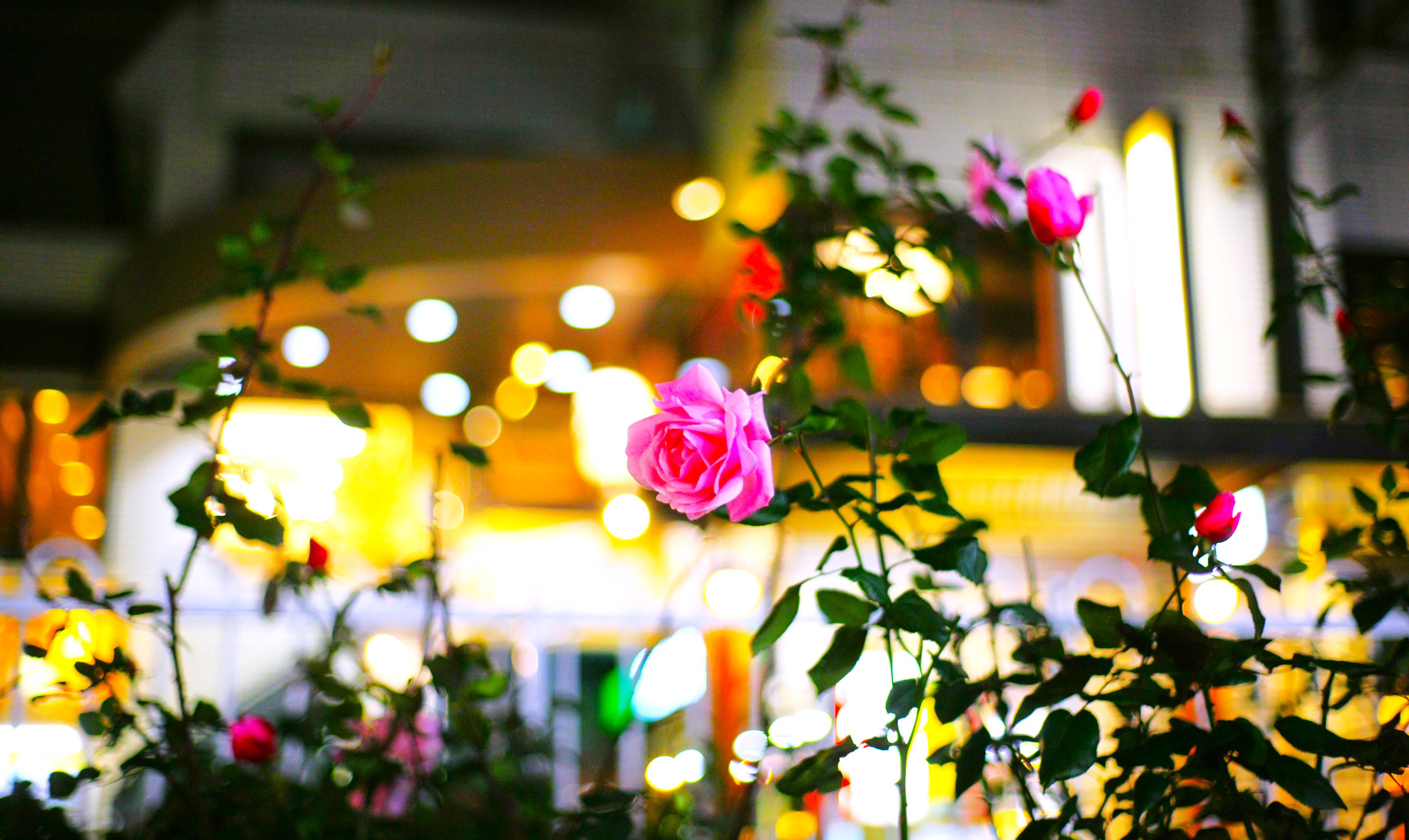 路面電車のヘッドライトに照らされて闇に浮かぶ薔薇です