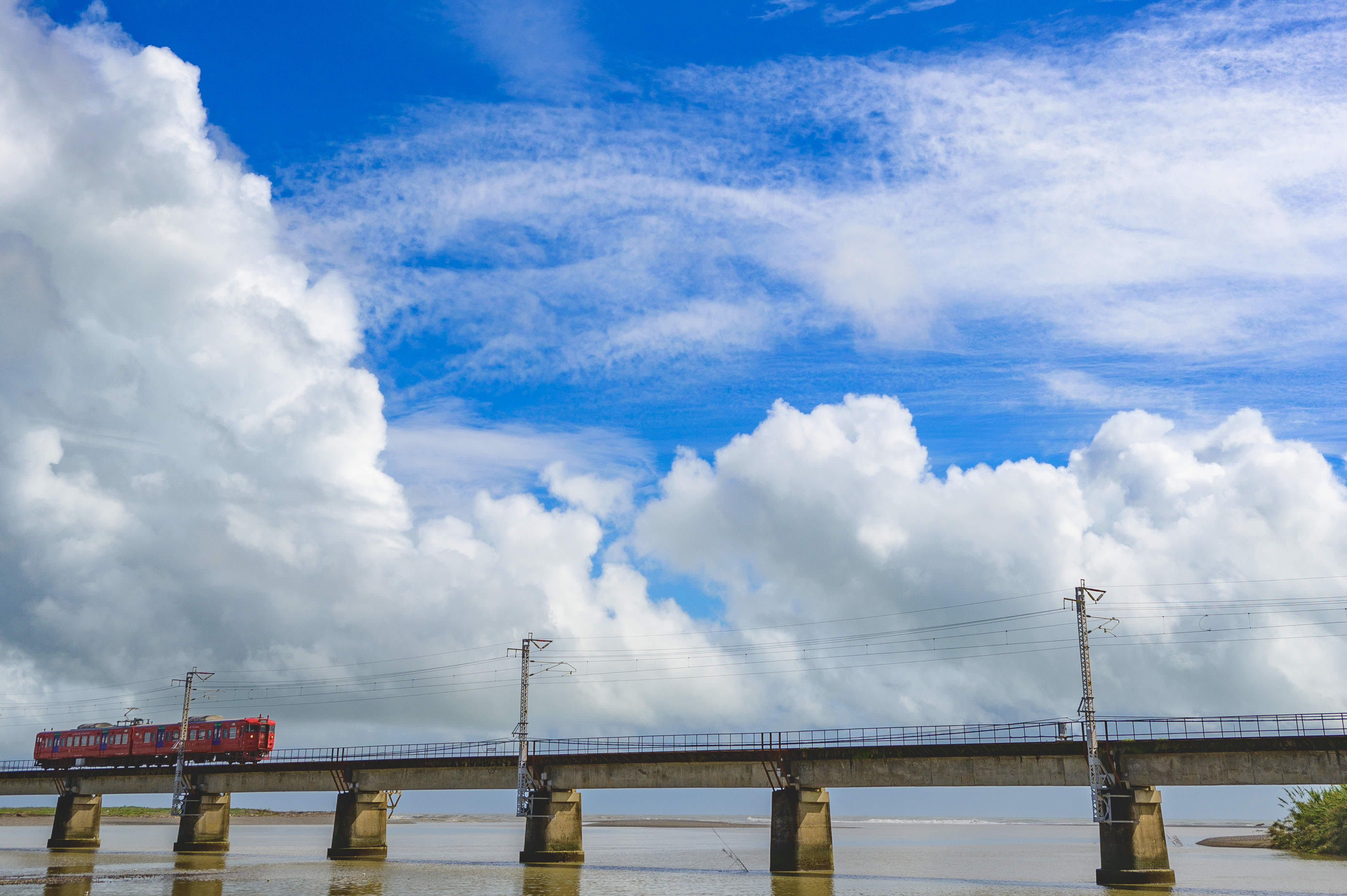 佐賀県太良町の大魚神社そばには漁業用の作業道路が設けられていますが、満潮時には道路は水没し、道路沿いの電柱だけが現れるシュールな光景が見られます。夏の日差しが海面の反射してキレイでした。