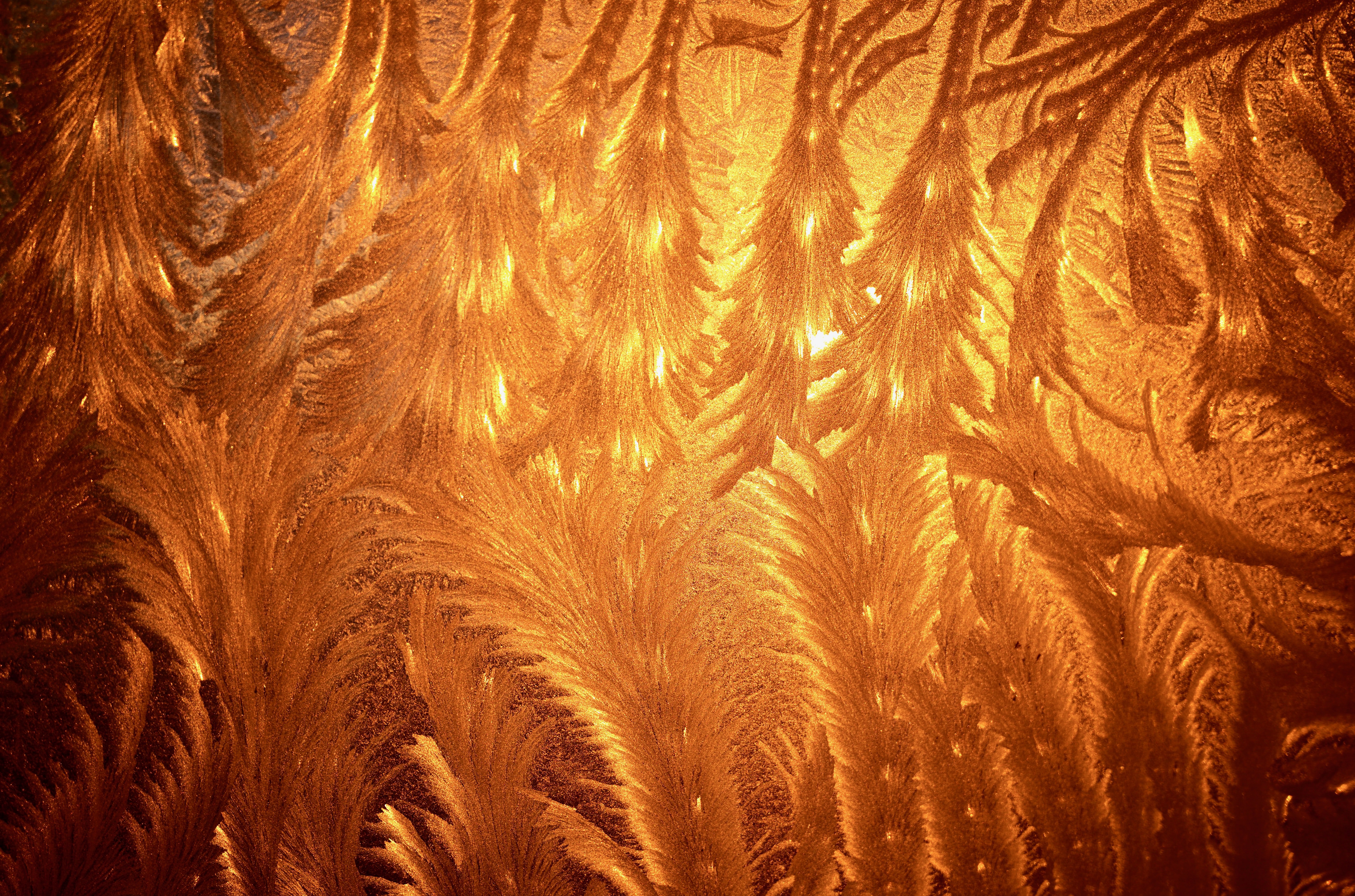窓についた霜が日の出直後の朝陽を受けて黄金色に輝く瞬間。