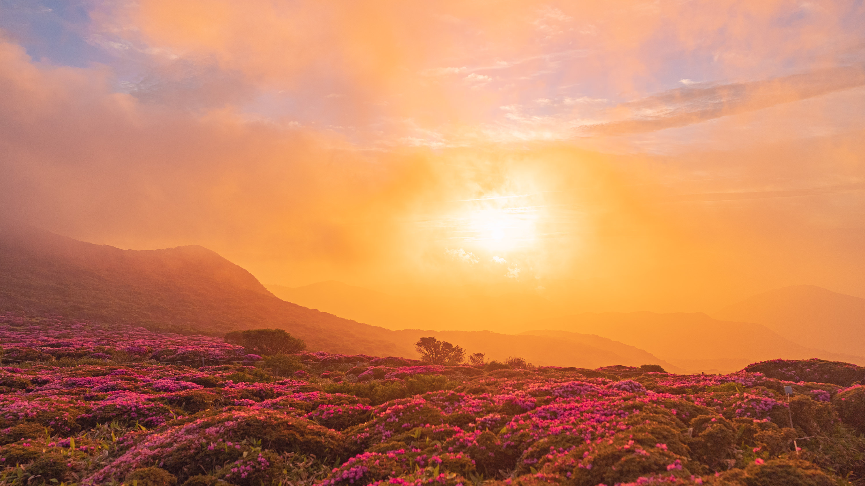 一瞬だけ顔出した夕焼けさんと夕焼け色に染まった満花のミヤマキリシマです。