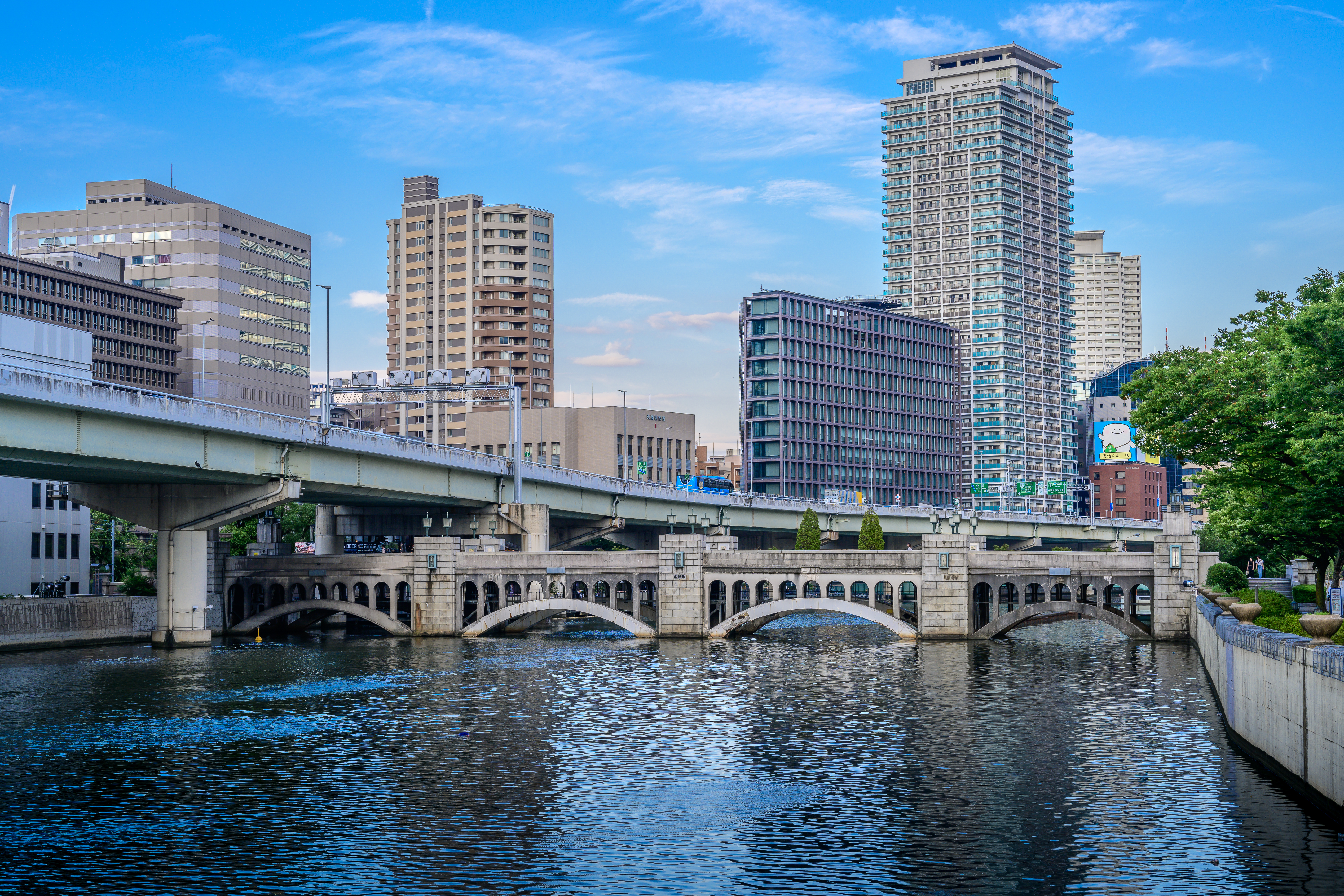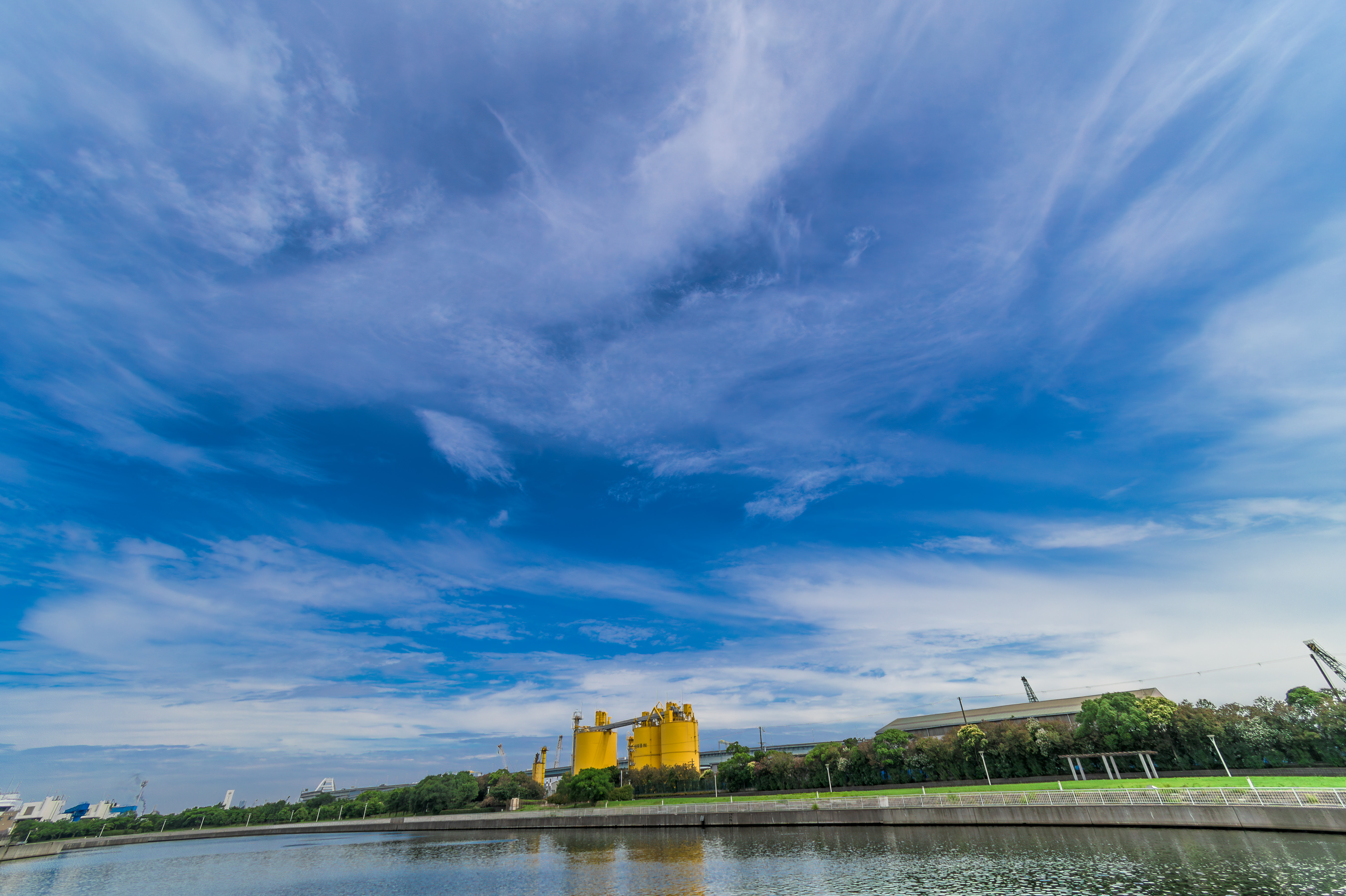 運河沿いの工場の向こうに広がる空と雲