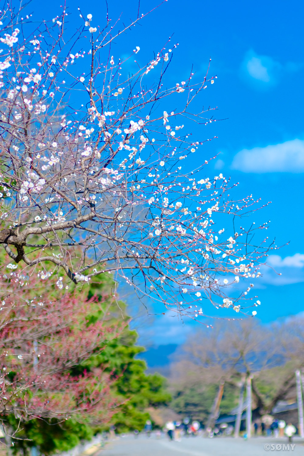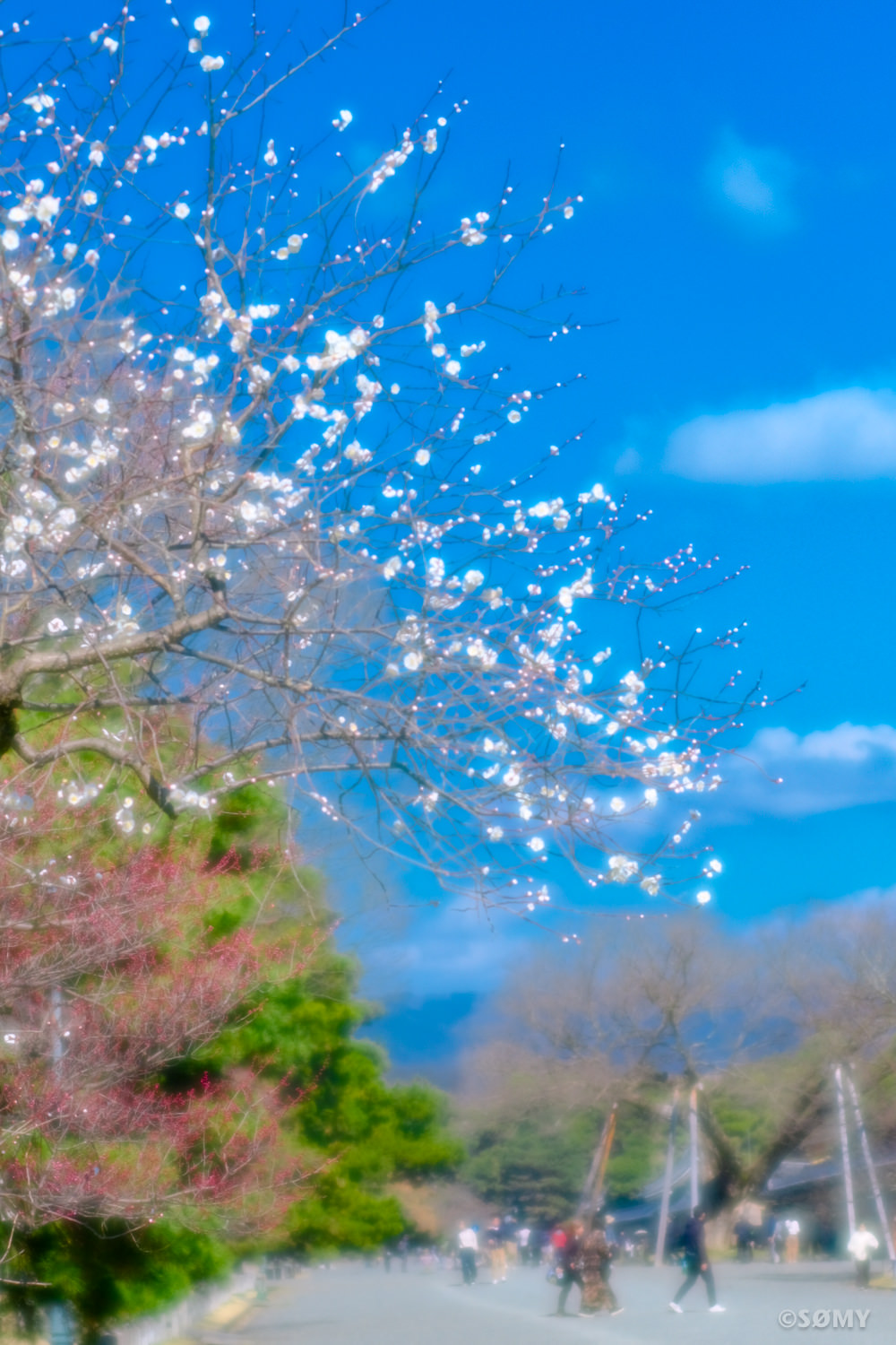 春めいた陽気の中で咲き始めた白い梅を、相棒のソフトフォーカスレンズでパシャり。