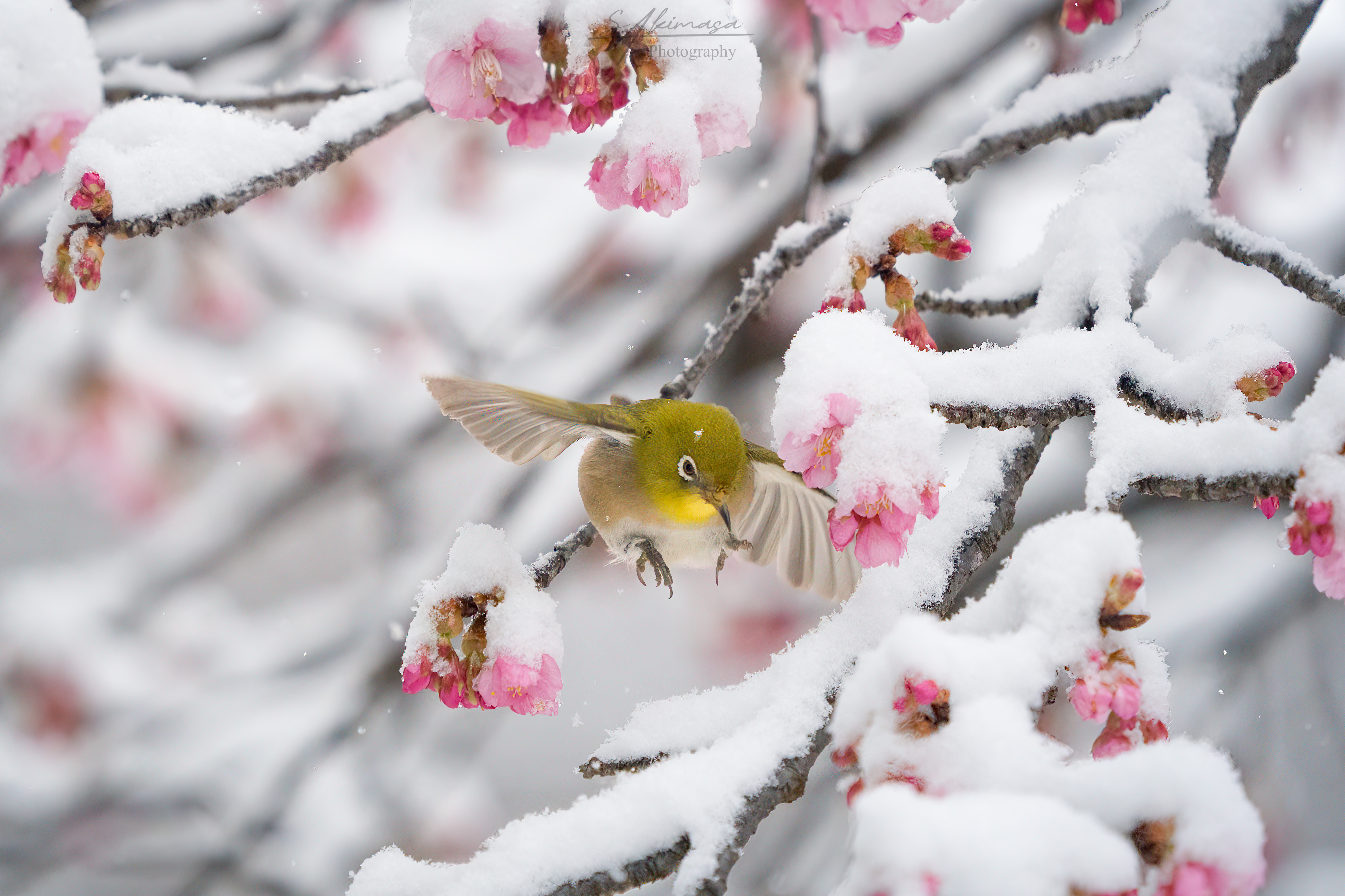雪の降る代々木公園、こんな日でもメジロは河津桜の蜜を吸いに元気に飛び回っていました。