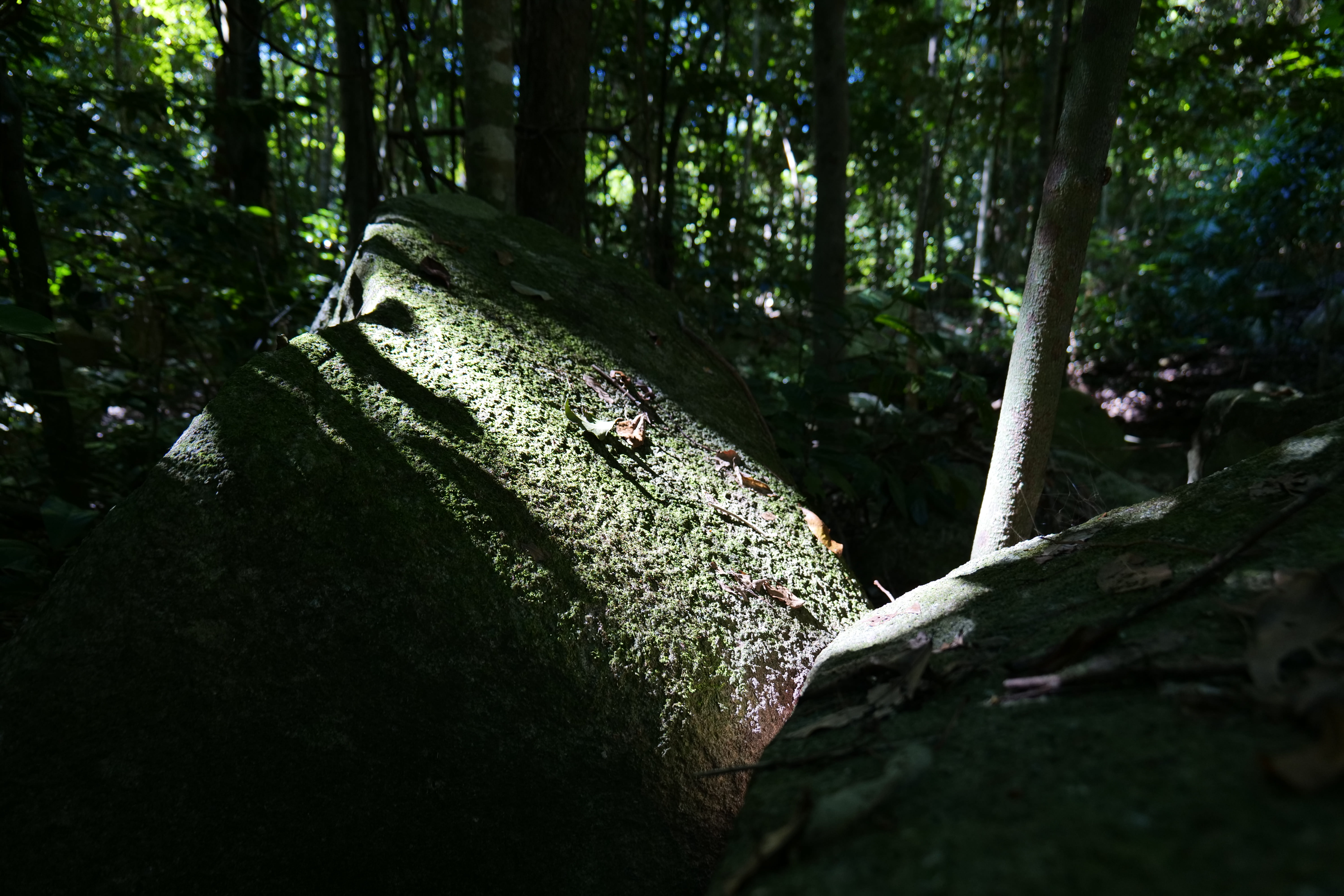 オーストラリア、ケアンズのフィッツロイアイランドの森の中で木漏れ日が岩にあたっているところを撮りました