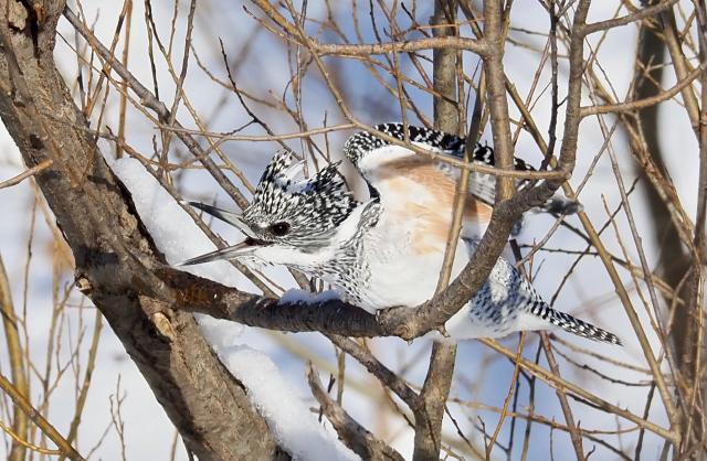 夕日を浴びながら白樺林のネグラに帰るクマゲラです。