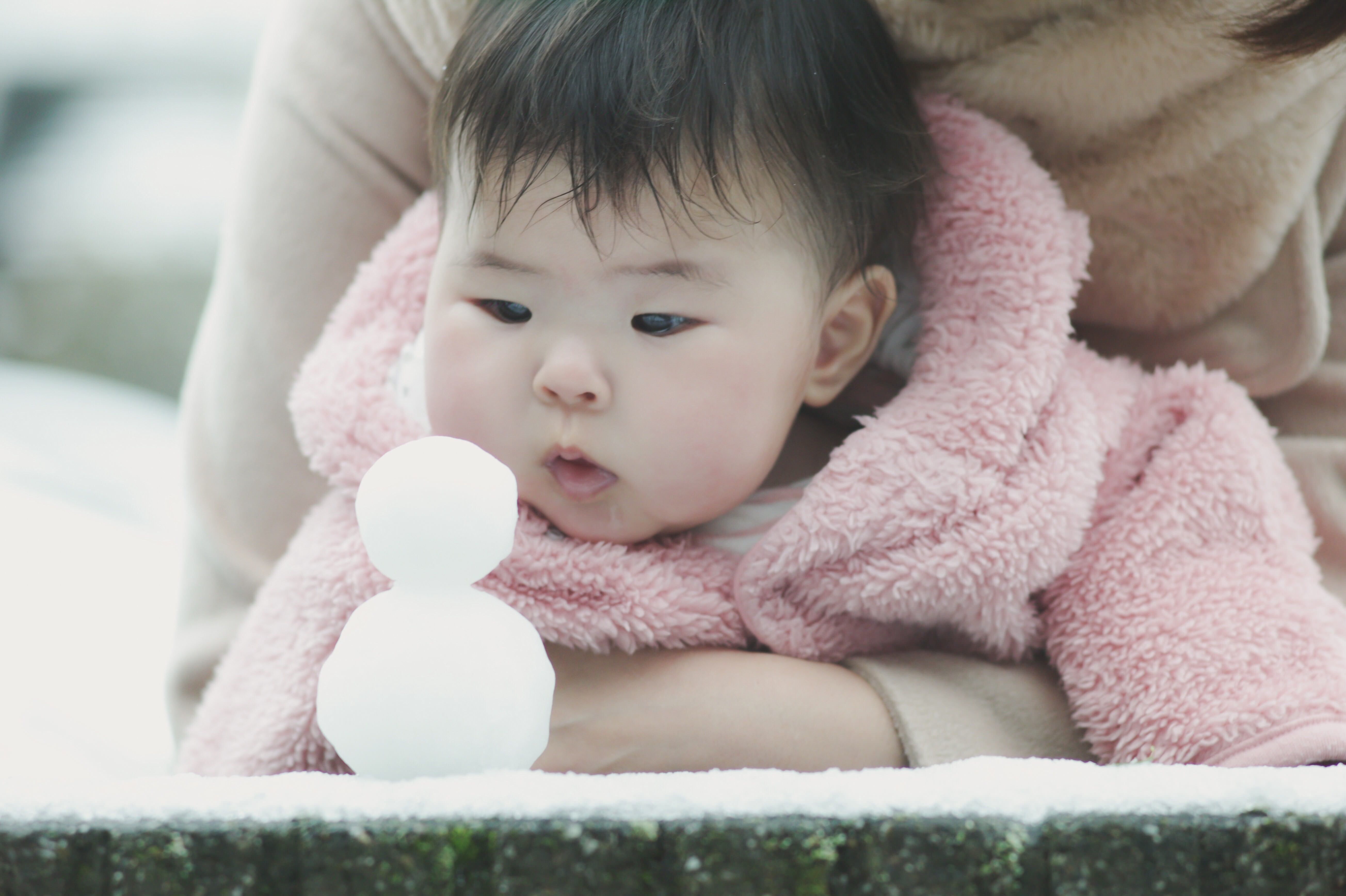 生まれて初めての雪に興味しんしんです。
