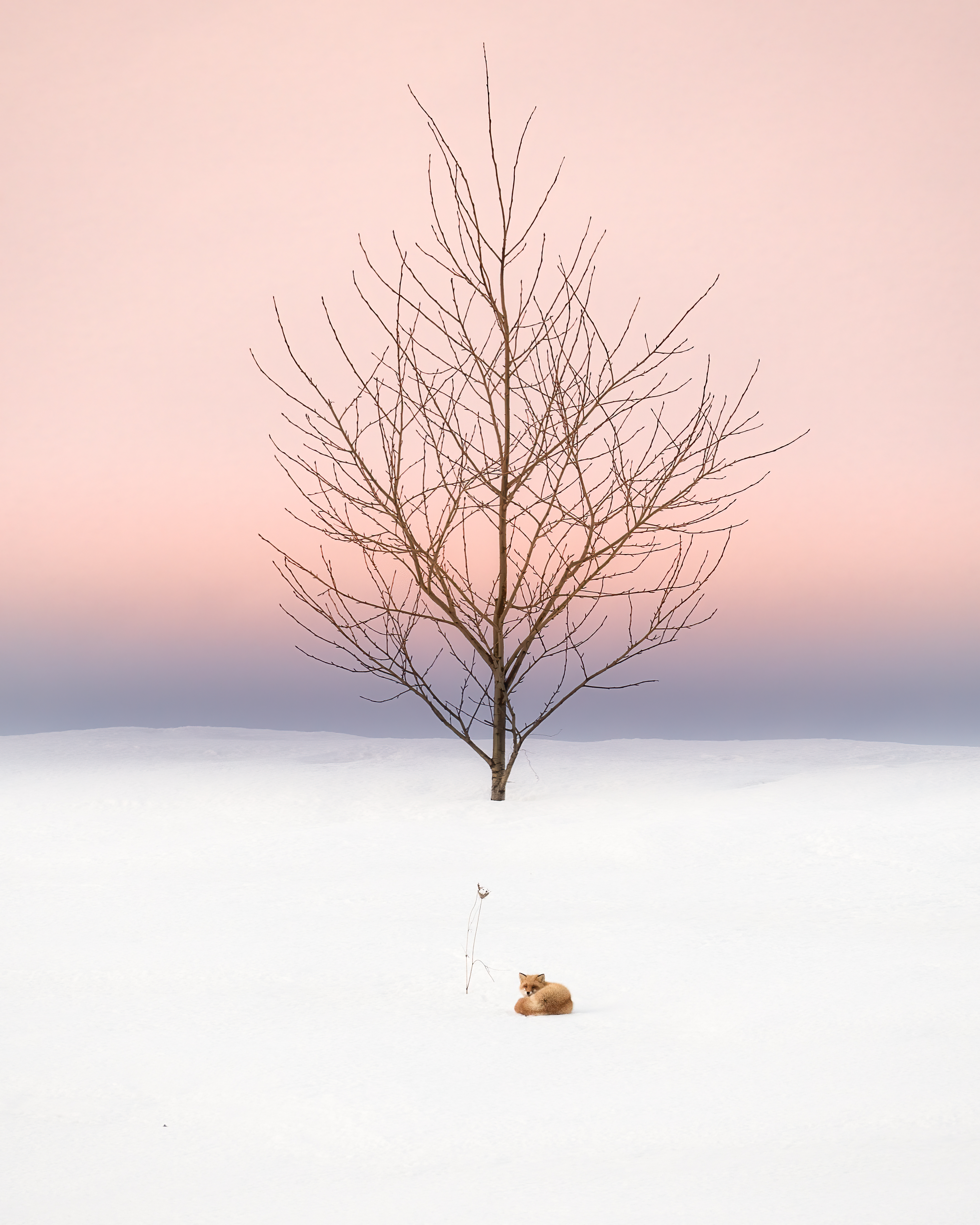 ピンクにそまる夕方の空と一匹の孤独な狐が不思議な光景でした。