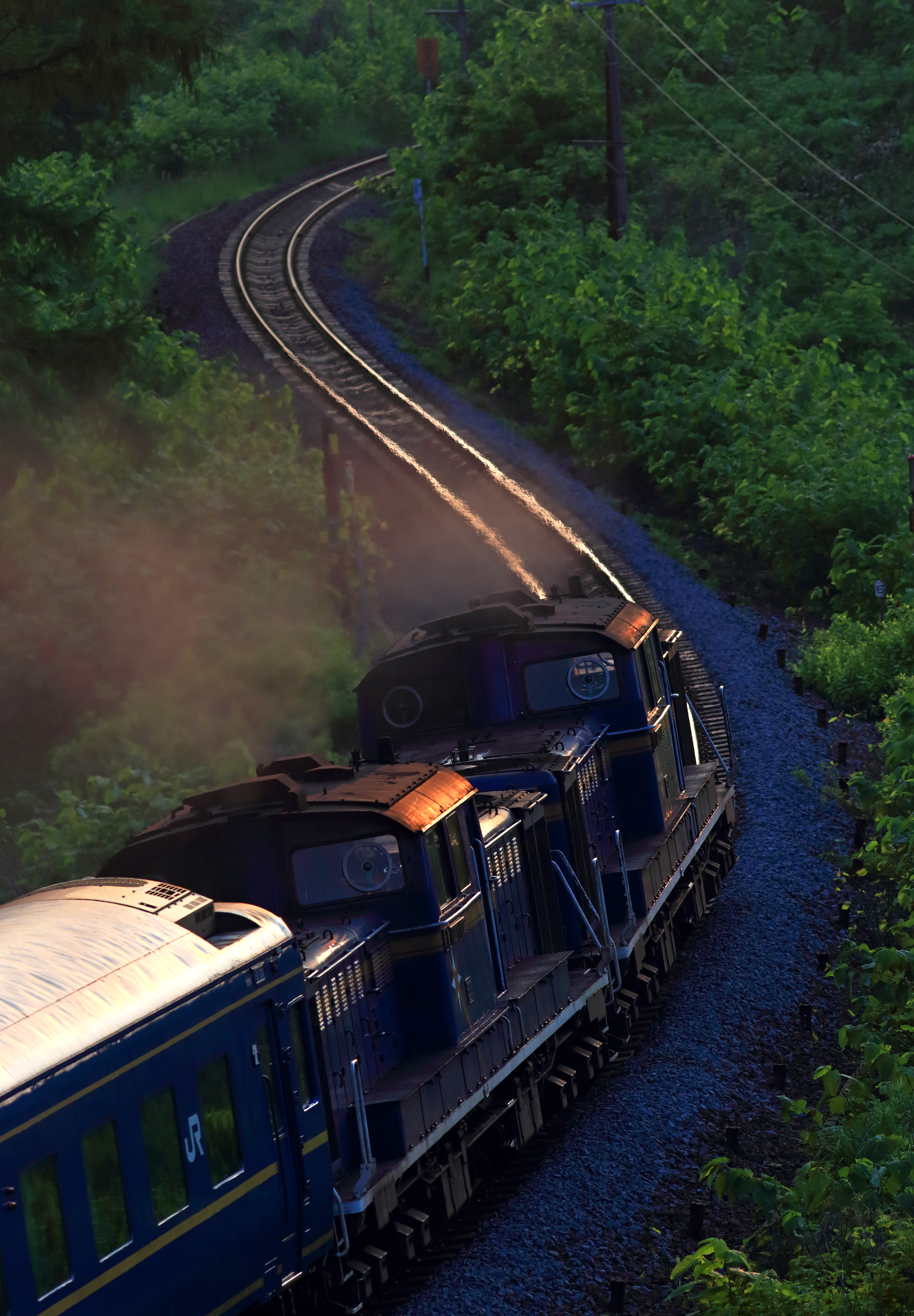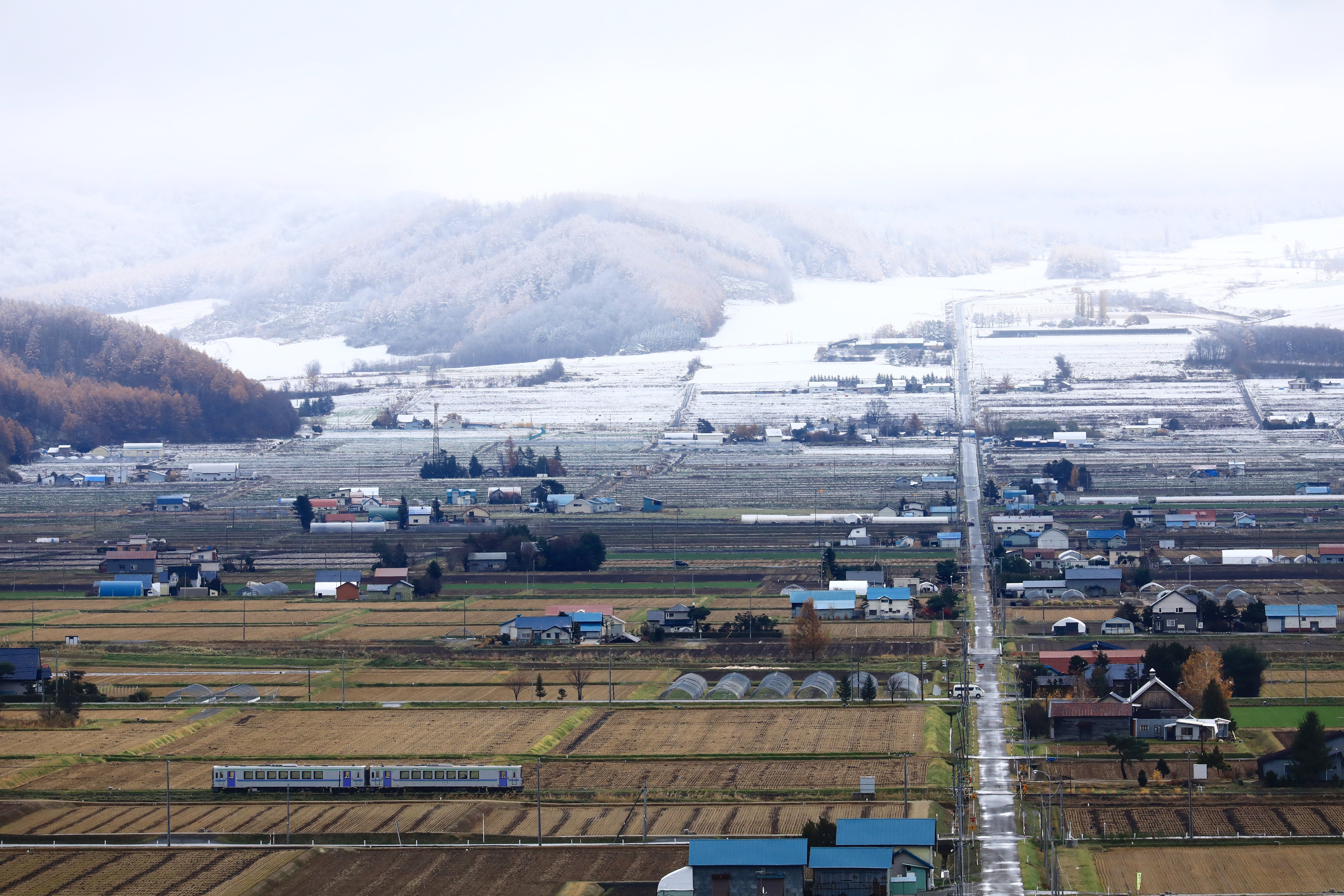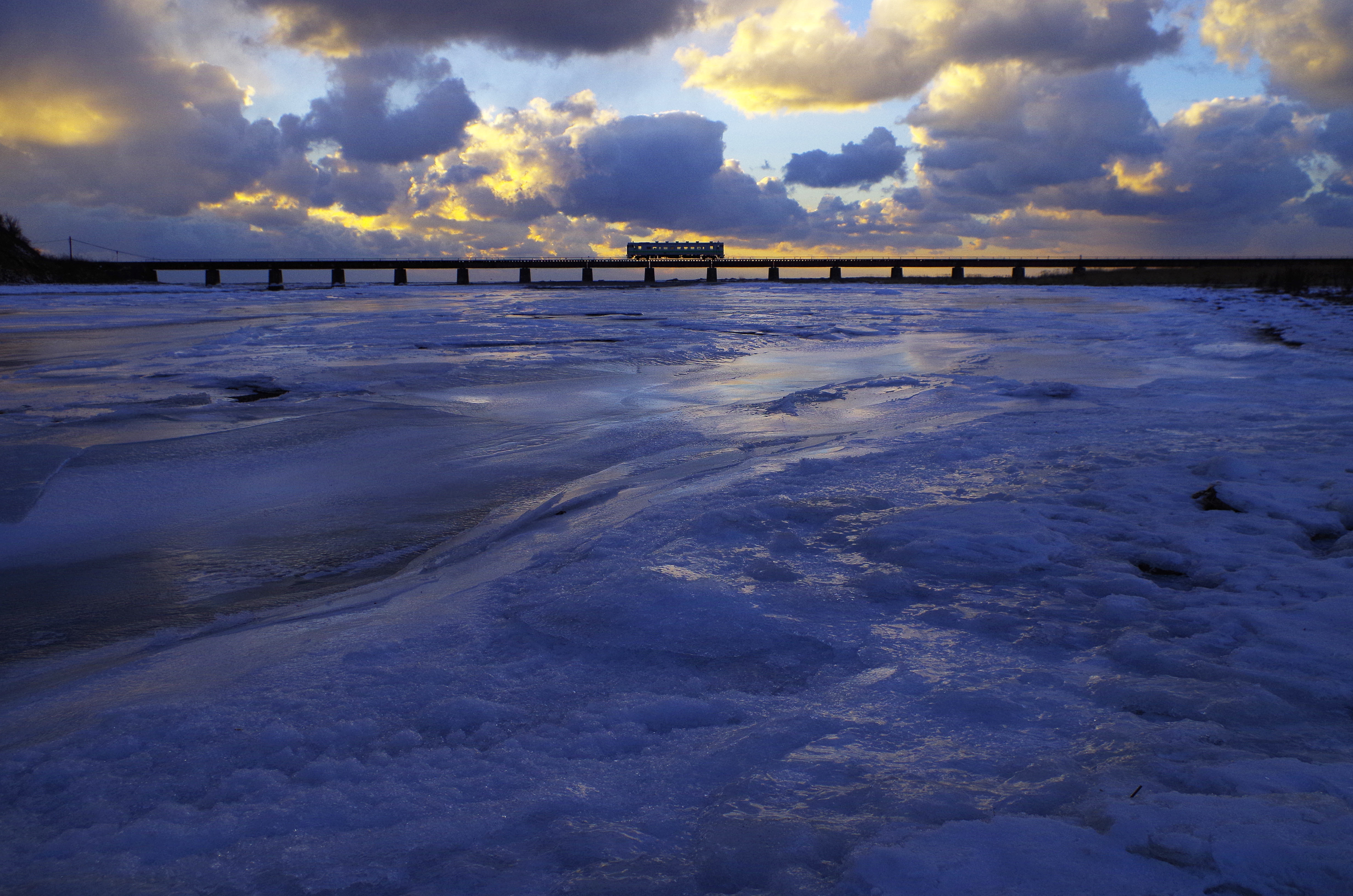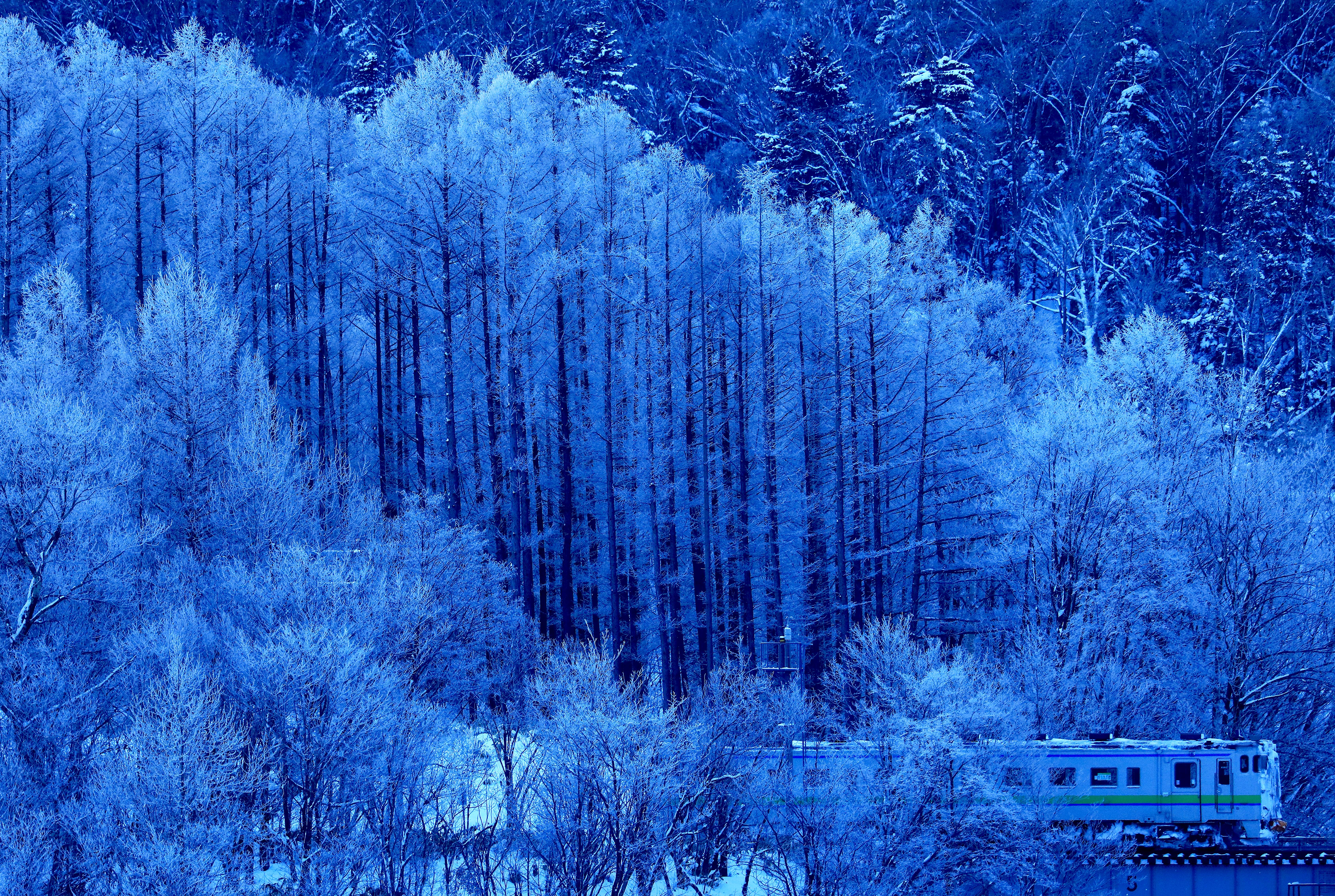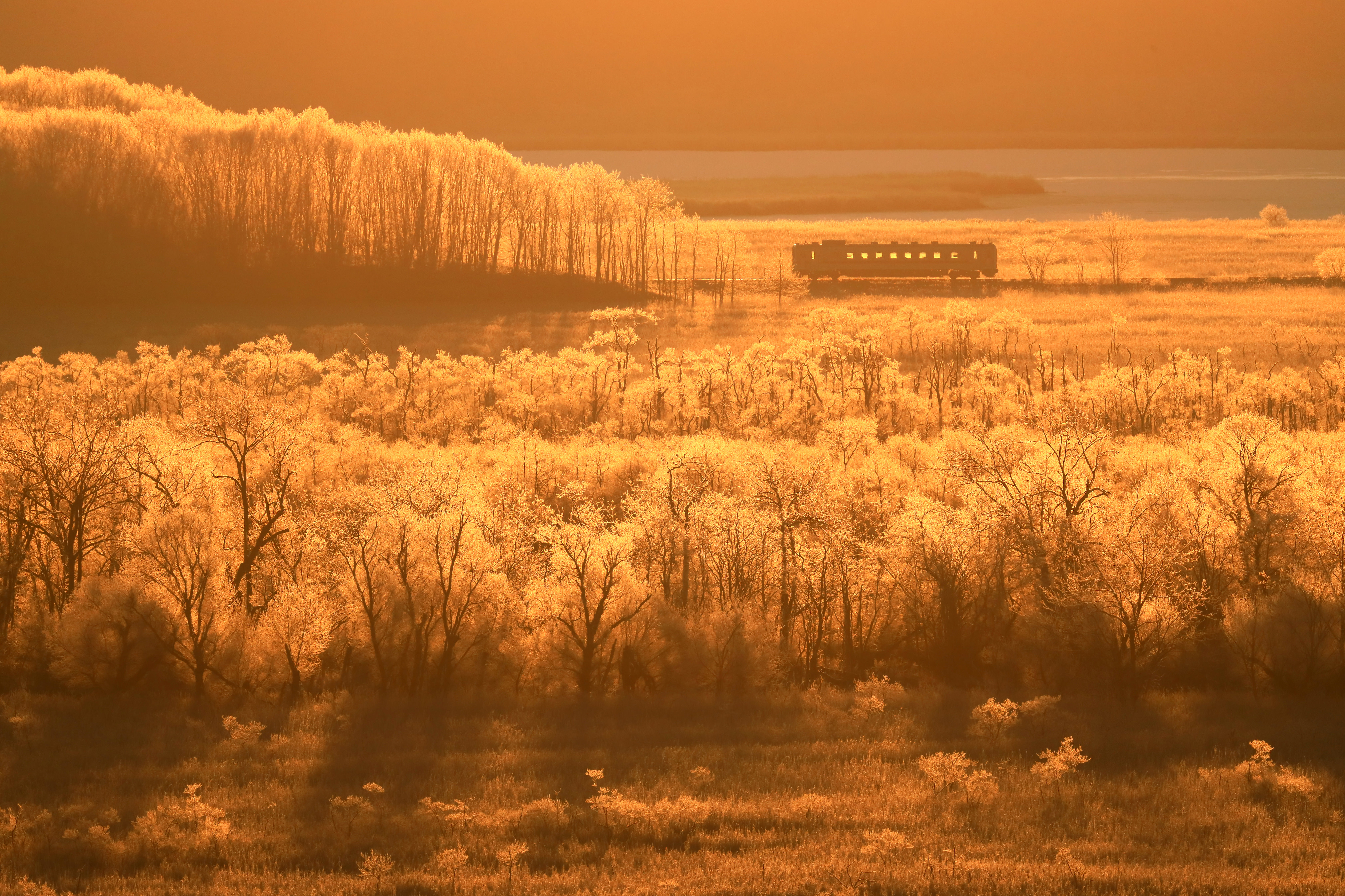 霧氷に包まれた湿原に朝陽が差し込む。列車の窓から見る景色は至福の車窓ではなかろうか…。