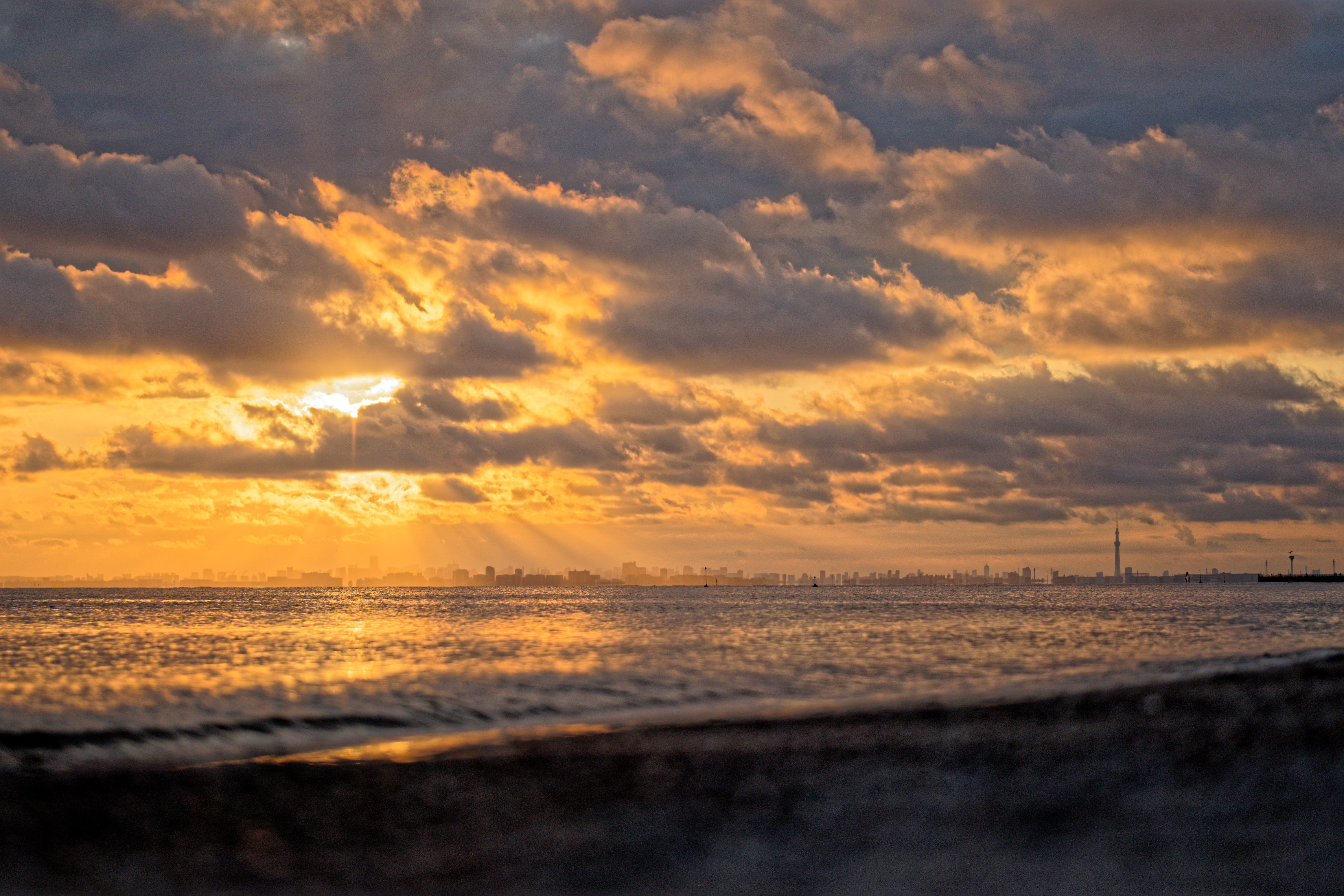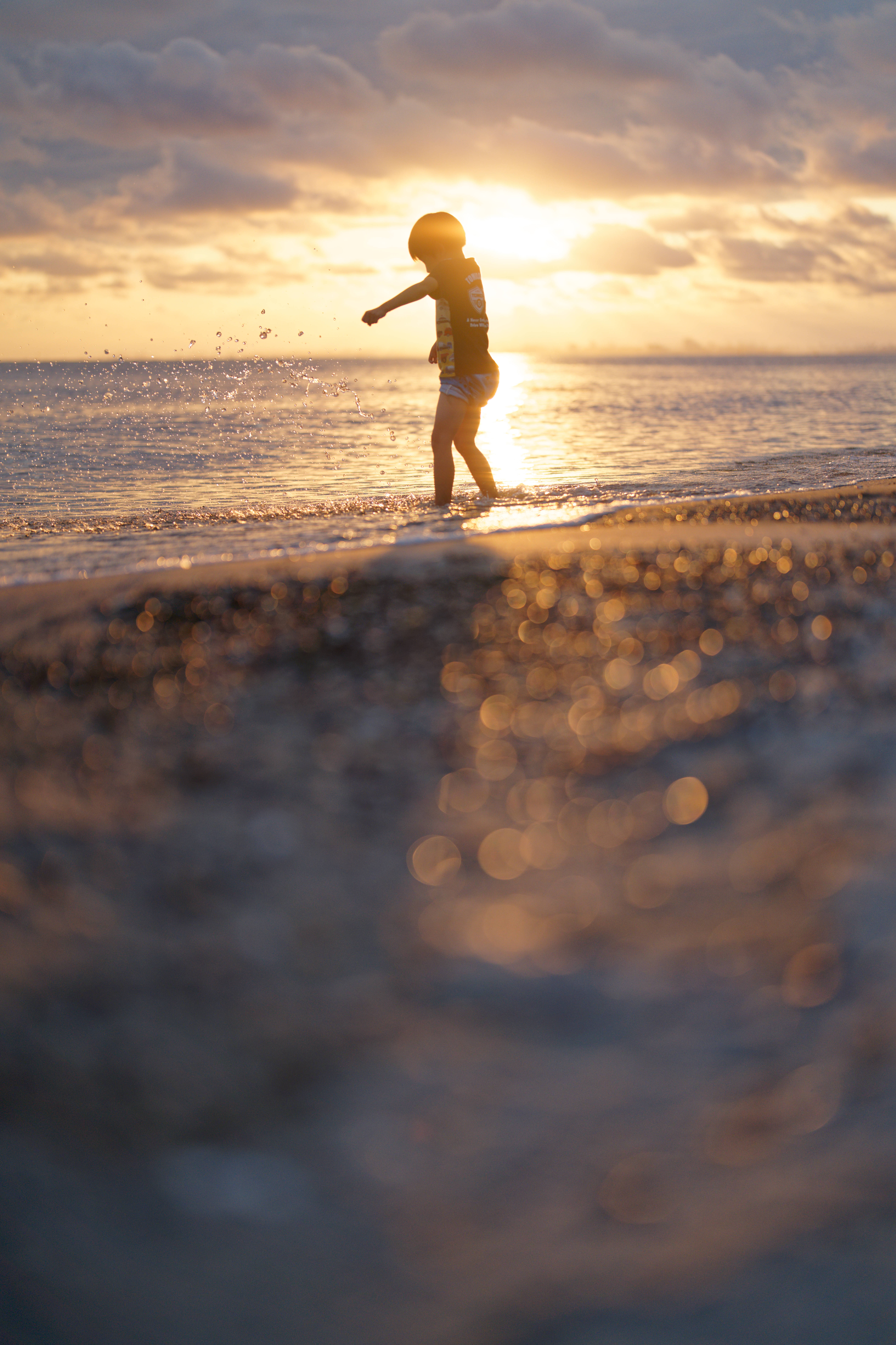 小さな子供が夕暮れの海辺で遊んでいて、とてもキラキラしてました。