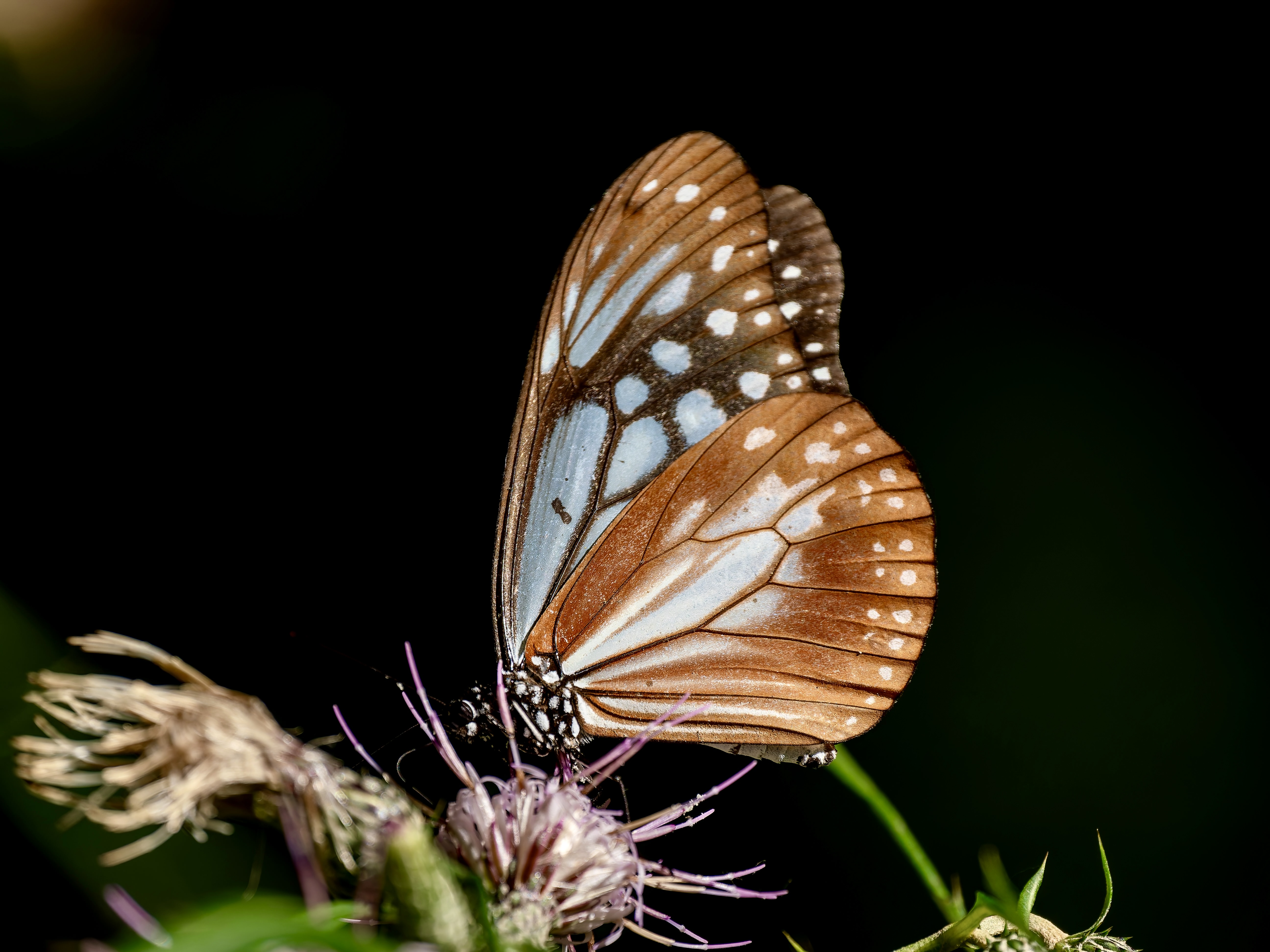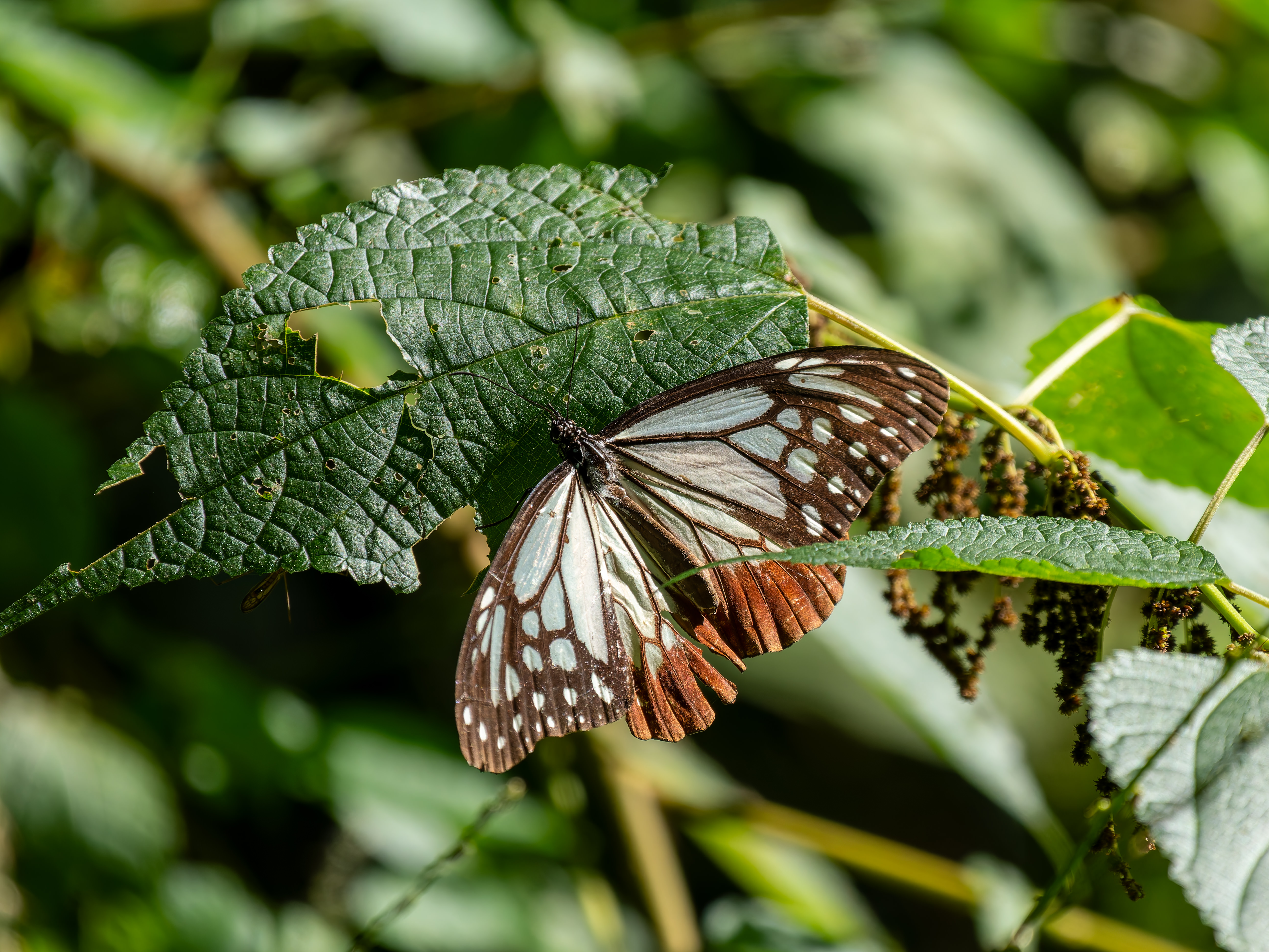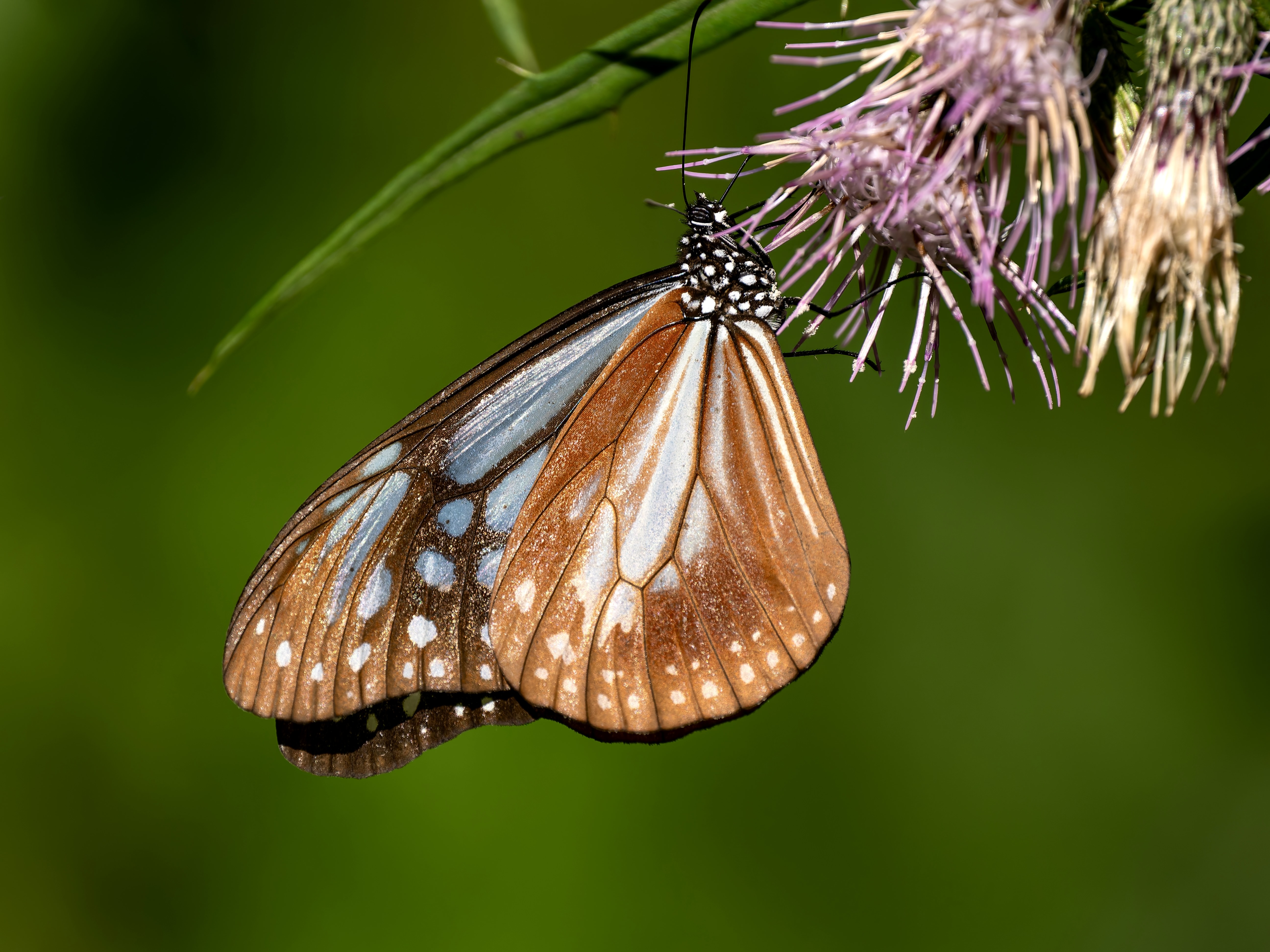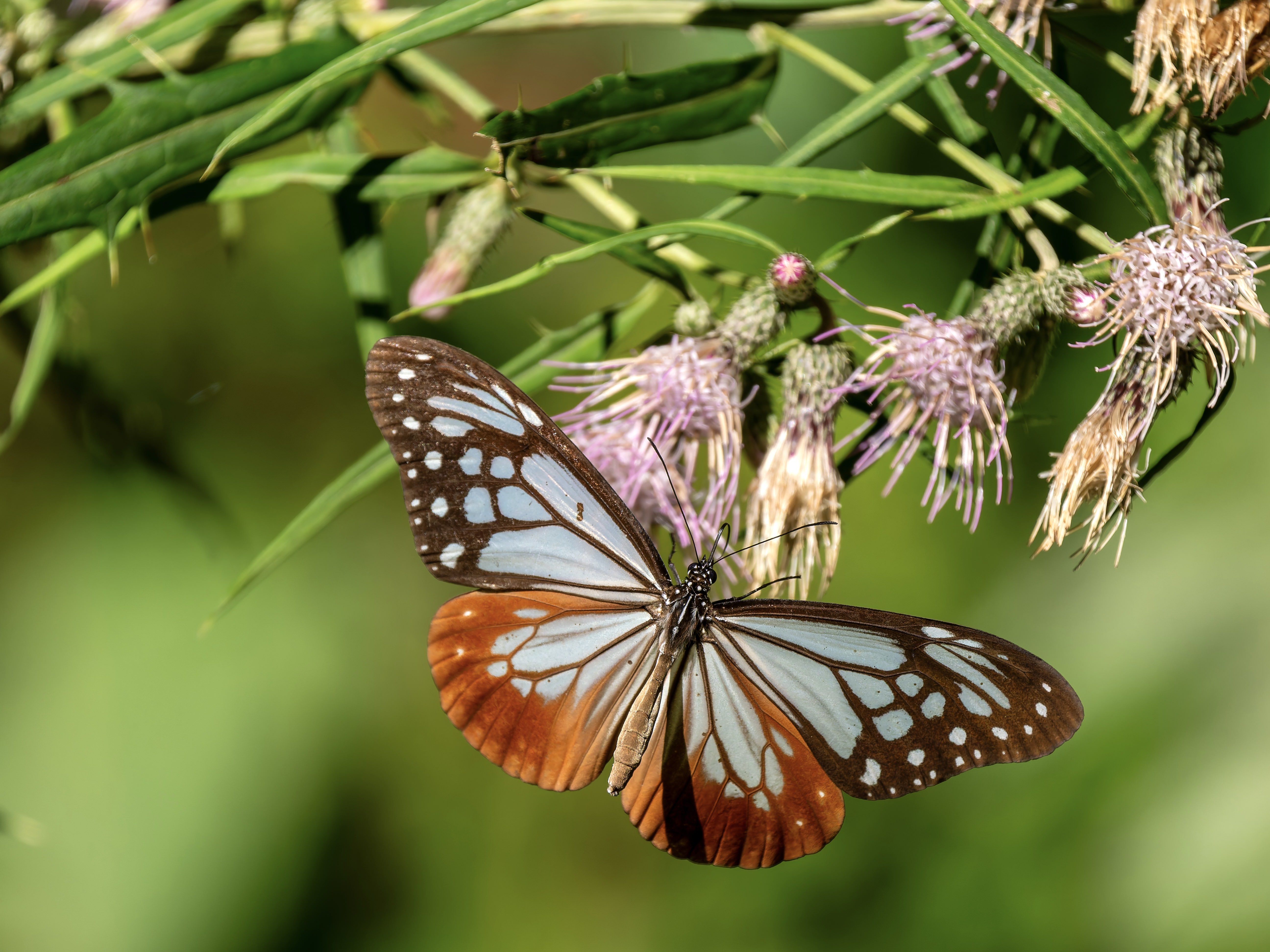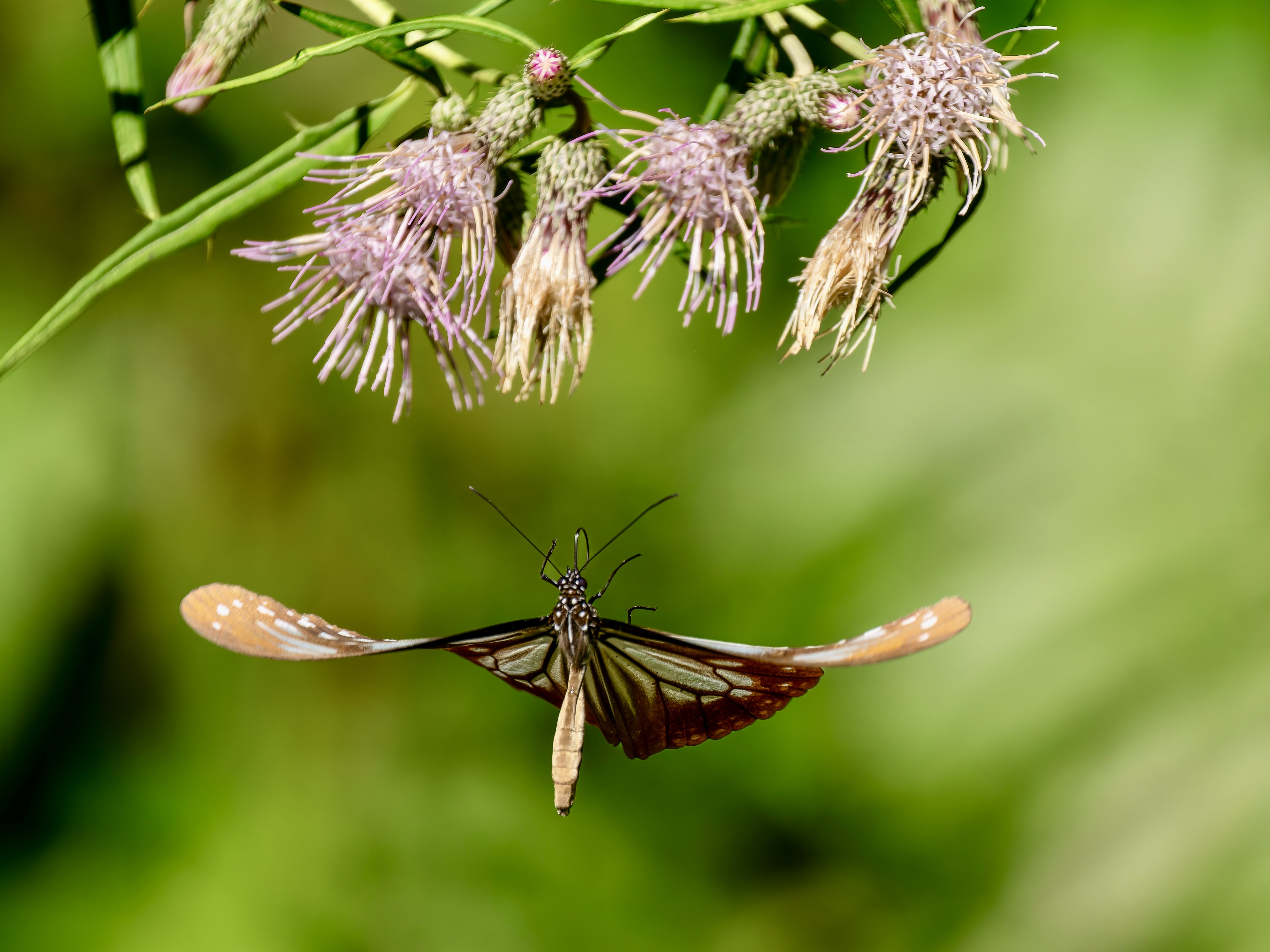 羽をしなやかに羽ばたかせながら飛ぶところを撮ってみた一枚。華奢な飛び方に見えて台湾から日本へ海を超えてやってくる渡り蝶として知られるアサギマダラ。